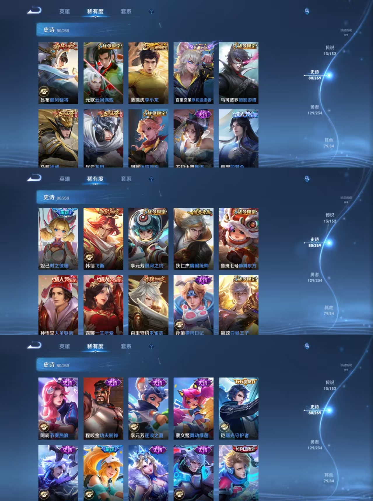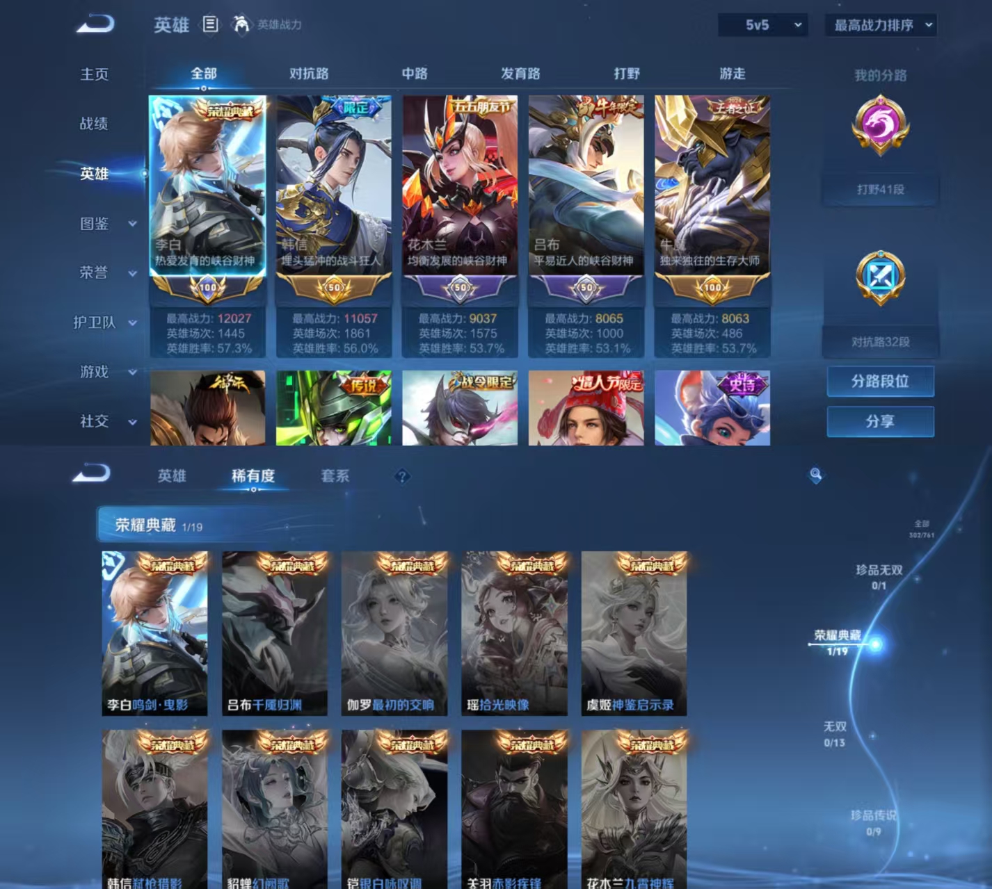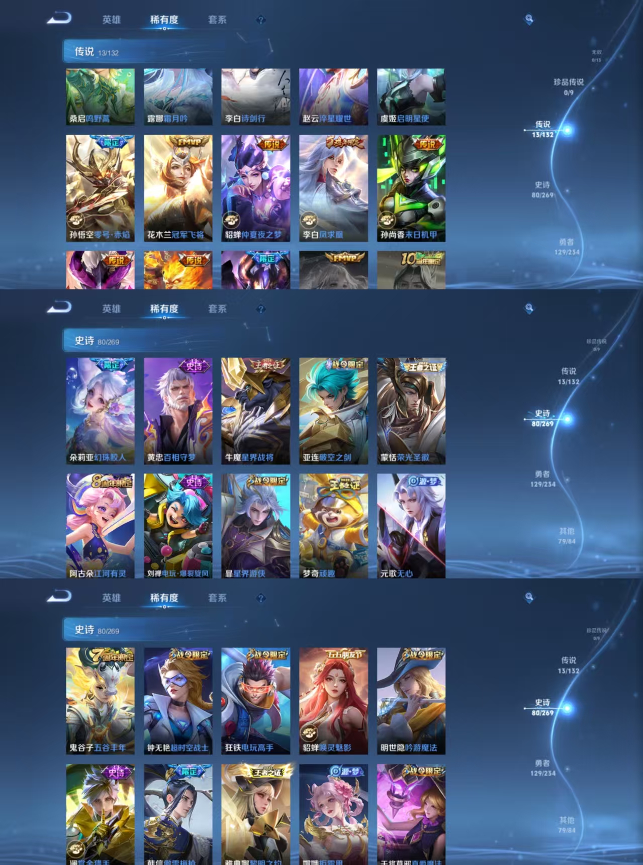 贵族等级:v8皮肤数:302情人节限定4 传说品质13 生肖限定5 荣耀典藏1 英雄数:126