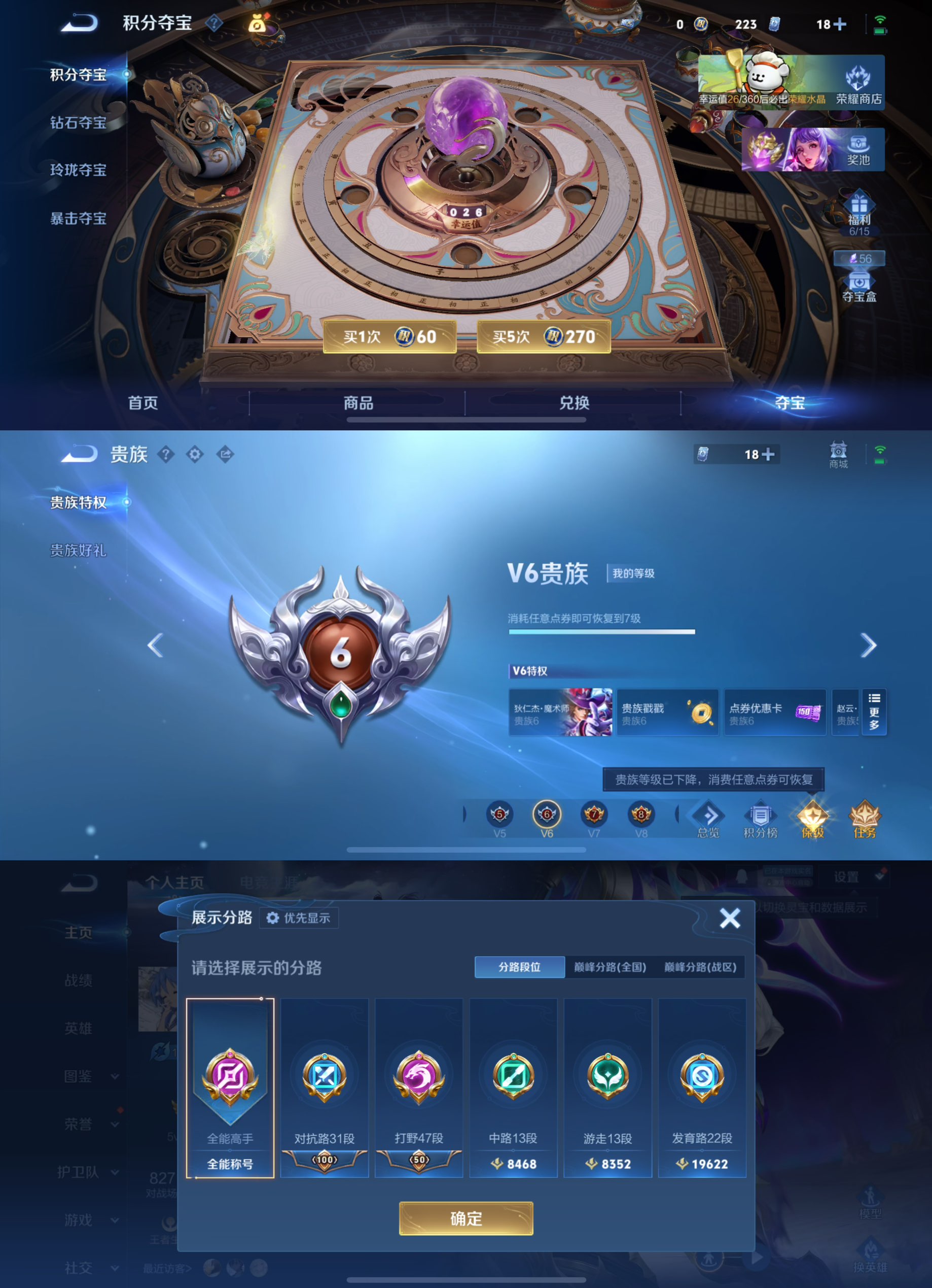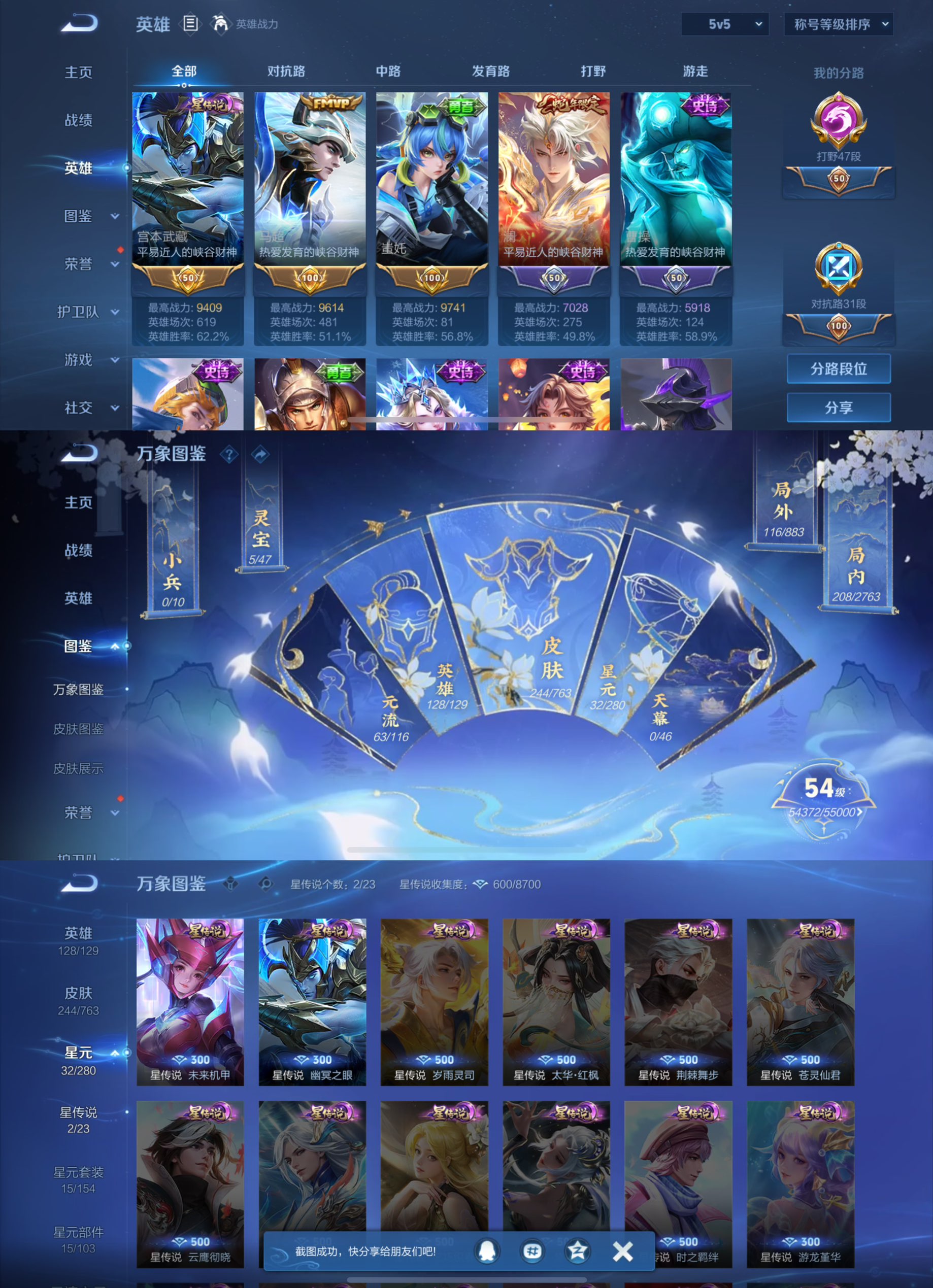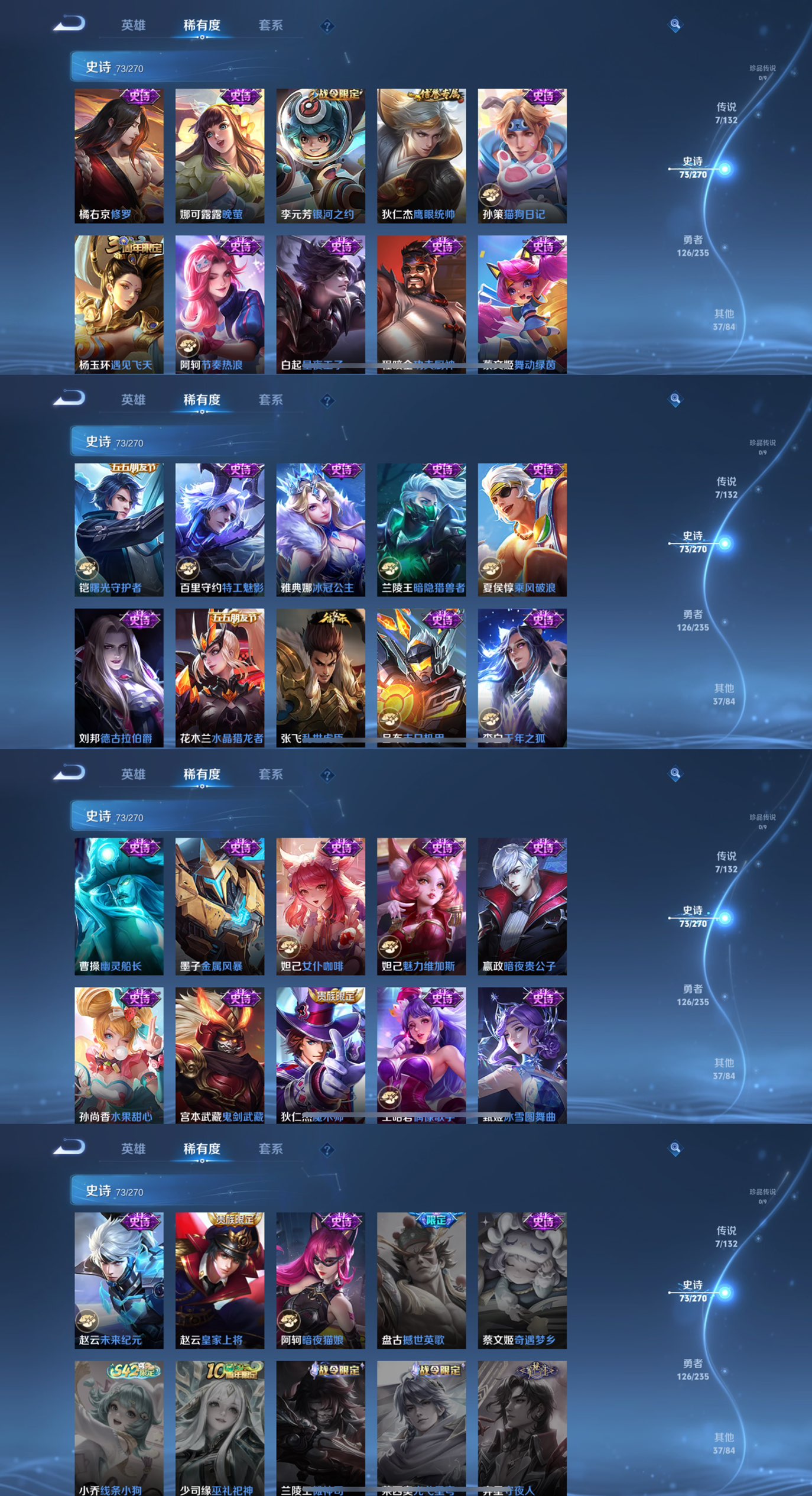 贵族等级:v7皮肤数:244传说品质7 生肖限定2 荣耀典藏1 英雄数:128