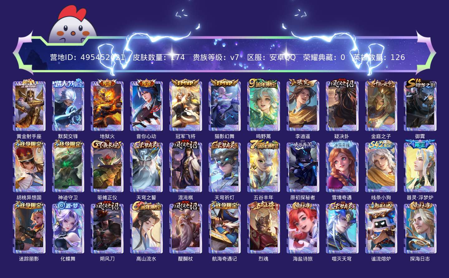 贵族等级:v7皮肤数:174传说品质8 情人节限定1 生肖限定1 英雄数:126