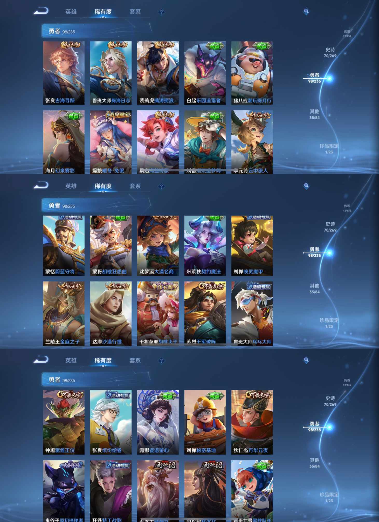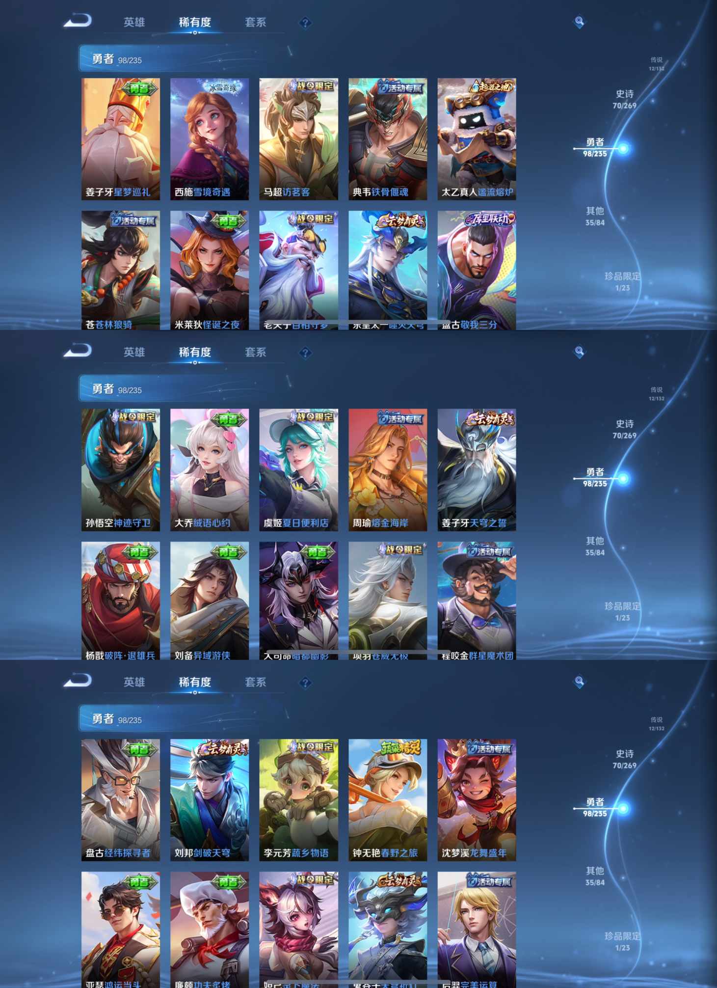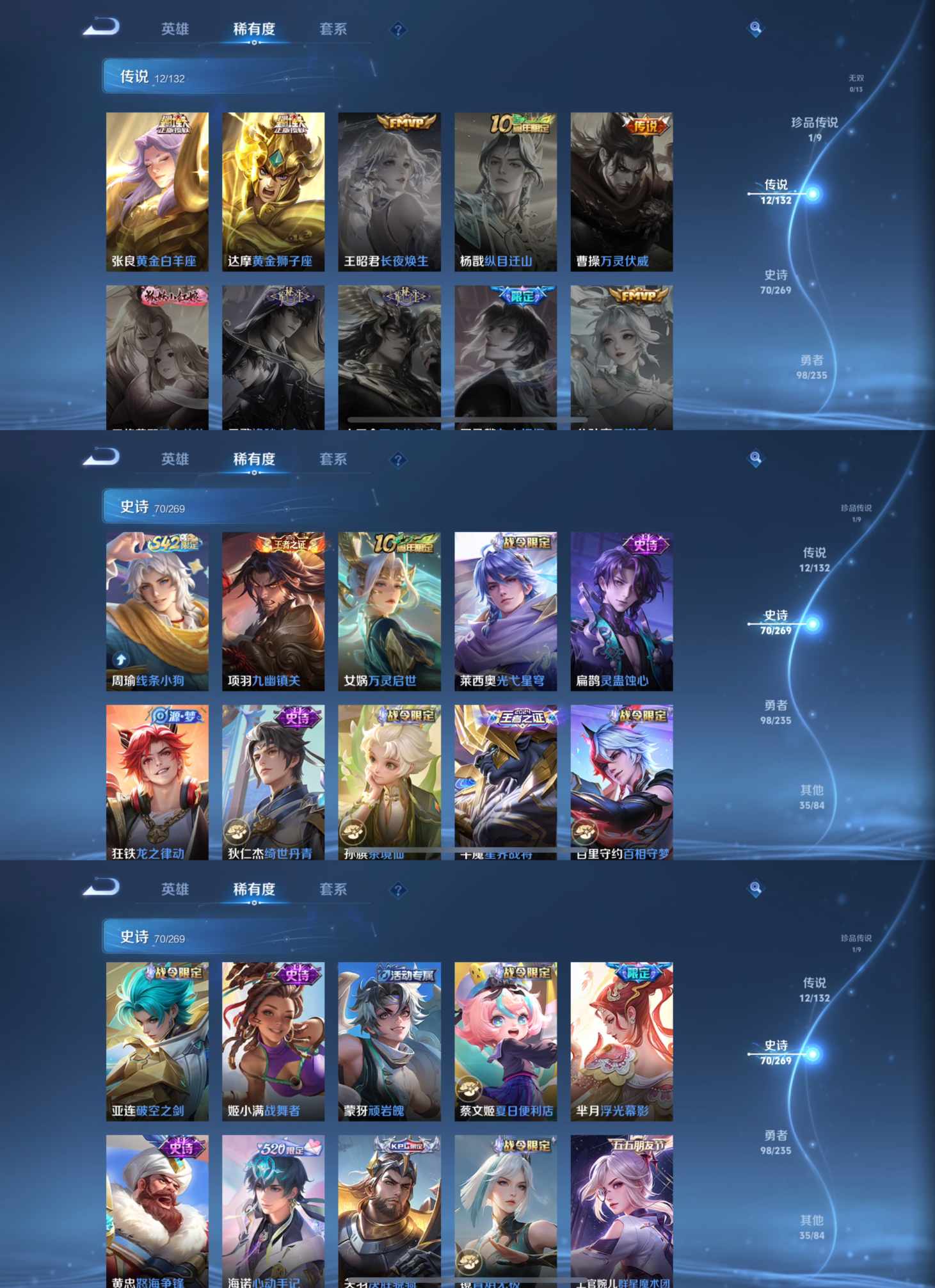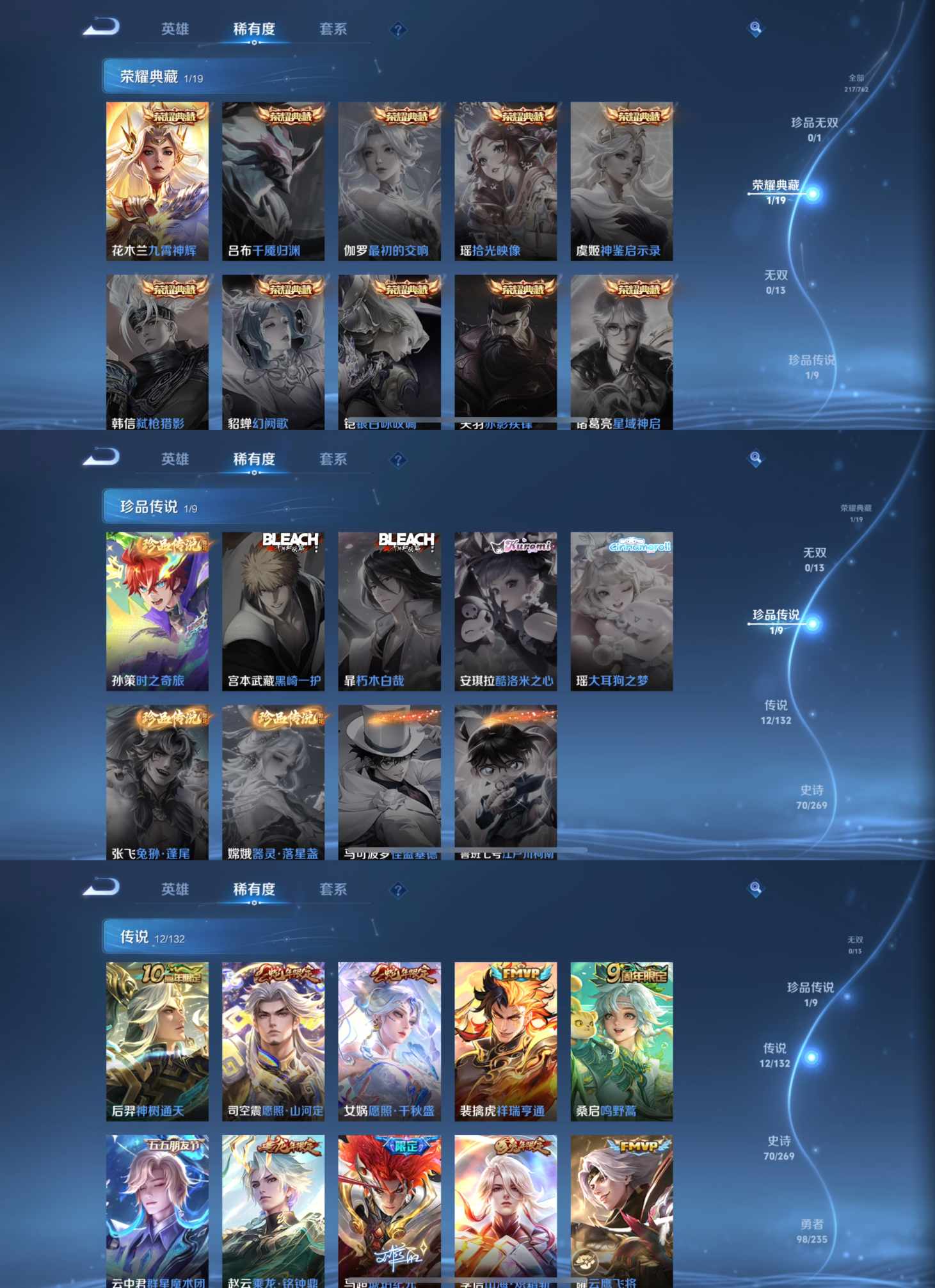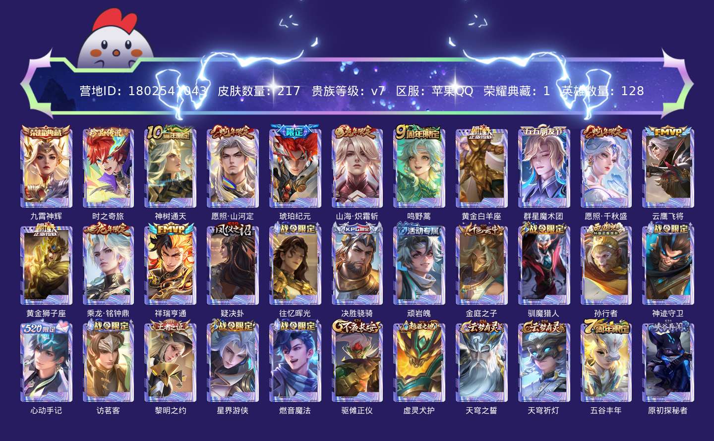 贵族等级:v7皮肤数:217传说品质12 生肖限定5 荣耀典藏1 珍品传说1 英雄数:128