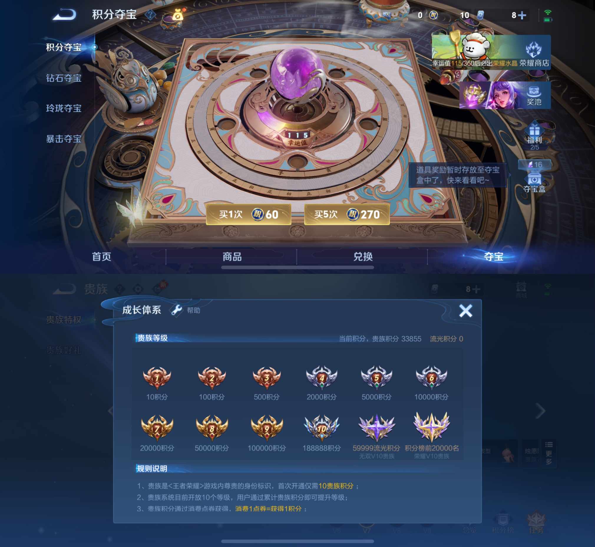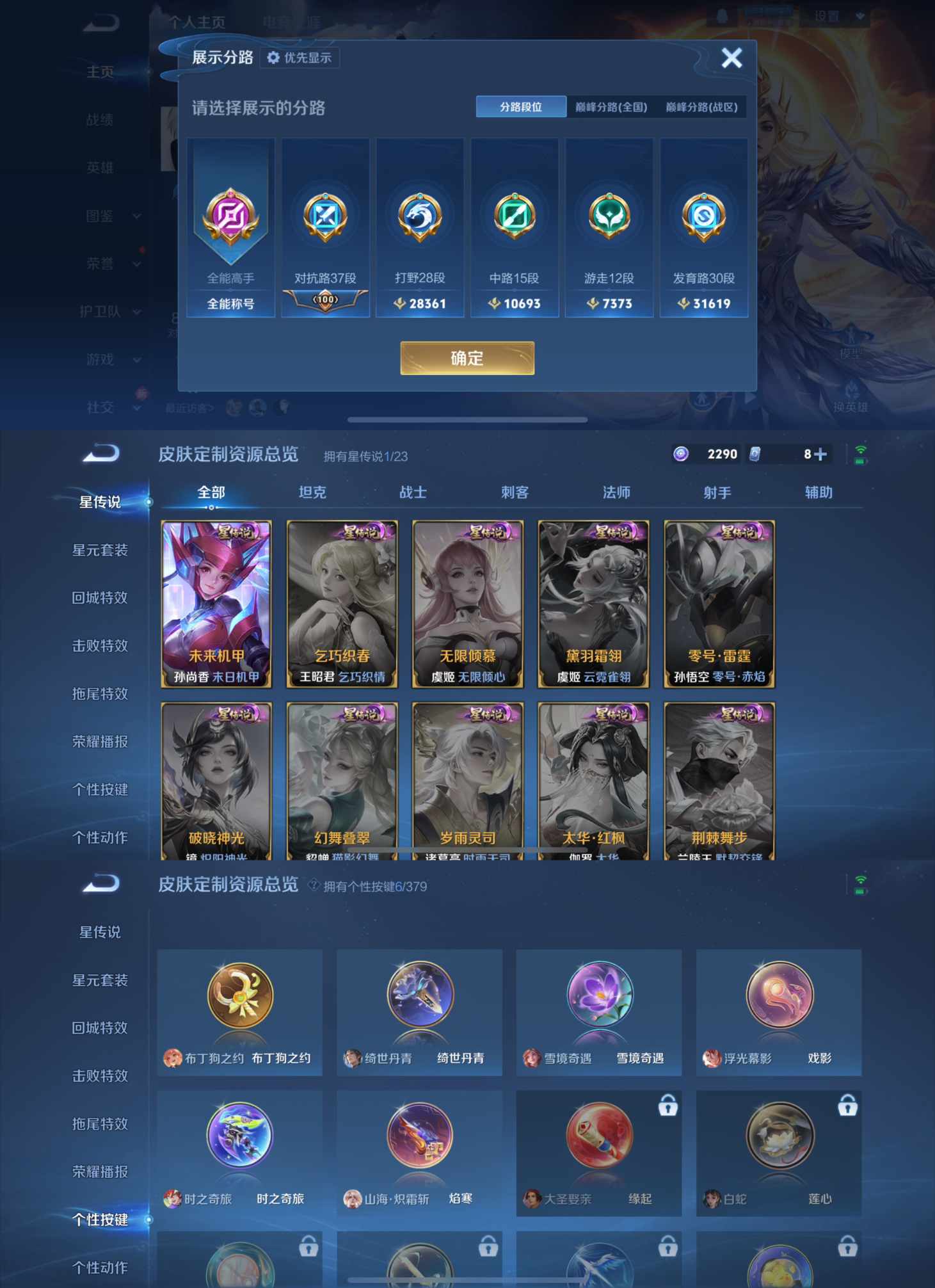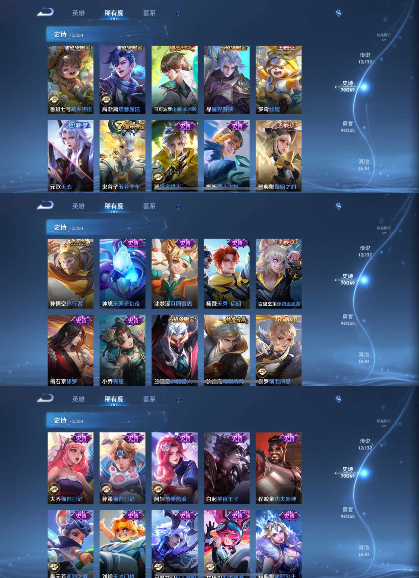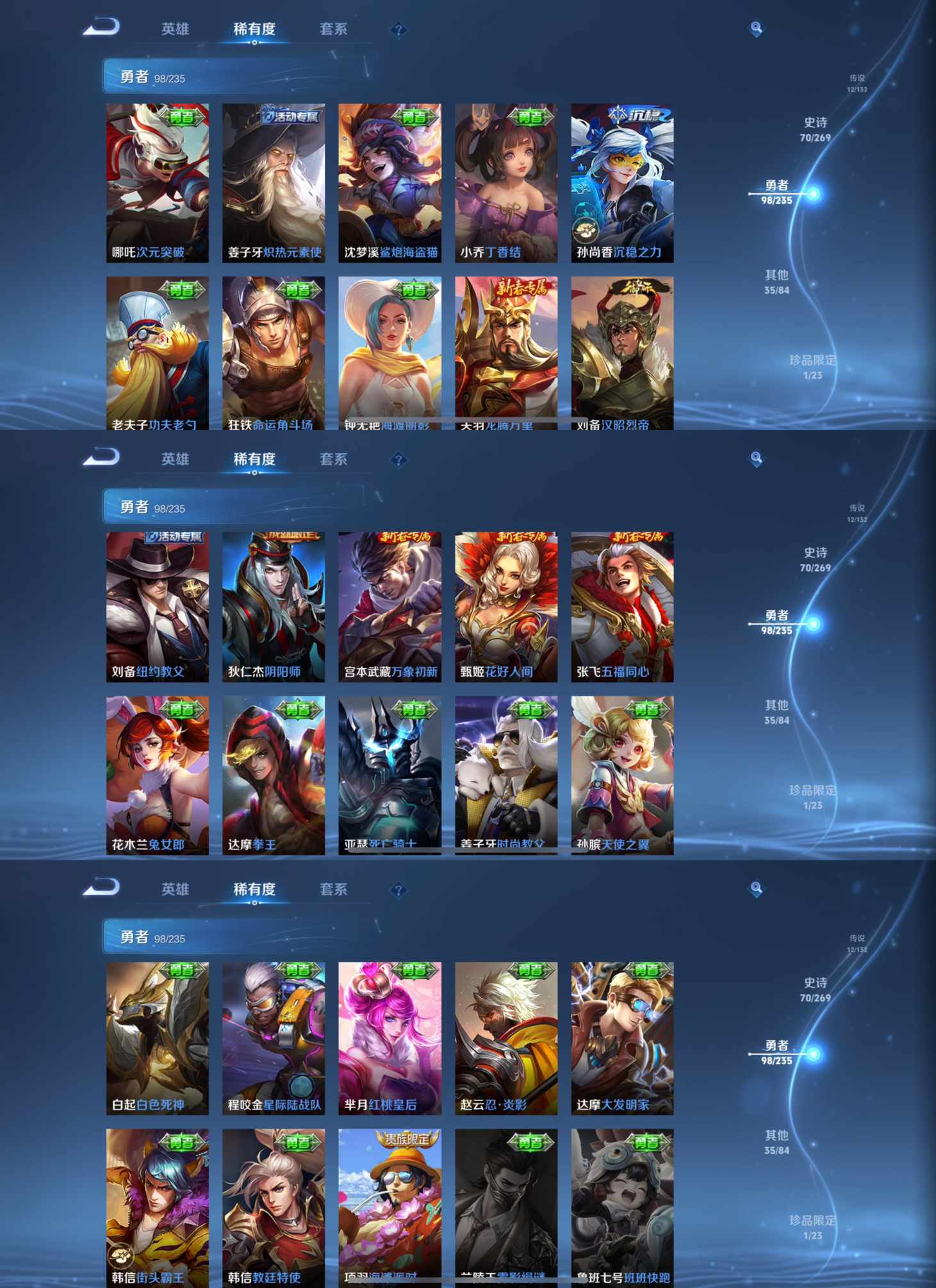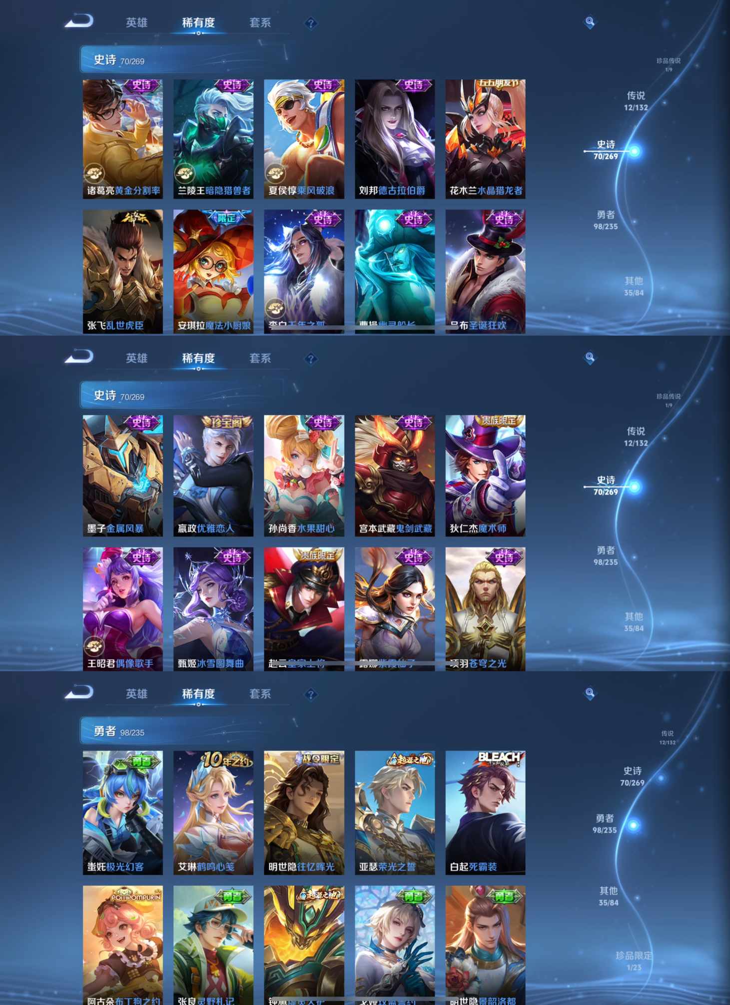 贵族等级:v7皮肤数:217传说品质12 生肖限定5 荣耀典藏1 珍品传说1 英雄数:128