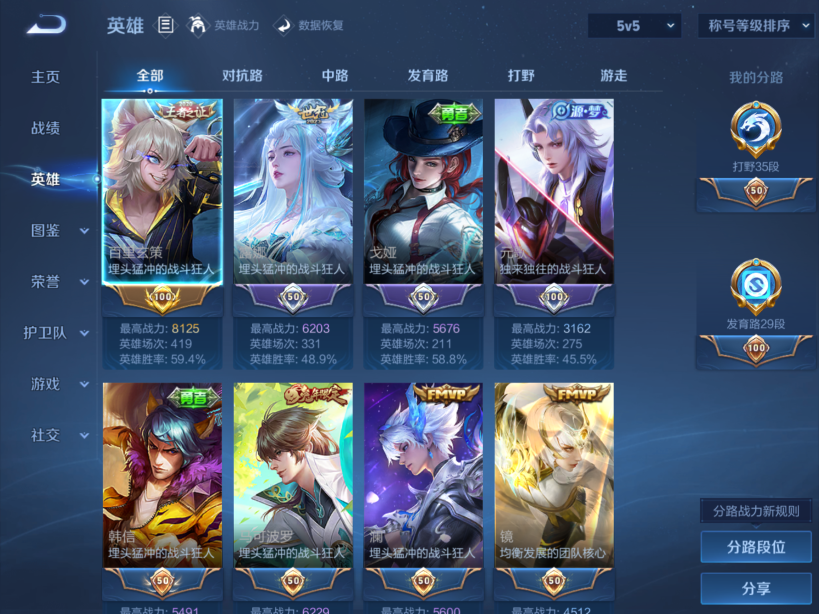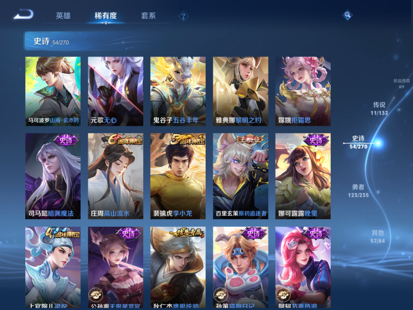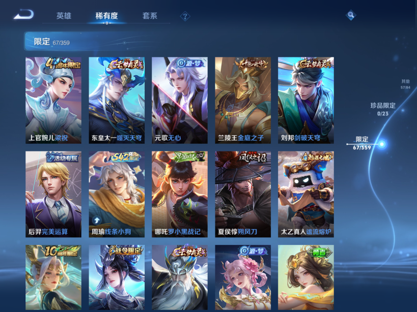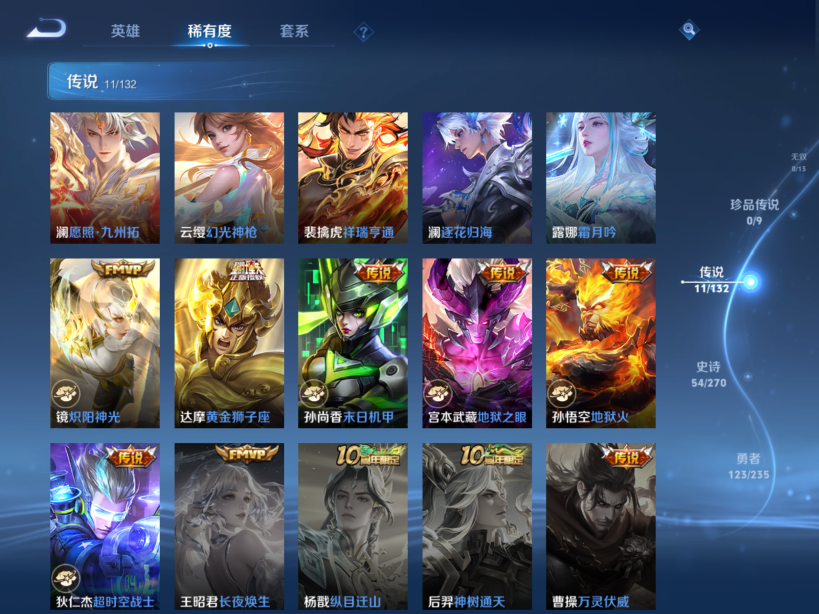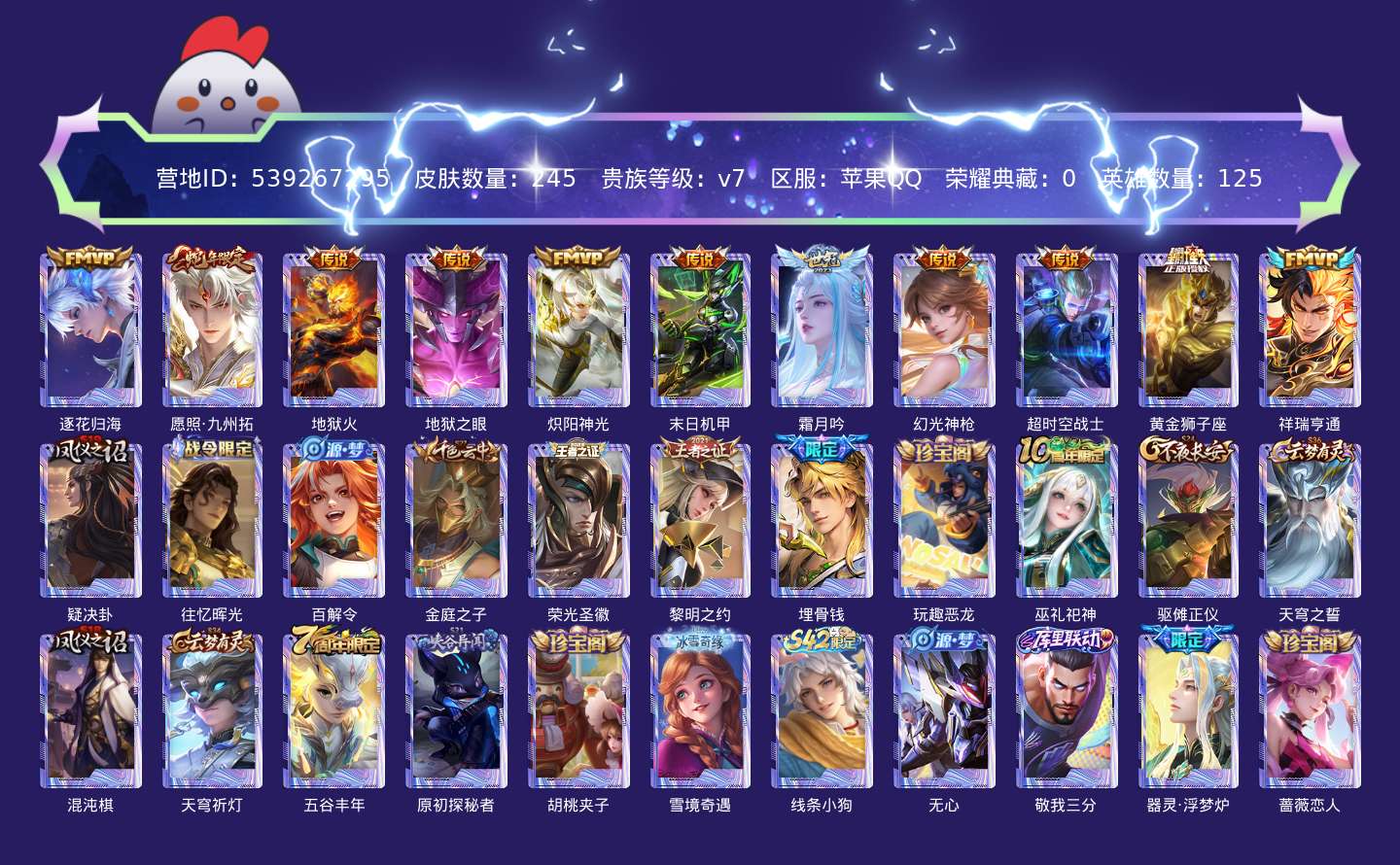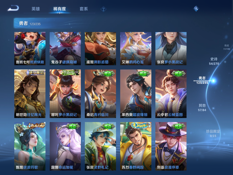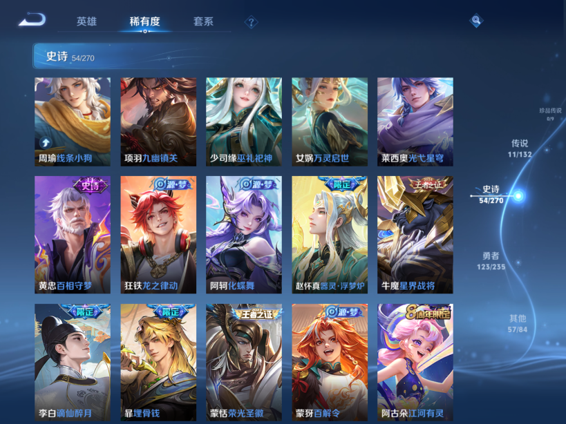 贵族等级:v7皮肤数:245传说品质11 生肖限定2 英雄数:125