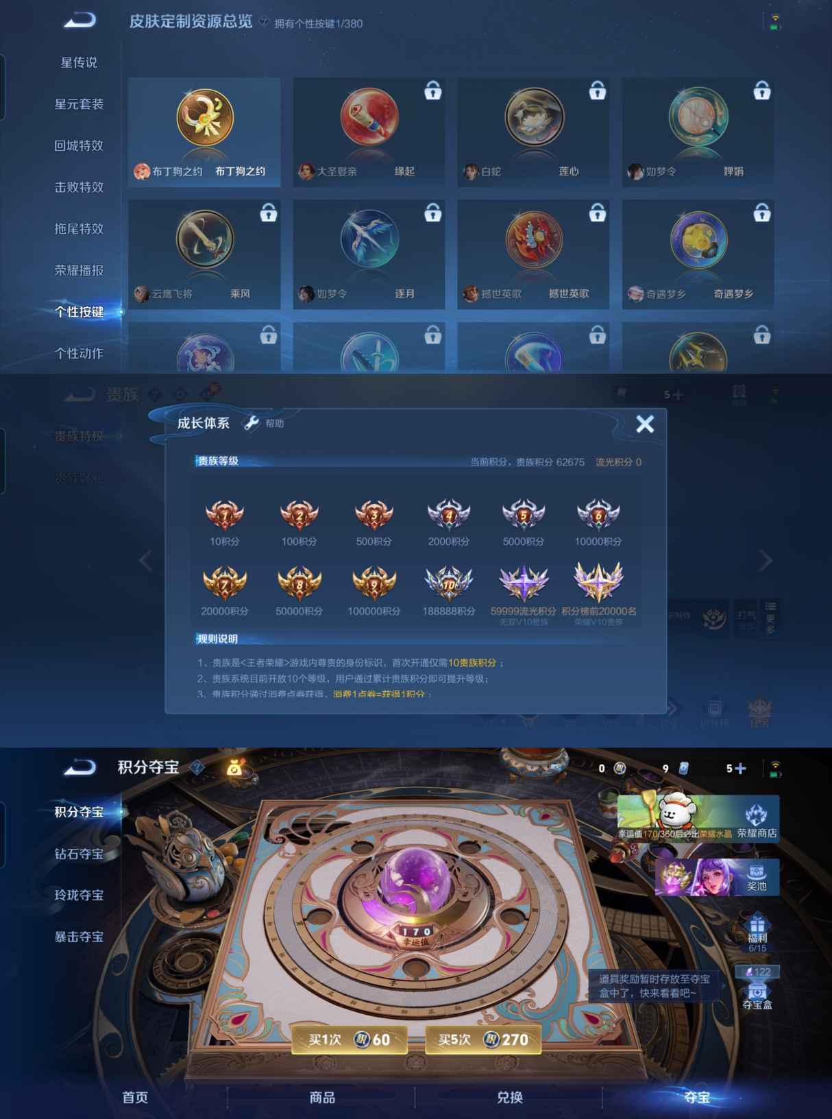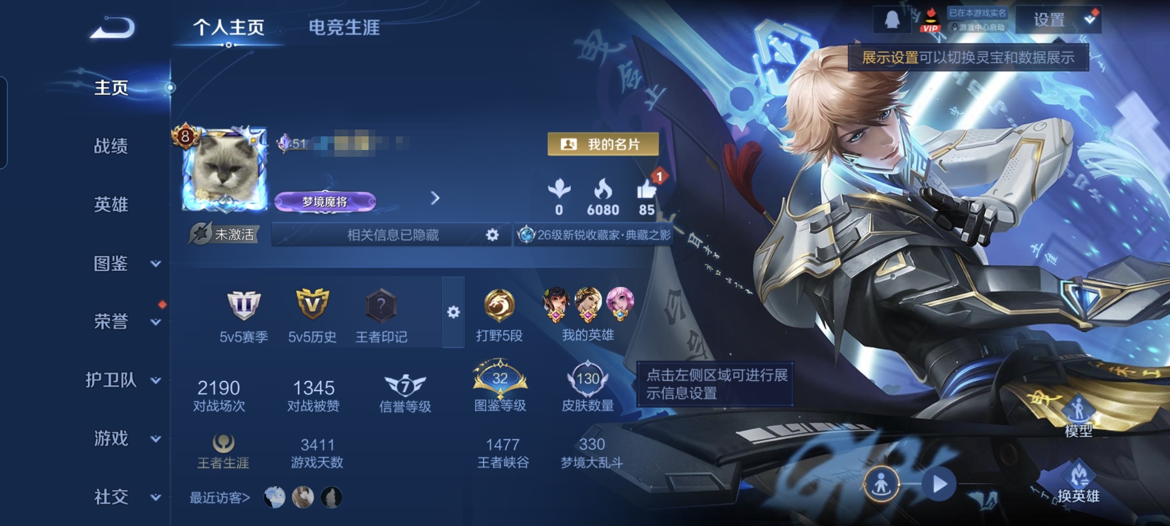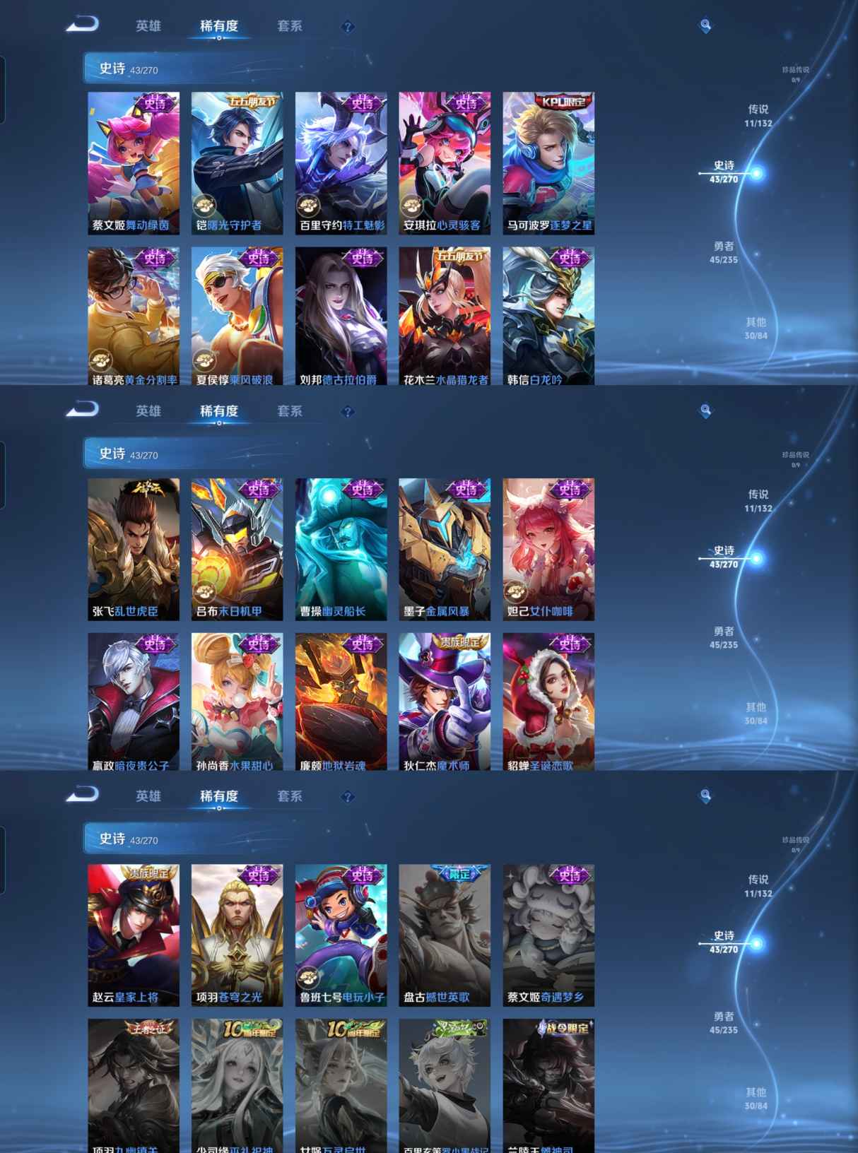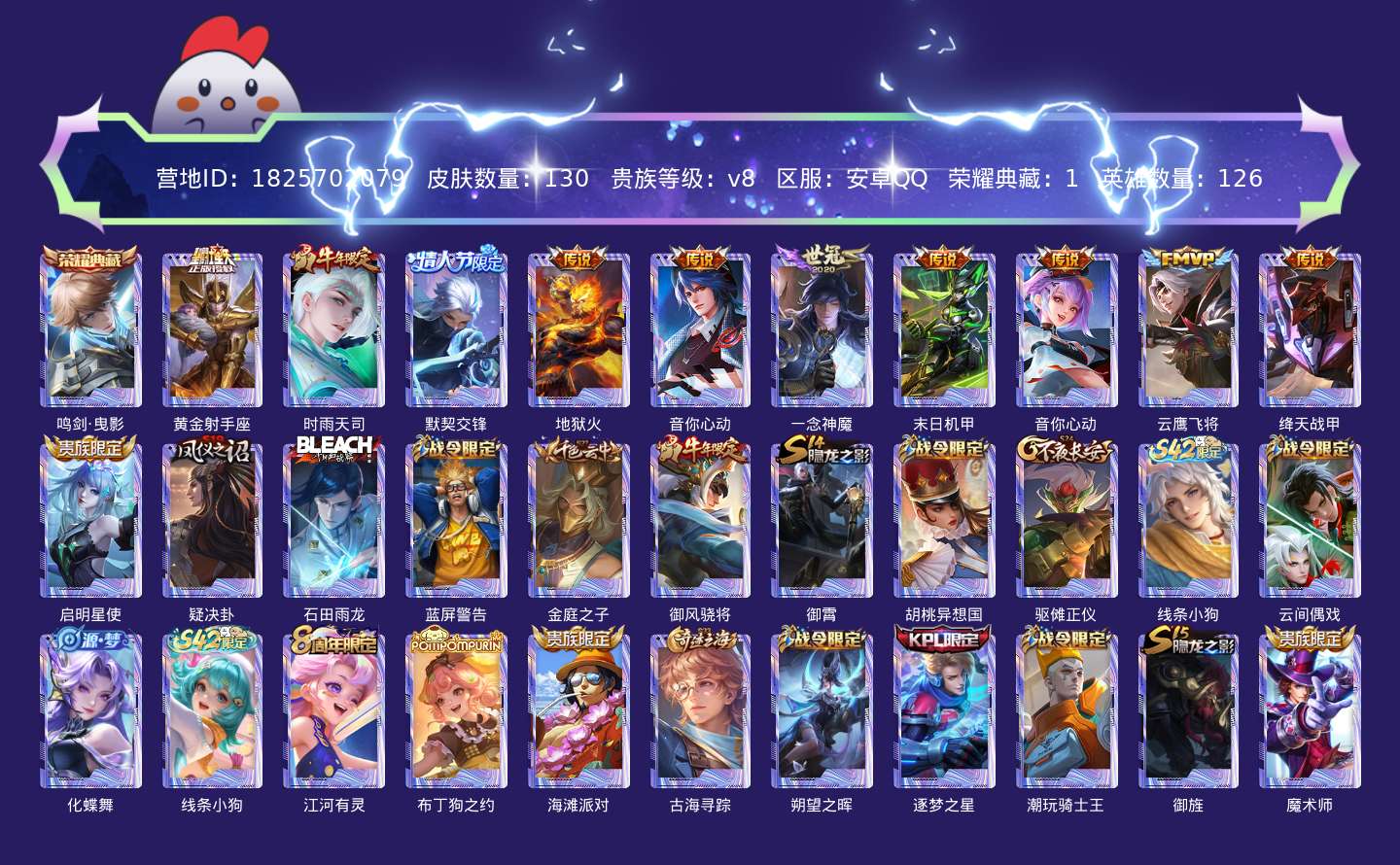贵族等级:v8皮肤数:130传说品质11 生肖限定2 情人节限定1 荣耀典藏1 英雄数:126