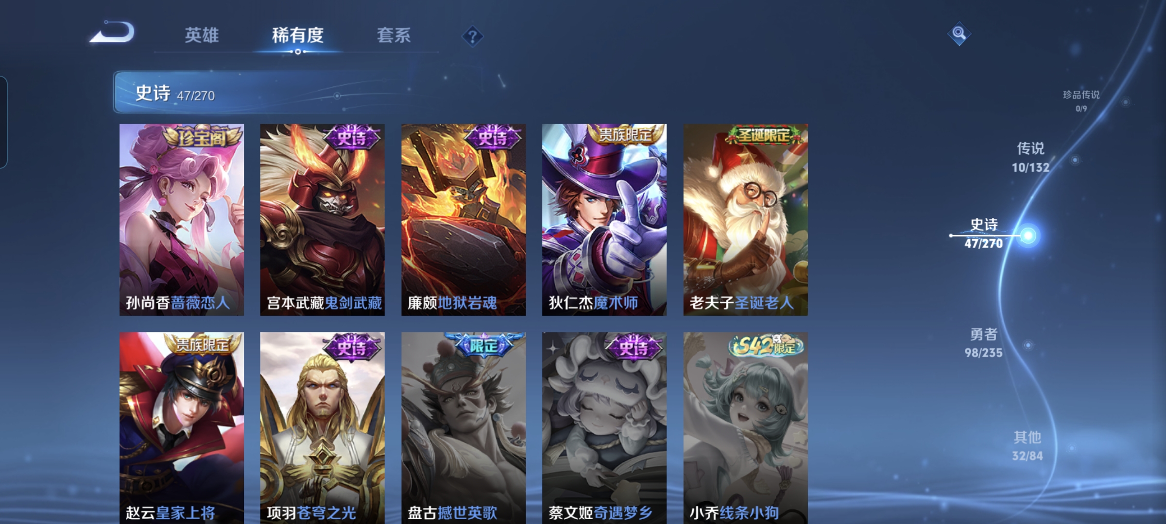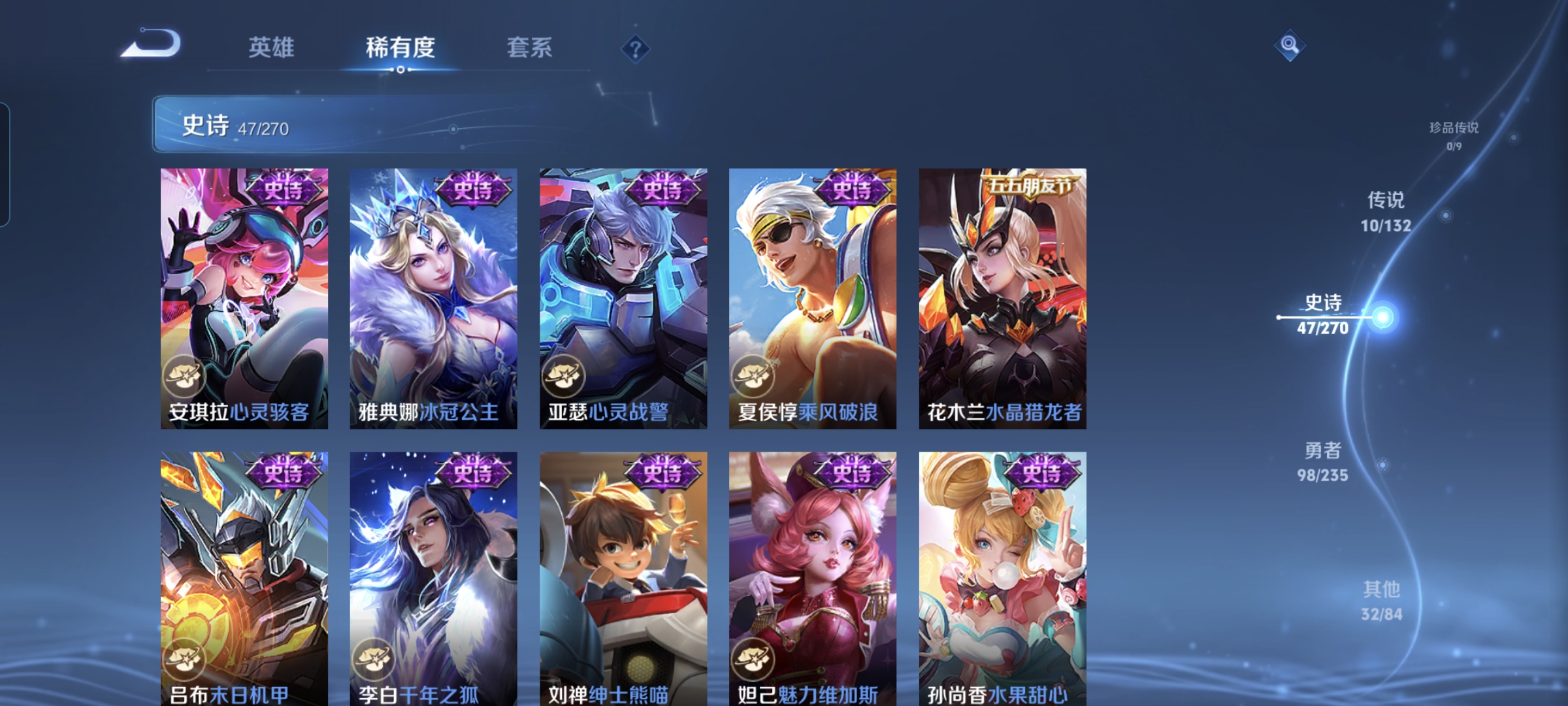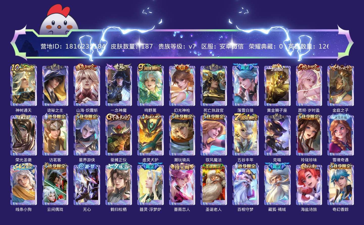 贵族等级:v7皮肤数:187传说品质10 生肖限定2 英雄数:126
