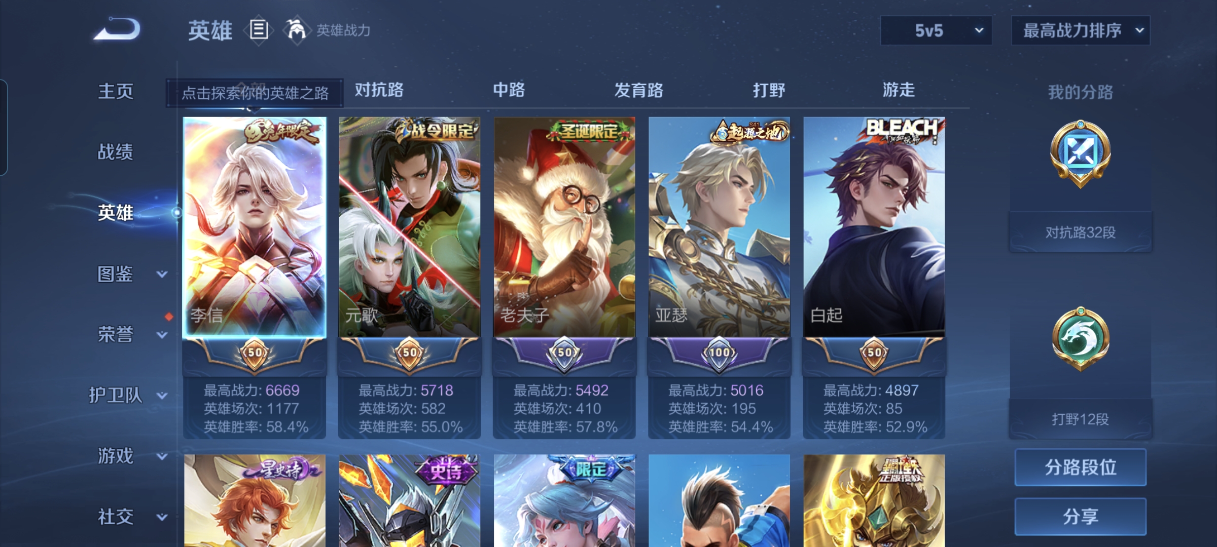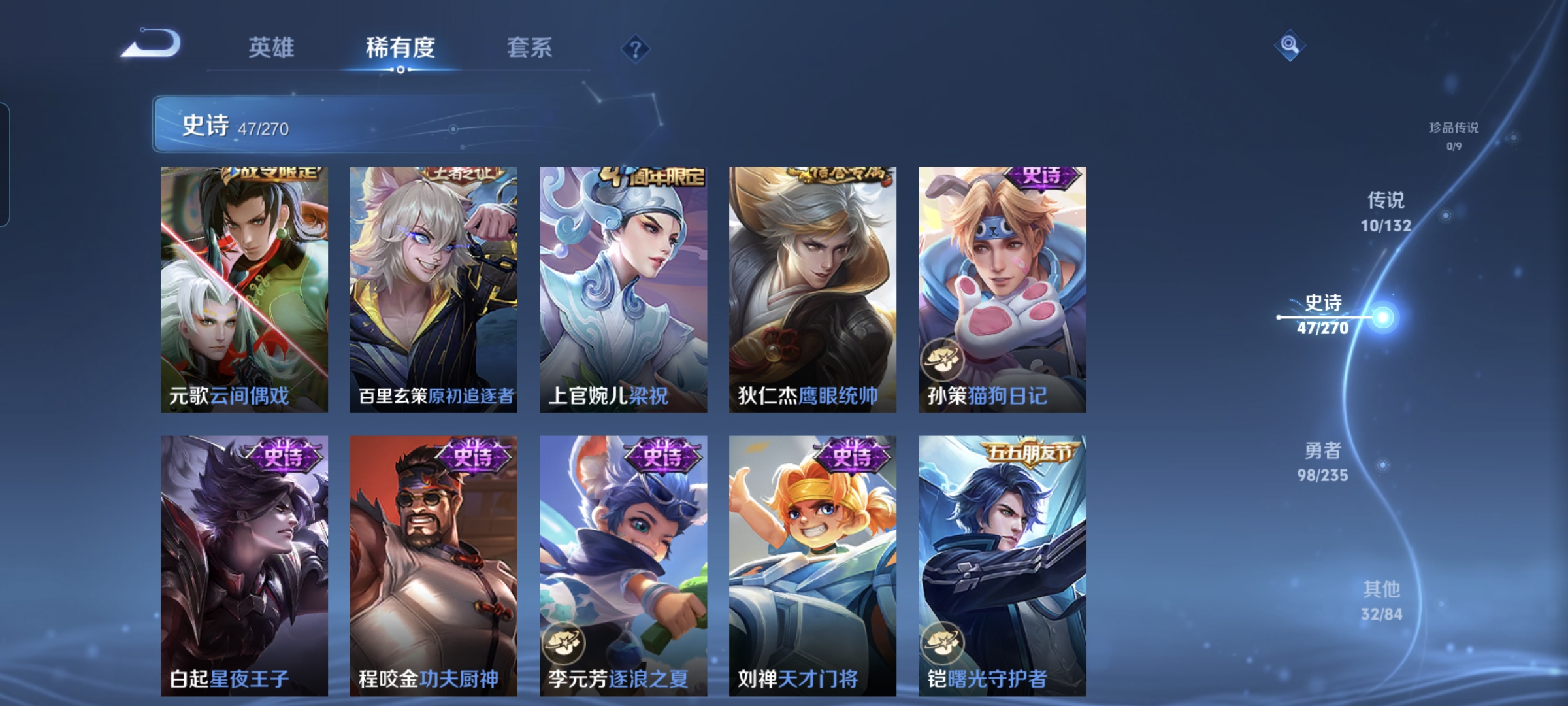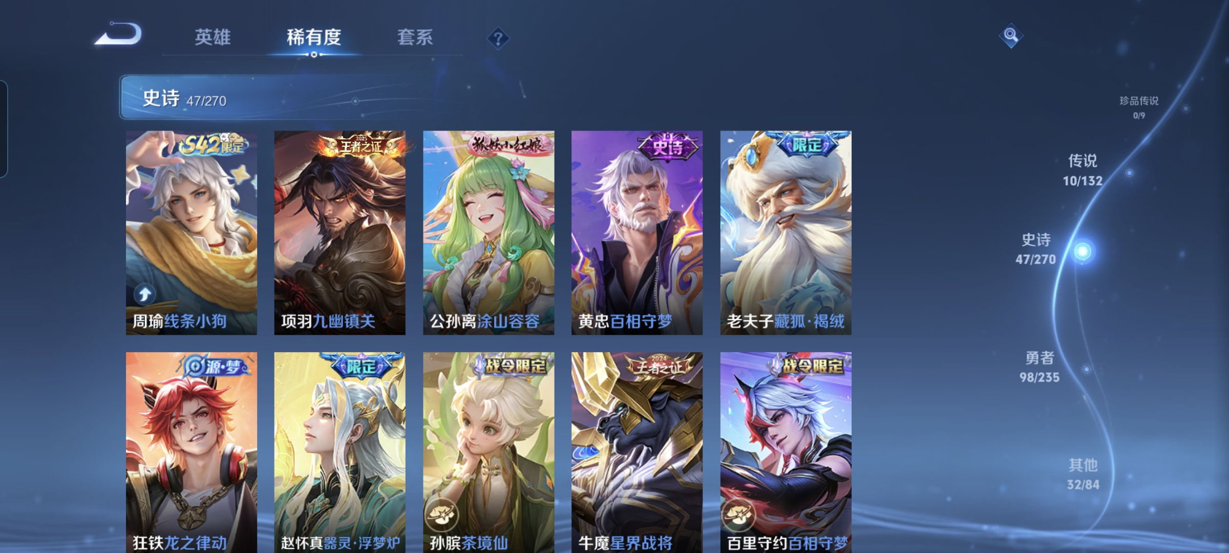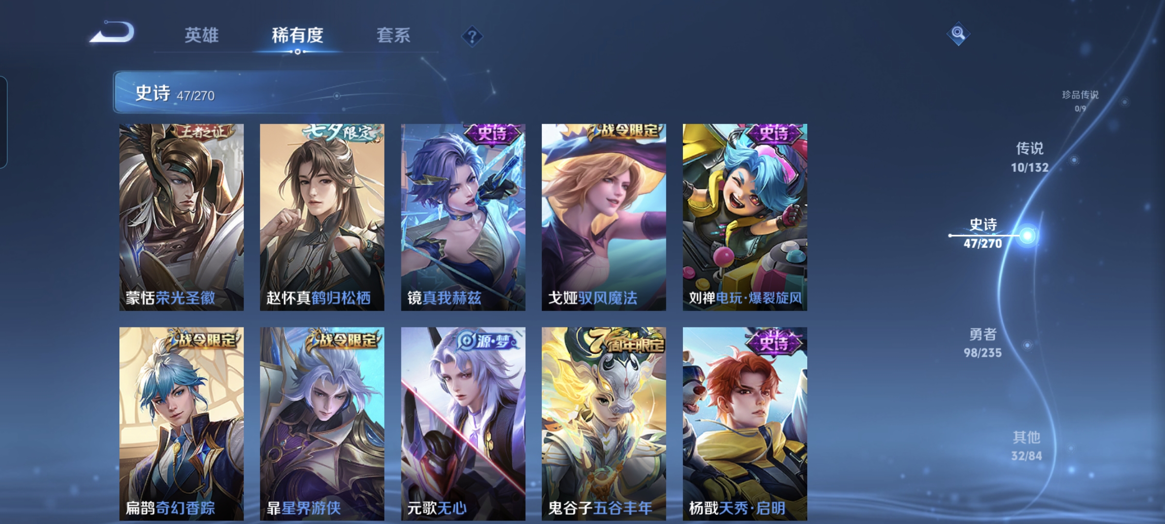 贵族等级:v7皮肤数:187传说品质10 生肖限定2 英雄数:126