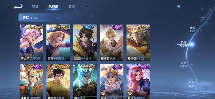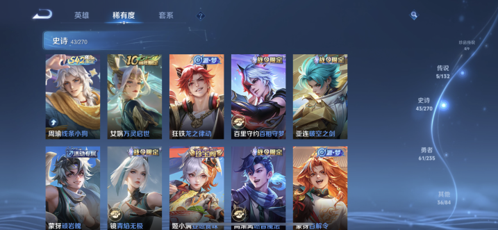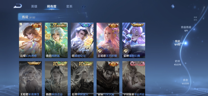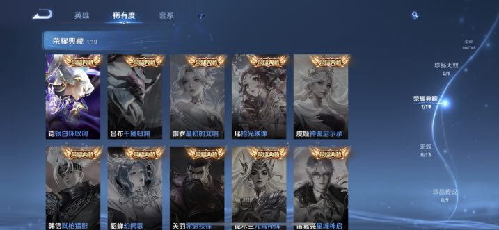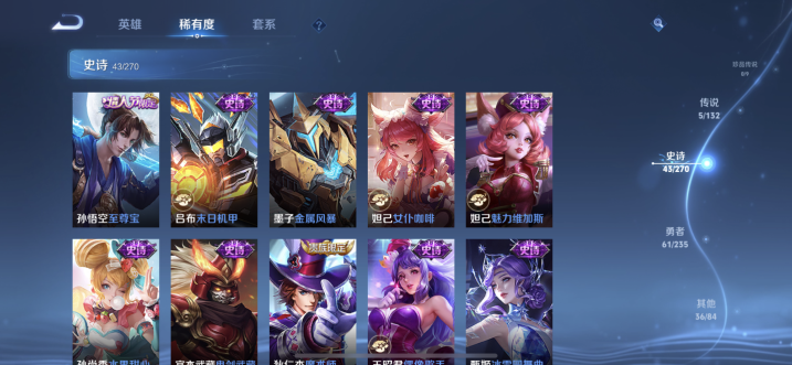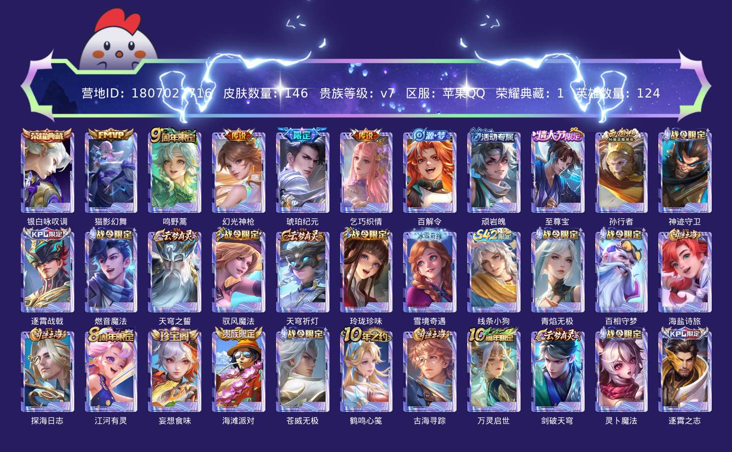 贵族等级:v7皮肤数:146情人节限定1 传说品质5 生肖限定1 荣耀典藏1 英雄数:124