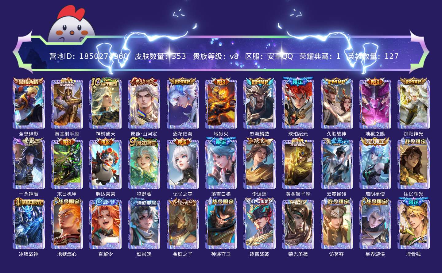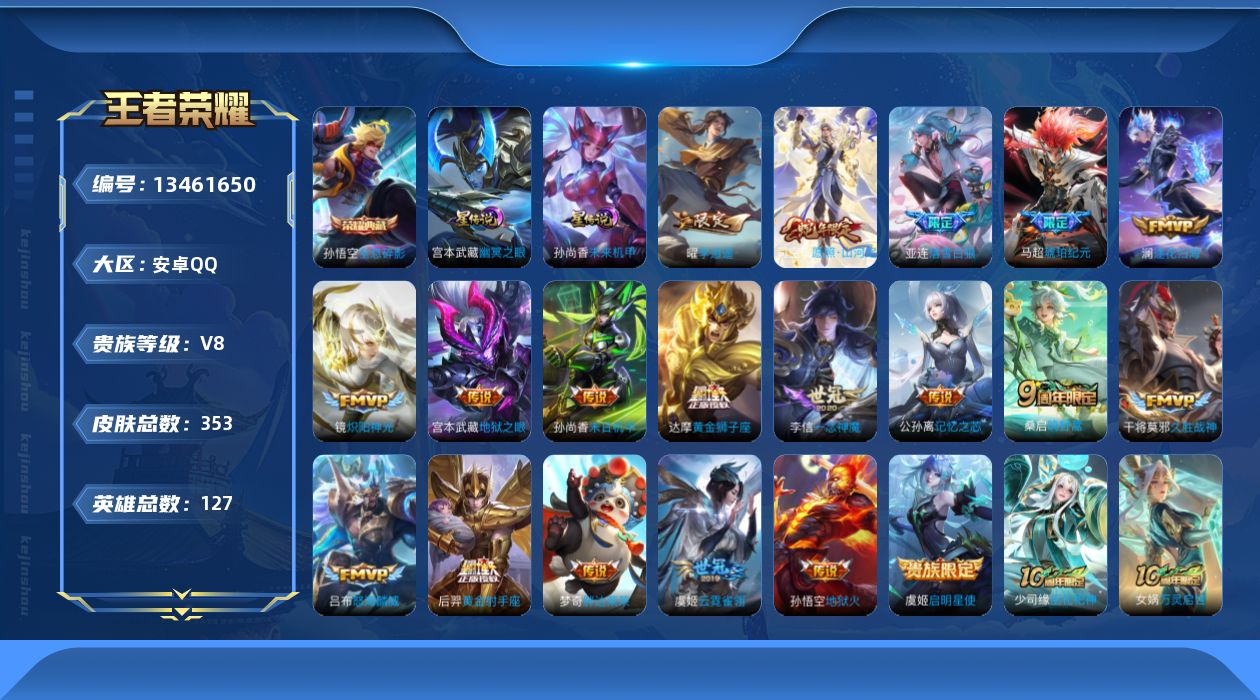贵族等级:v8皮肤数:353传说品质20 生肖限定2 荣耀典藏1 英雄数:127