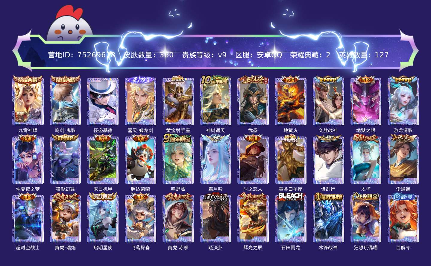贵族等级:v9皮肤数:360生肖限定9 传说品质23 情人节限定1 荣耀典藏2 珍品传说1 无双1 英雄数:127