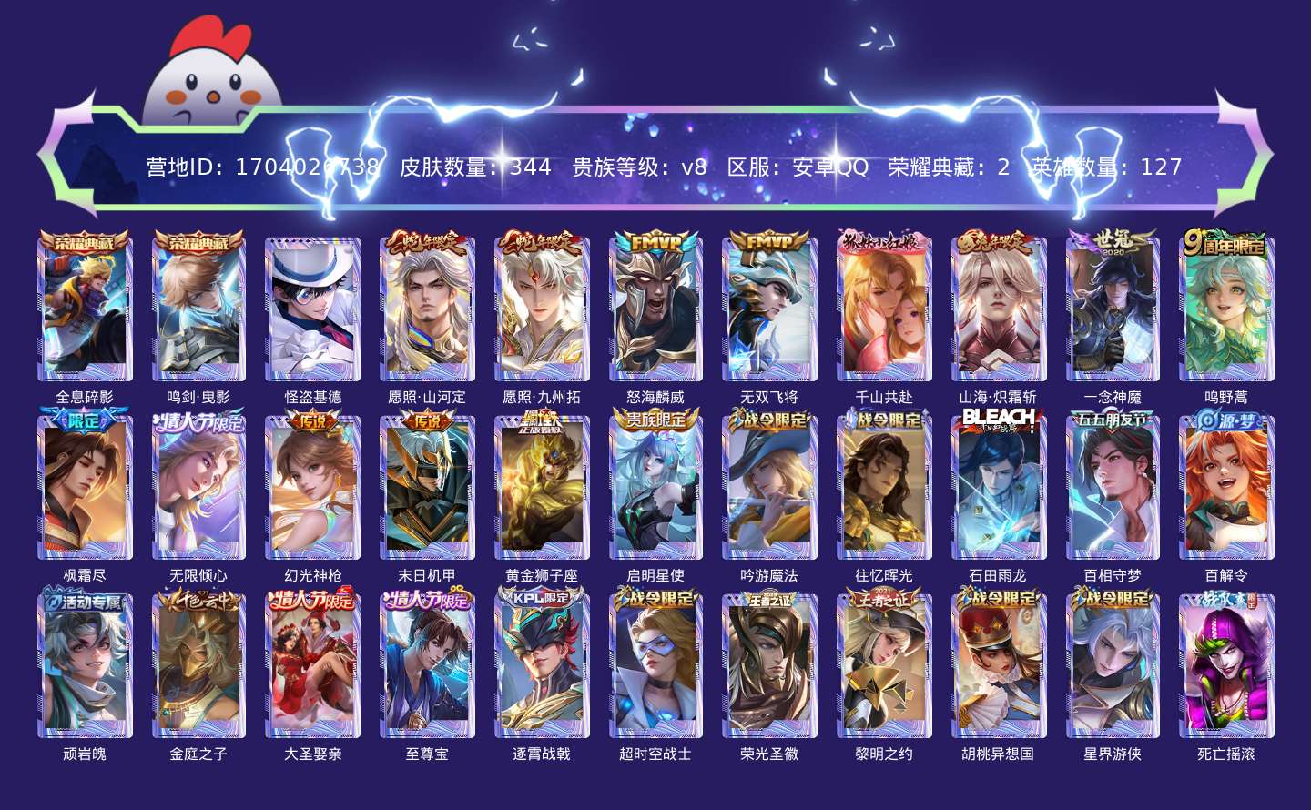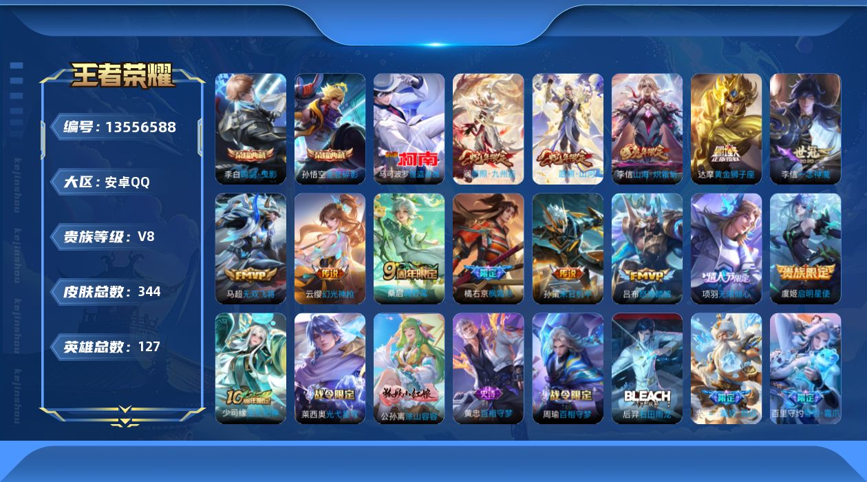 贵族等级:v8皮肤数:344传说品质14 生肖限定5 情人节限定3 荣耀典藏2 珍品传说1 英雄数:127