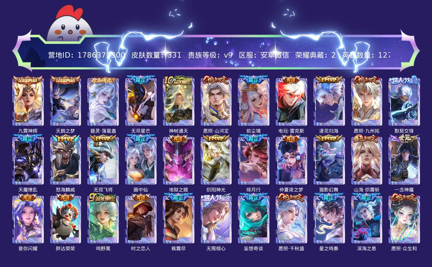 贵族等级:v9皮肤数:331传说品质46 生肖限定10 情人节限定2 荣耀典藏2 珍品传说1 英雄数:127