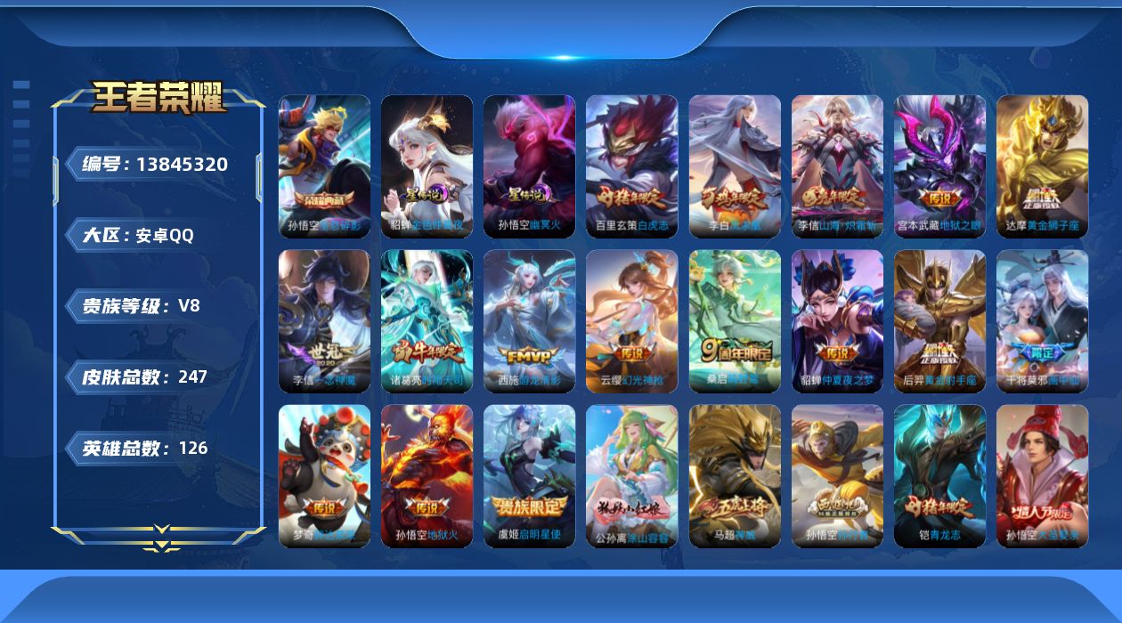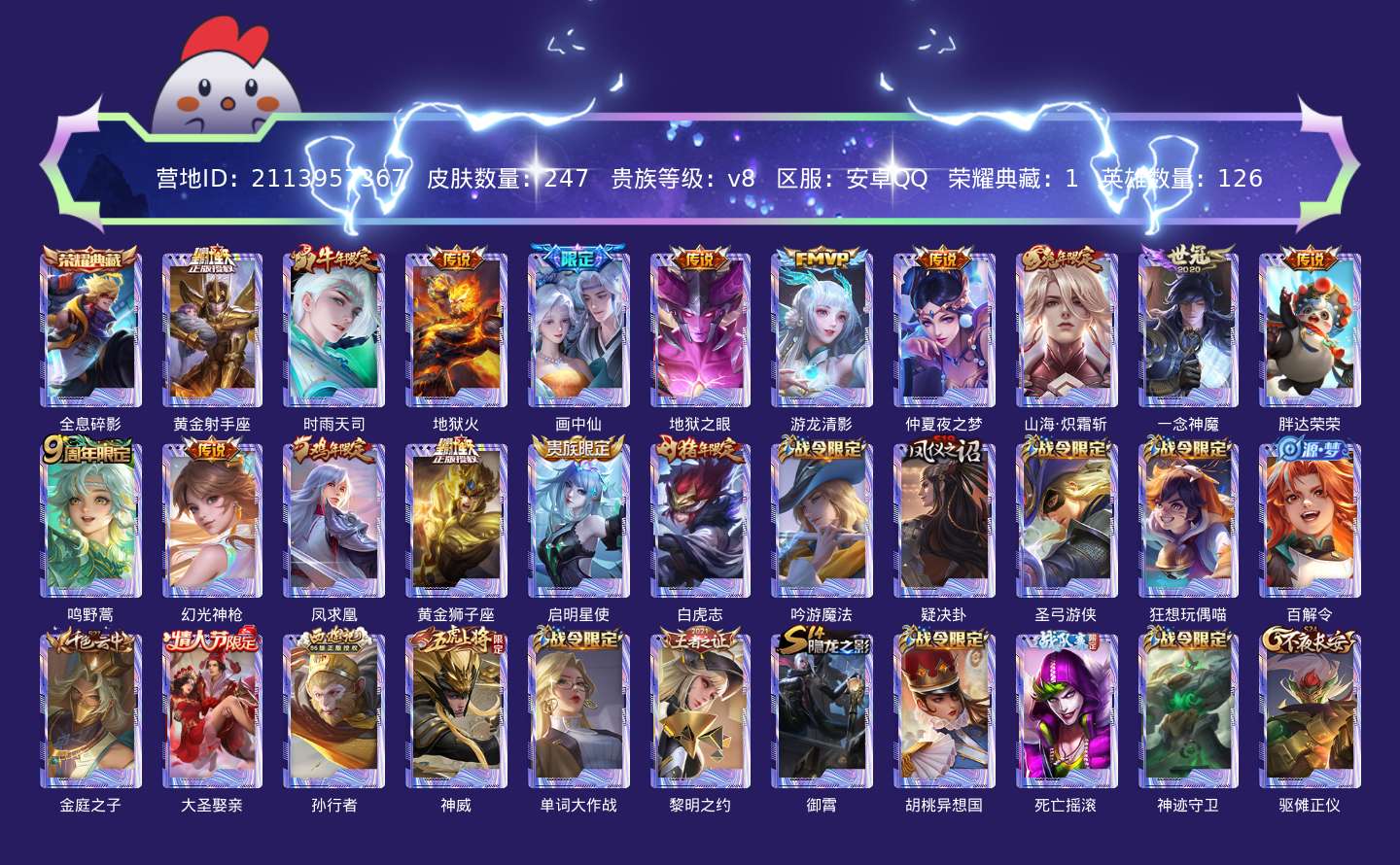 贵族等级:v8皮肤数:247传说品质16 生肖限定5 情人节限定2 荣耀典藏1 英雄数:126
