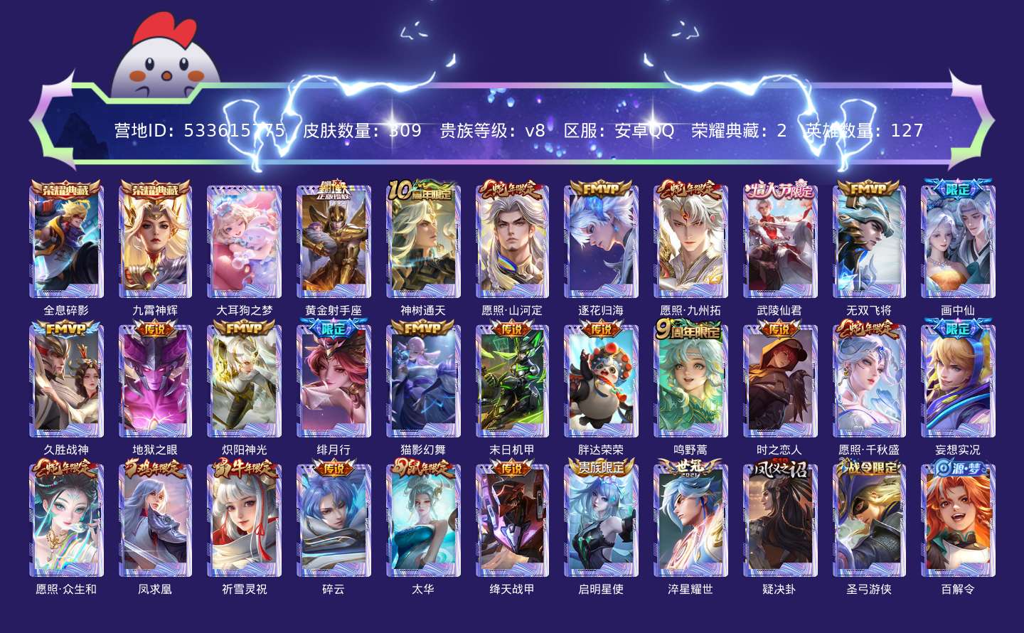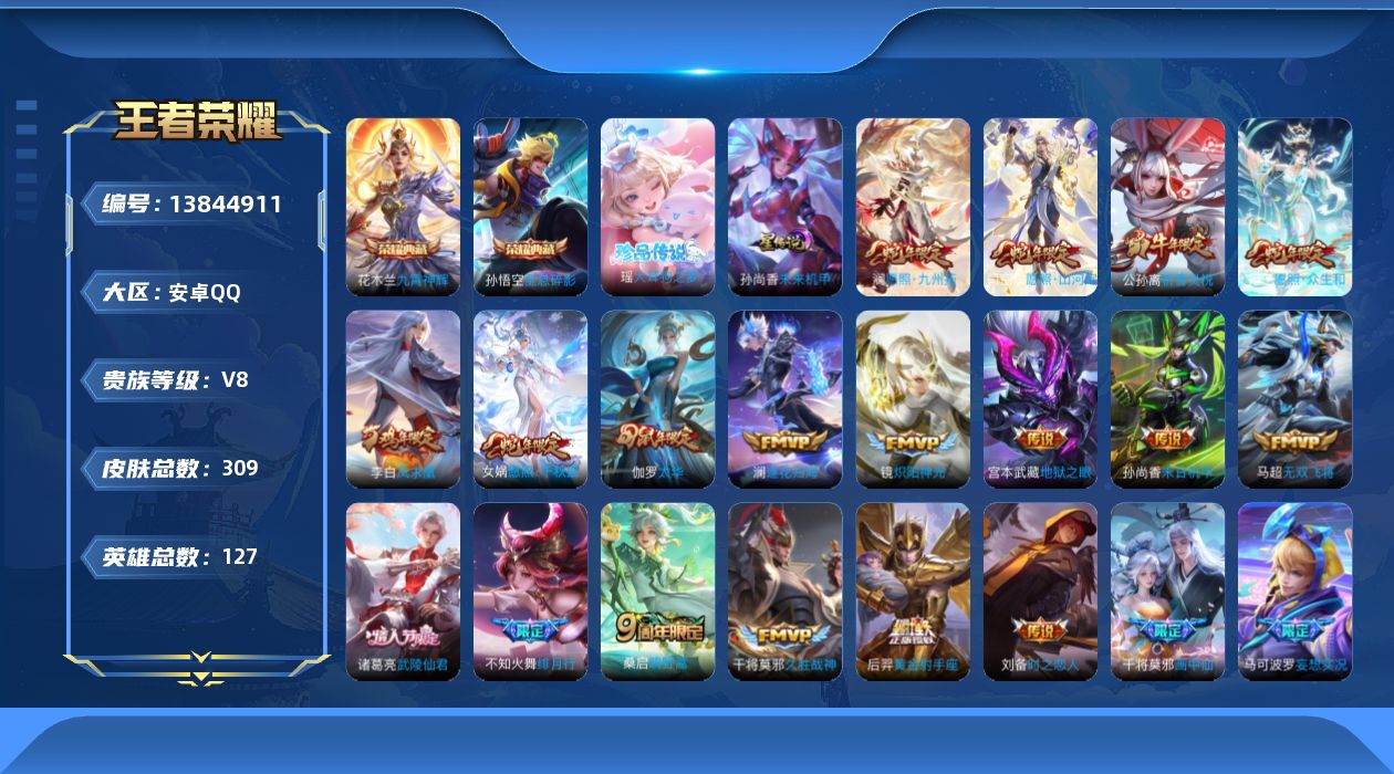 贵族等级:v8皮肤数:309传说品质27 生肖限定11 情人节限定3 荣耀典藏2 珍品传说1 英雄数:127