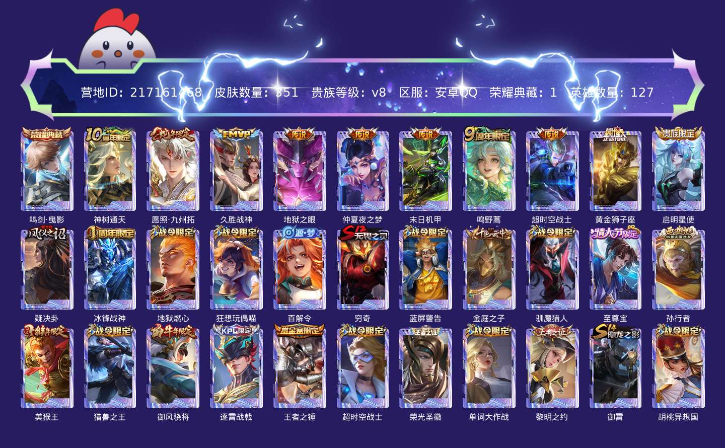 贵族等级:v8皮肤数:351传说品质10 生肖限定5 情人节限定1 荣耀典藏1 英雄数:127