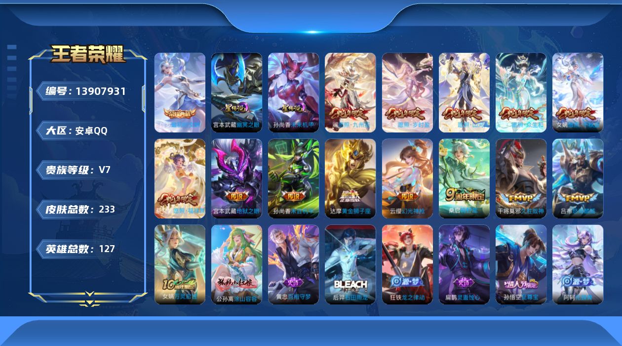 贵族等级:v7皮肤数:233传说品质15 生肖限定6 情人节限定1 荣耀典藏1 英雄数:127
