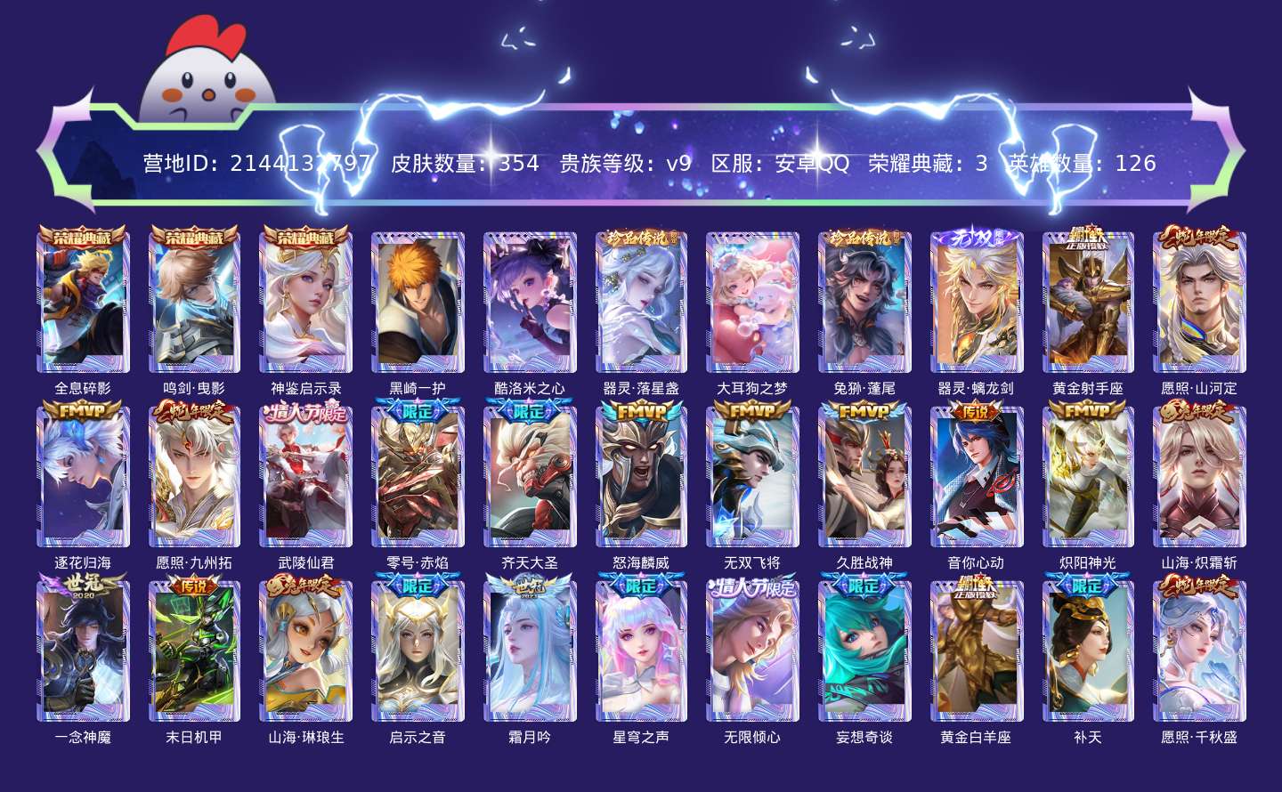 贵族等级:v9皮肤数:354传说品质40 情人节限定6 生肖限定11 荣耀典藏3 珍品传说5 无双1 英雄数:126