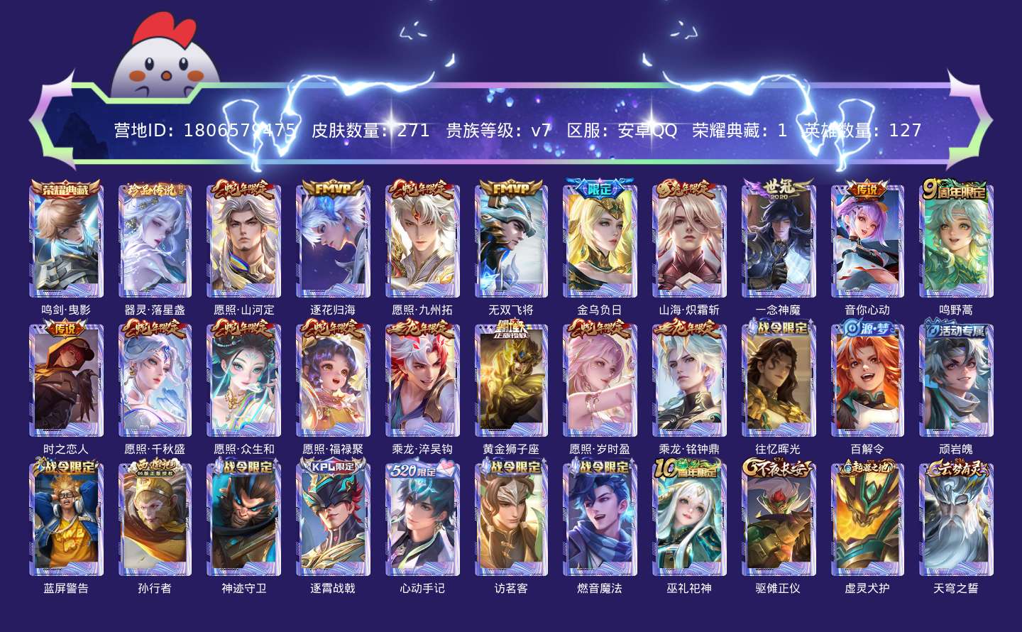 贵族等级:v7皮肤数:271传说品质17 生肖限定9 珍品传说1 荣耀典藏1 英雄数:127