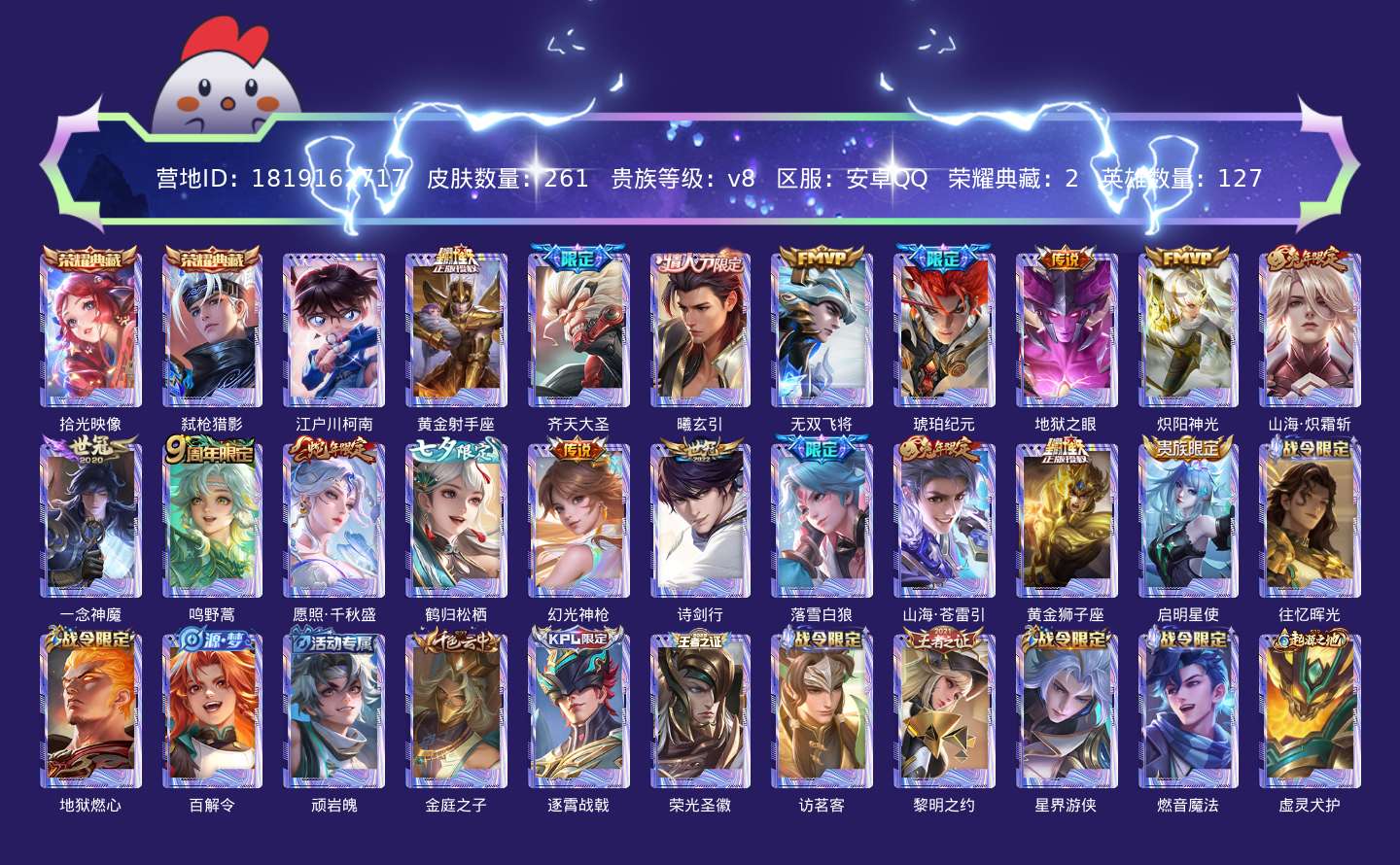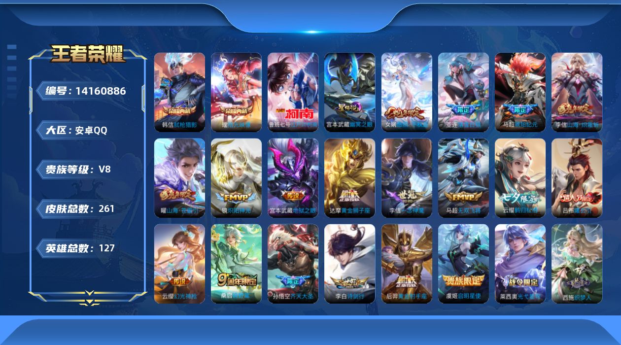 贵族等级:v8皮肤数:261传说品质18 情人节限定1 生肖限定5 荣耀典藏2 珍品传说1 英雄数:127