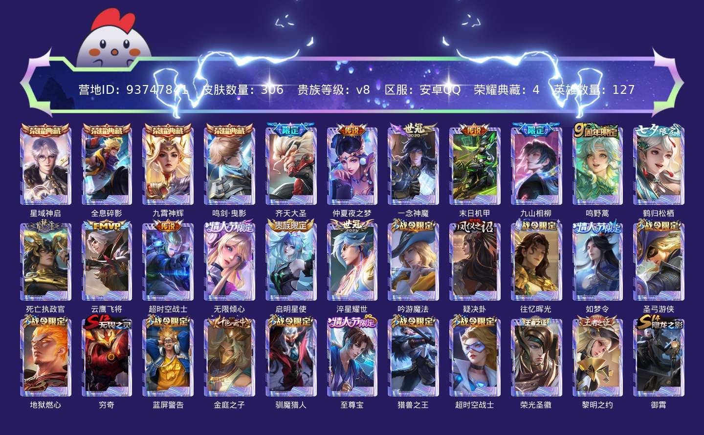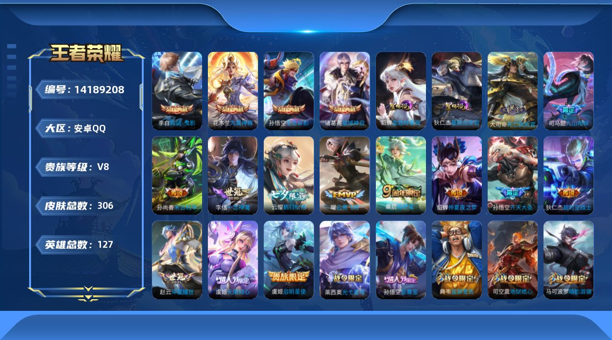贵族等级:v8皮肤数:306情人节限定3 荣耀典藏4 传说品质13 生肖限定1 英雄数:127