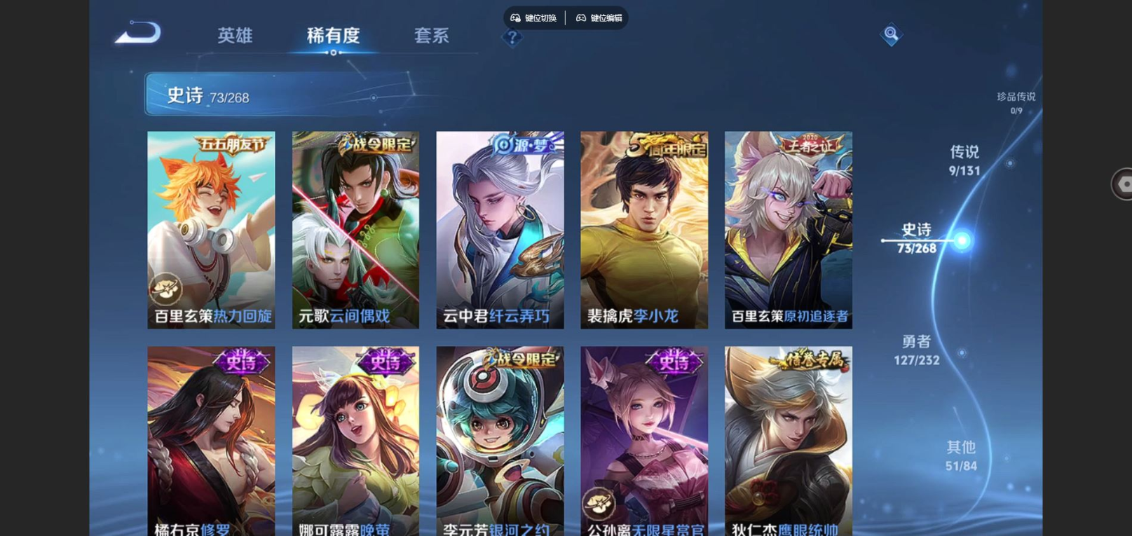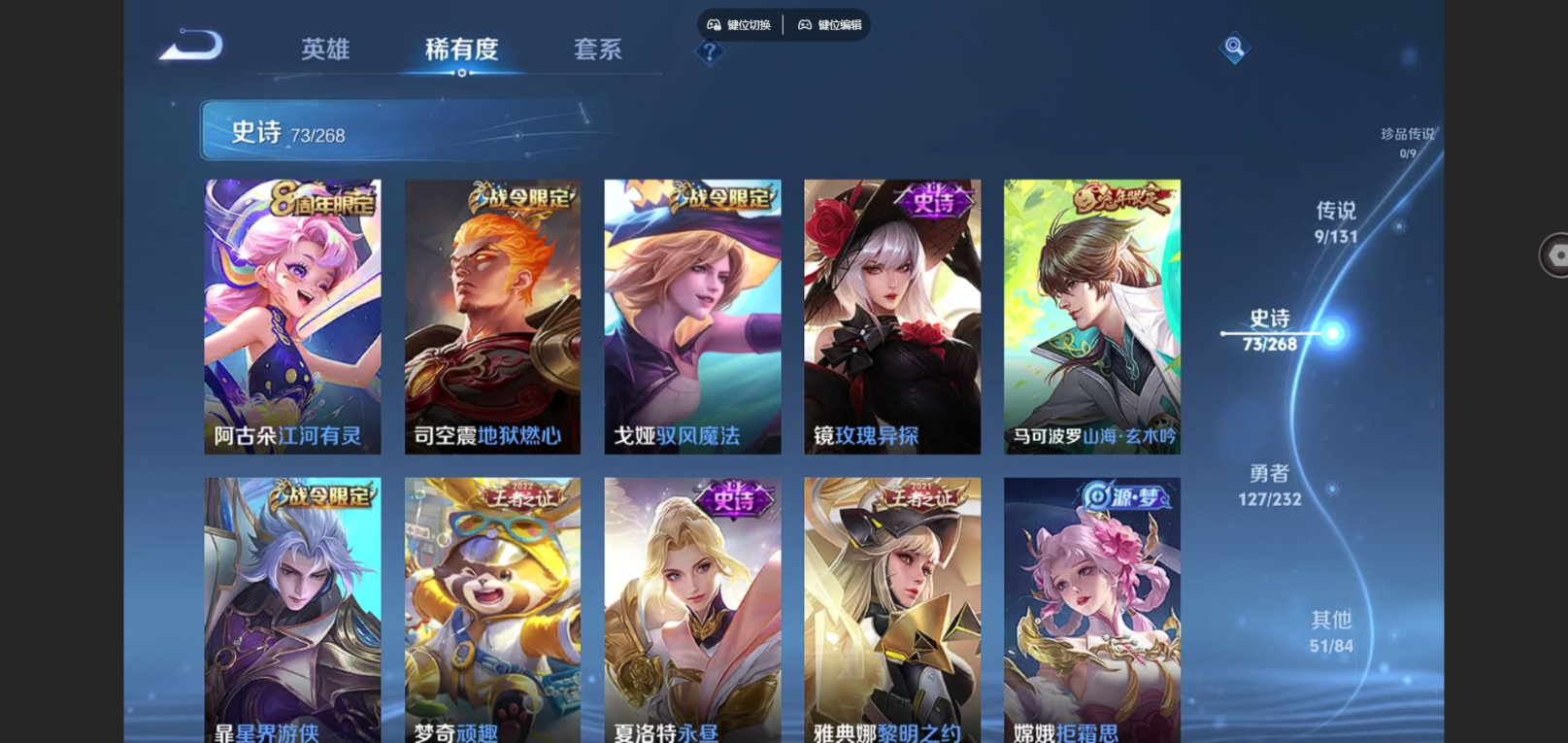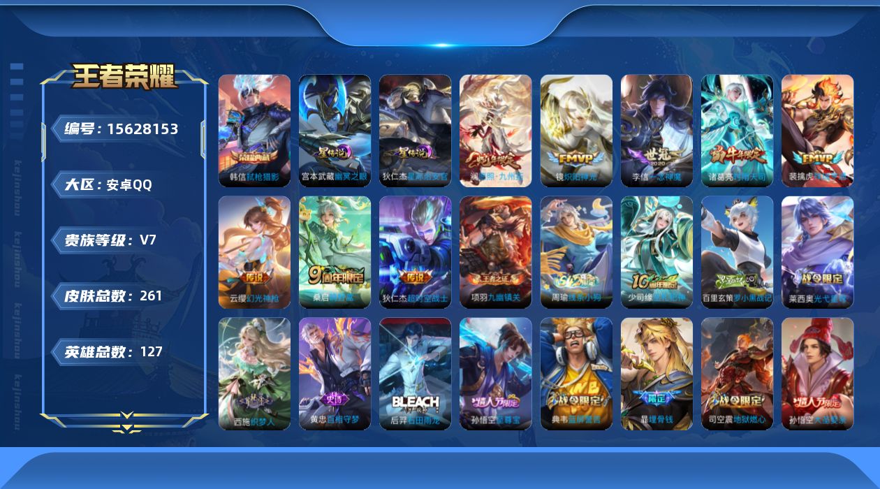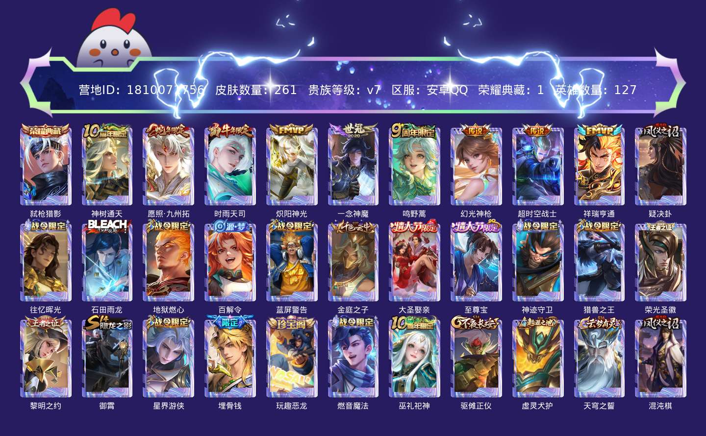 贵族等级:v7皮肤数:261传说品质9 生肖限定3 情人节限定2 荣耀典藏1 英雄数:127