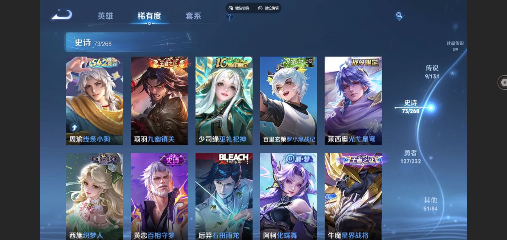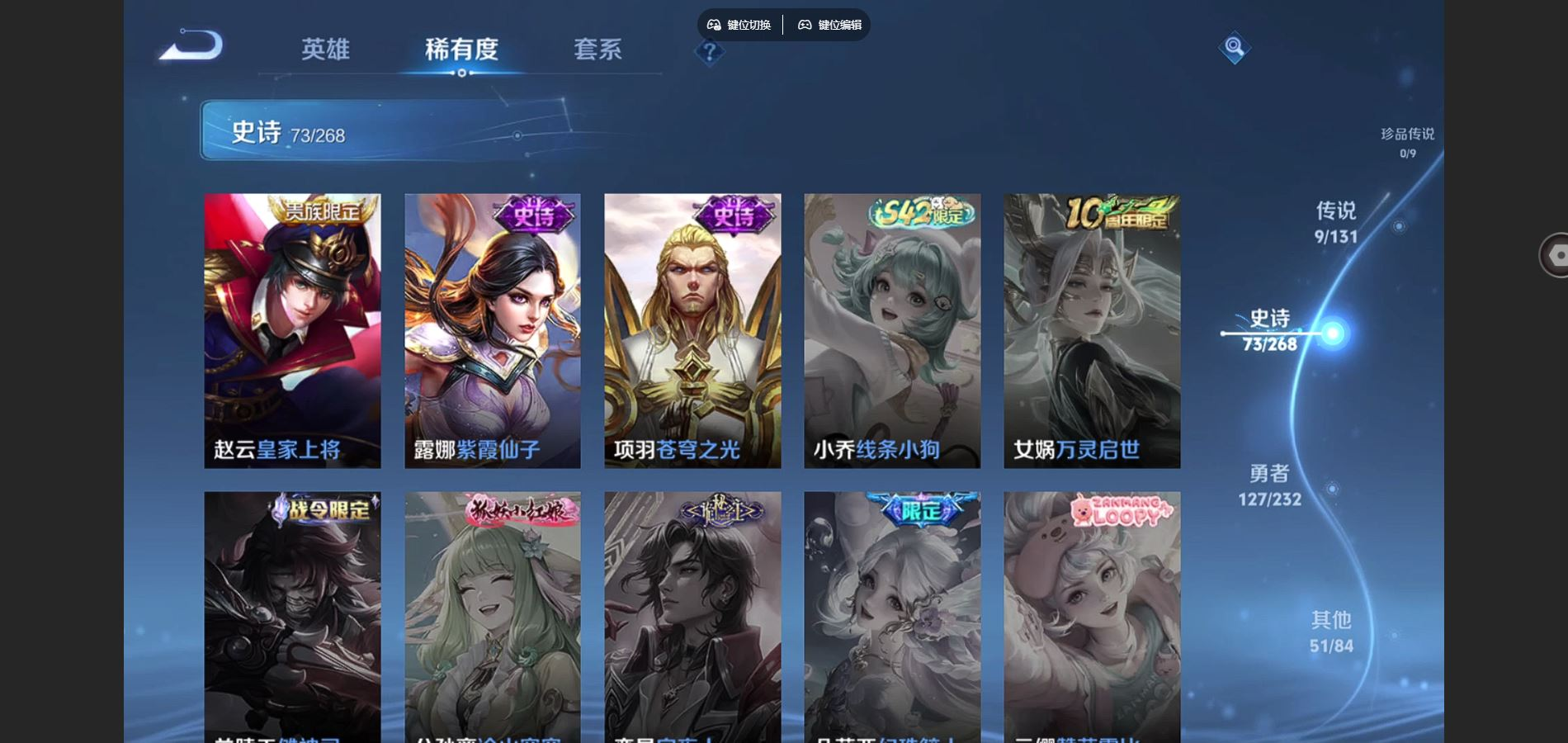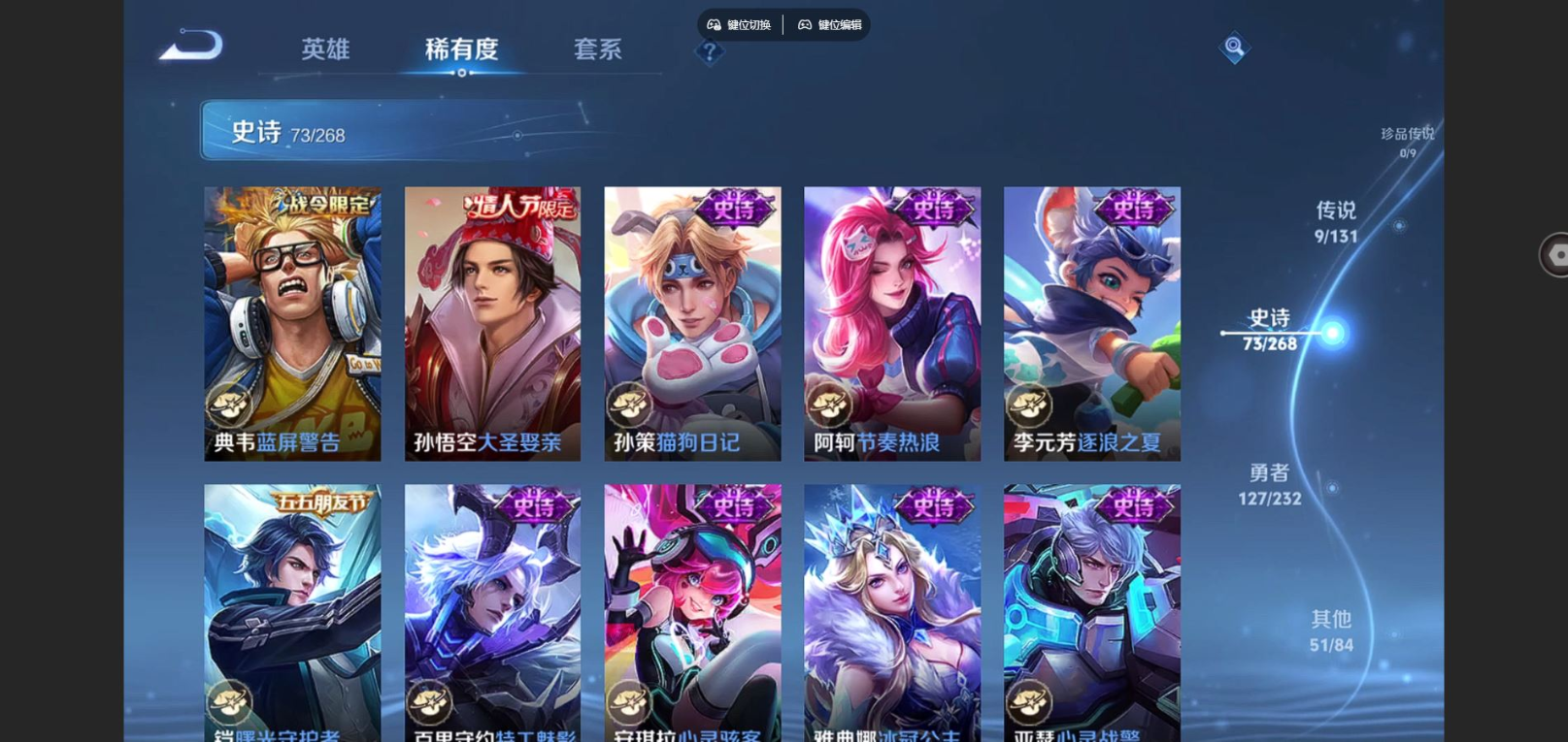 贵族等级:v7皮肤数:261传说品质9 生肖限定3 情人节限定2 荣耀典藏1 英雄数:127