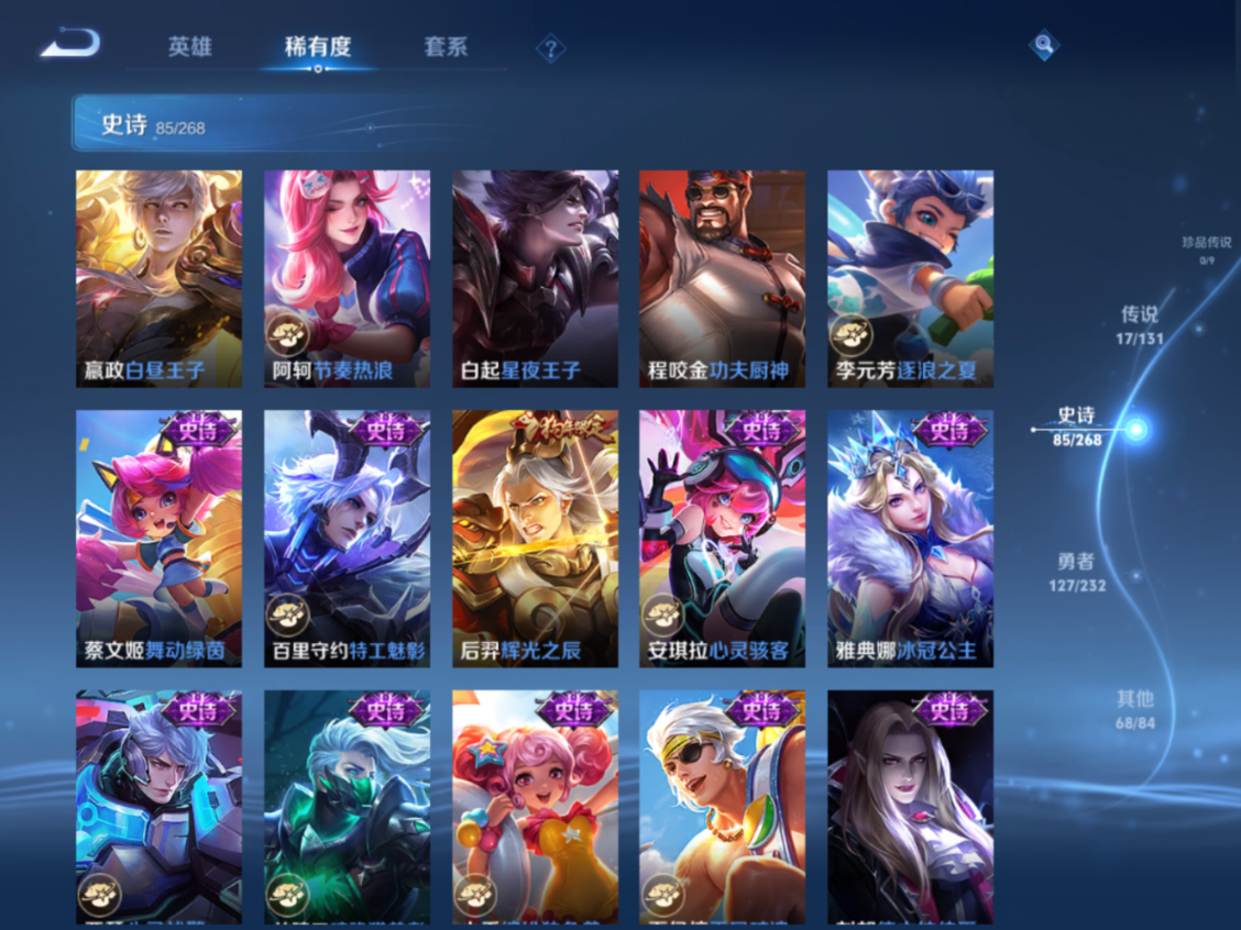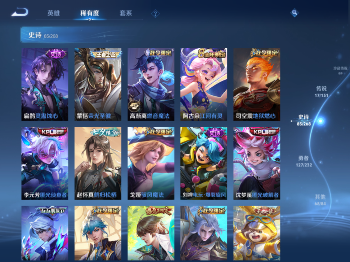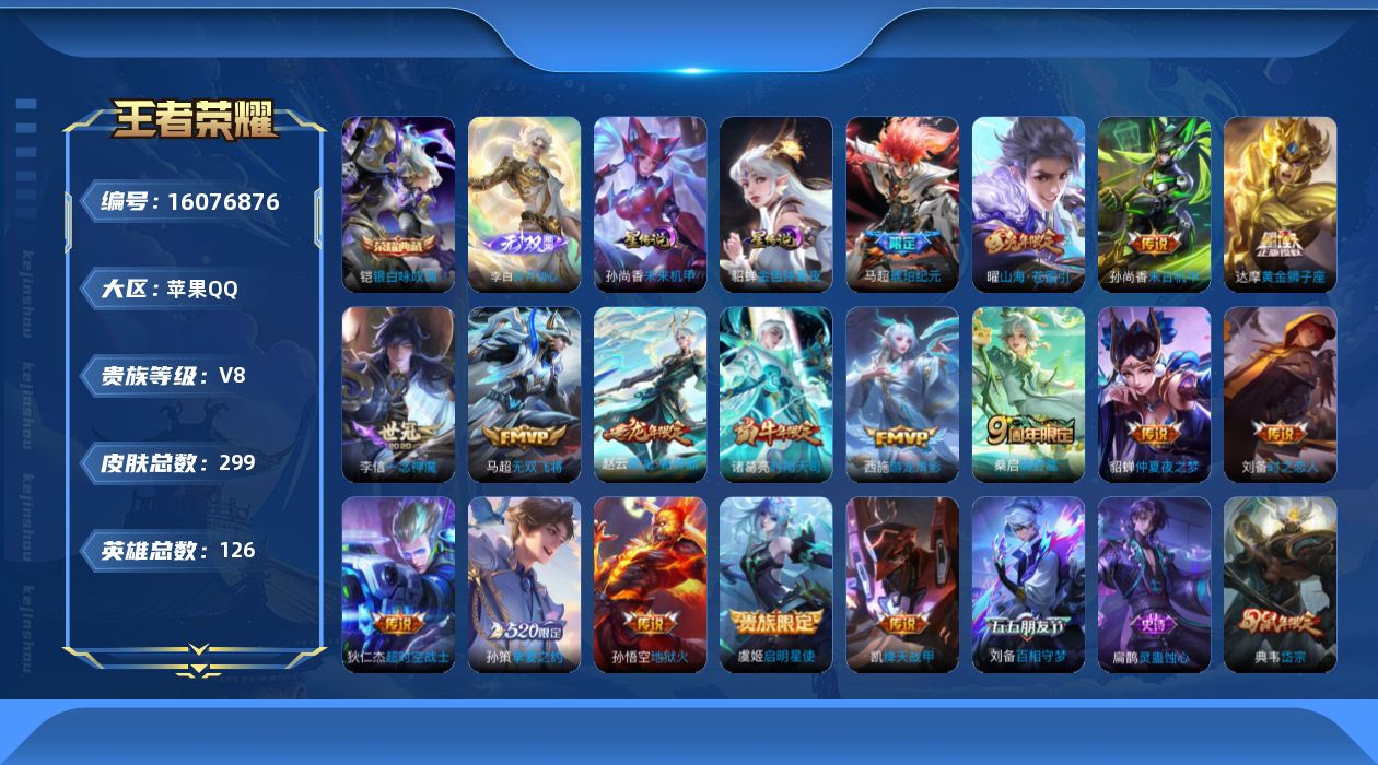 贵族等级:v8皮肤数:299生肖限定7 传说品质17 情人节限定1 无双1 荣耀典藏1 英雄数:126