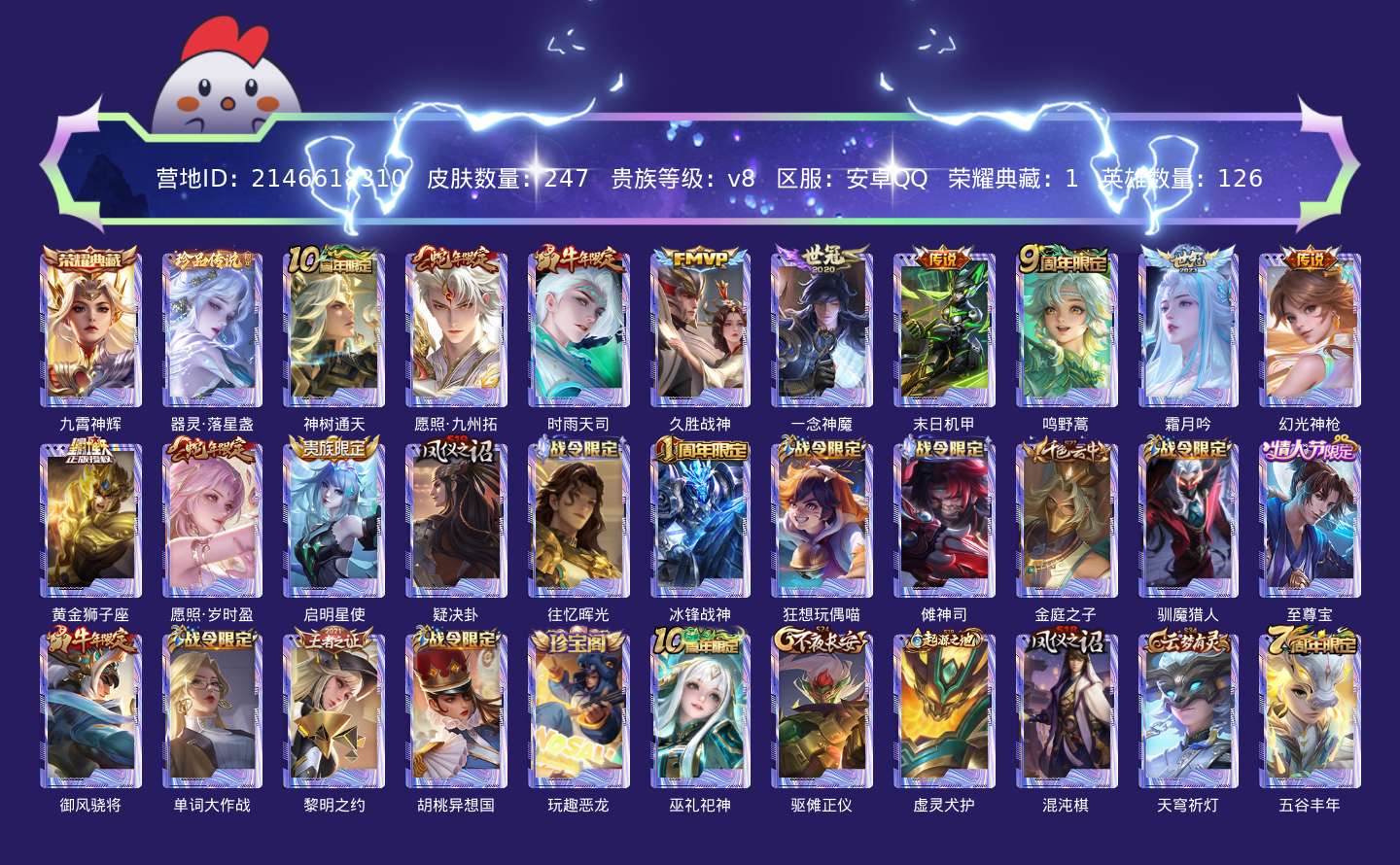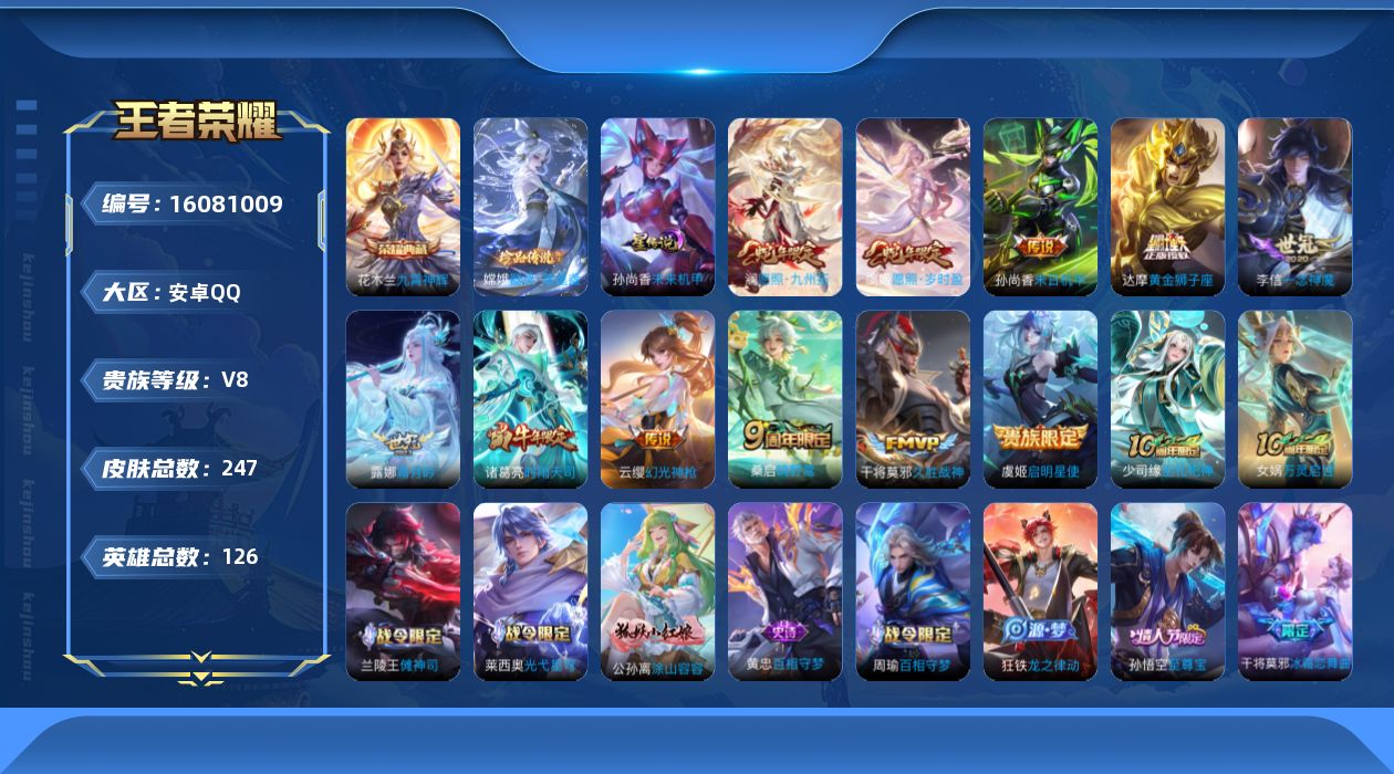 贵族等级:v8皮肤数:247传说品质12 生肖限定7 情人节限定1 荣耀典藏1 珍品传说1 英雄数:126