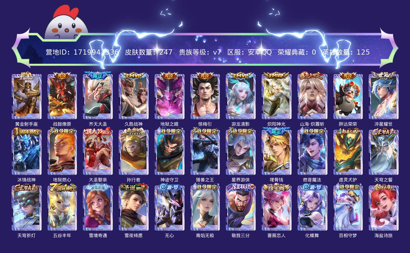 贵族等级:v7皮肤数:247传说品质11 情人节限定1 生肖限定2 英雄数:125