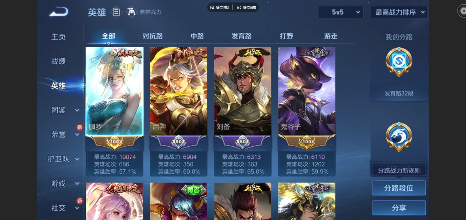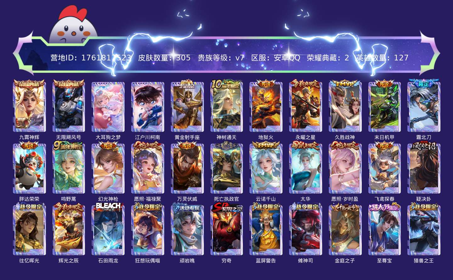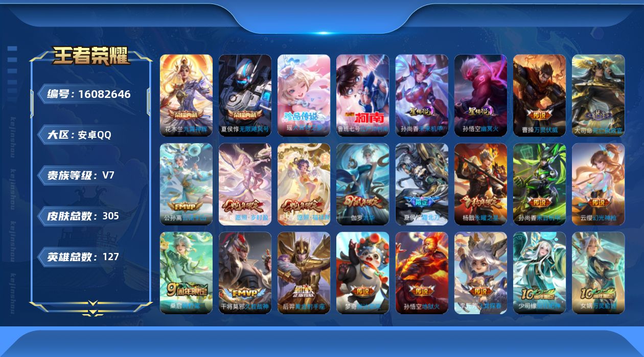 贵族等级:v7皮肤数:305生肖限定5 传说品质17 情人节限定1 荣耀典藏2 珍品传说2 英雄数:127