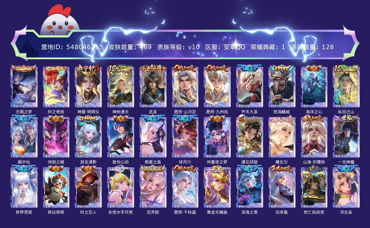 传说品质_后羿_神树通天传说品质_关羽_武圣传说品质_司空震_愿照·山河定传说品质_澜_愿照·九州拓传说品质_孙悟空_齐天大圣传说品质_吕布_怒海麟威传说品质_武则天_海洋之心传说品质_杨戬_纵目迁山传说品质_干将莫邪_画中仙传说品质_宫本武藏_地狱之眼传说品质_西施_游龙清影传说品质_周瑜_音你心动传说品质_花木兰_燃星之曲传说品质_不知火舞_绯月行传说品质_貂蝉_仲夏夜之梦传说品质_貂蝉_遇见胡旋传说品质_貂蝉_曦玄引传说品质_李信_山海·炽霜斩传说品质_李信_一念神魔传说品质_孙尚香_异界灵契传说品质_梦奇_胖达荣荣传说品质_刘备_时之恋人传说品质_王昭君_永恒水手月亮传说品质_艾琳_觅芳踪传说品质_女娲_愿照·千秋盛传说品质_墨子_黄金天蝎座传说品质_马可波罗_深海之息传说品质_李白_凤求凰传说品质_大司命_死亡执政官传说品质_夏洛特_浮生妄传说品质_曜_云鹰飞将传说品质_曜_李逍遥 传说品质_曜_山海·苍雷引传说品质_孙策_乘龙·淬吴钩传说品质_达摩_黄金狮子座传说品质_虞姬_启明星使传说品质_嬴政_玄雷天君传说品质_赵云_淬星耀世传说品质_裴擒虎_祥瑞亨通传说品质_王昭君_乞巧织情