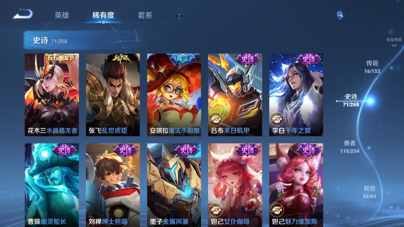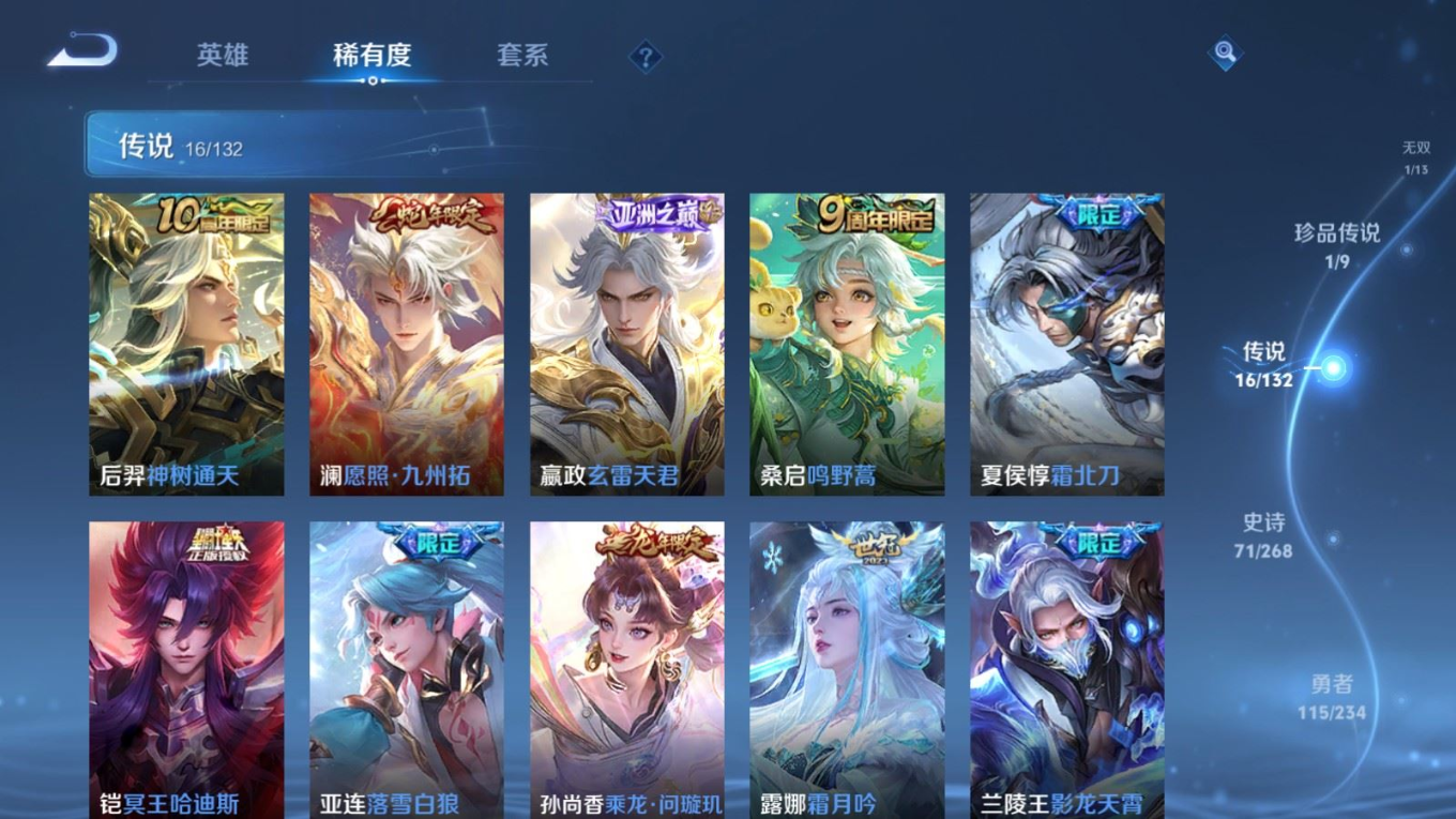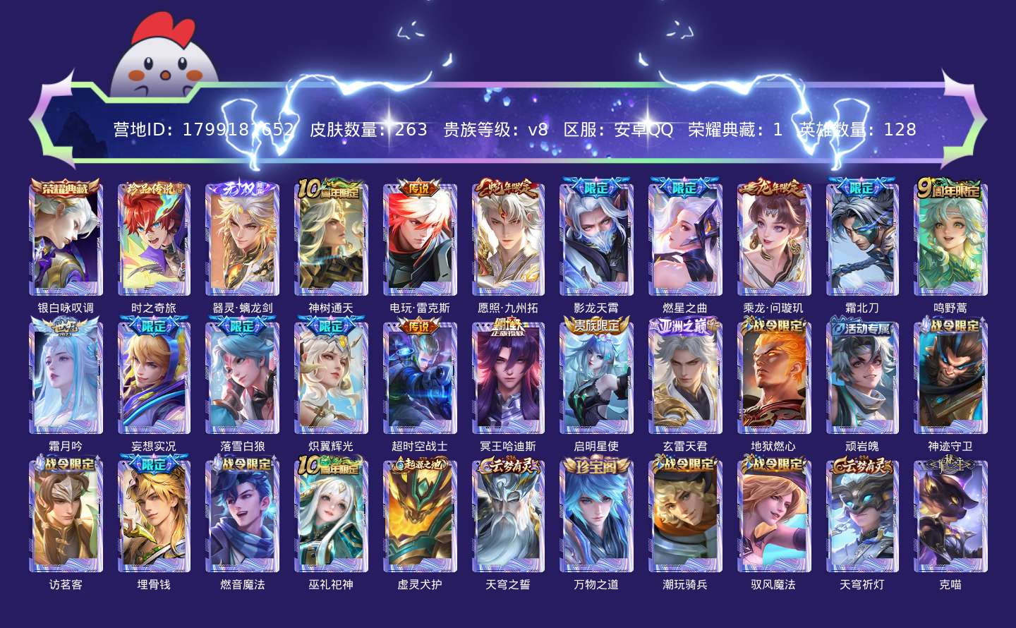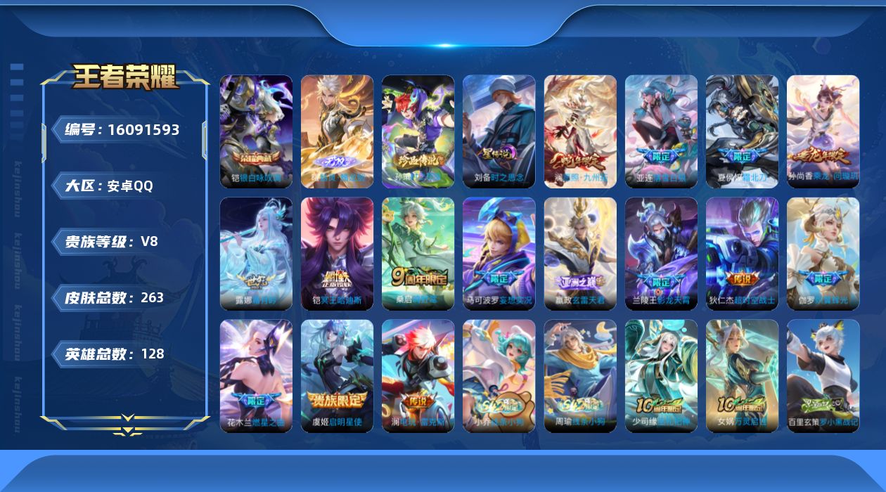 贵族等级:v8皮肤数:263传说品质16 生肖限定2 无双1 珍品传说1 荣耀典藏1 英雄数:128