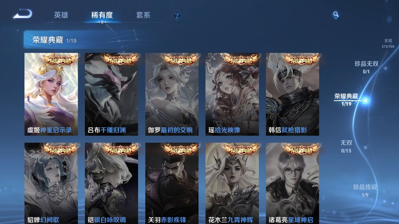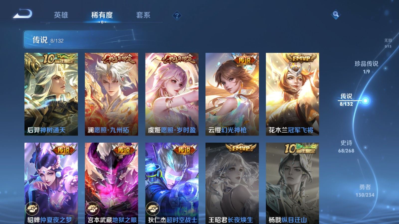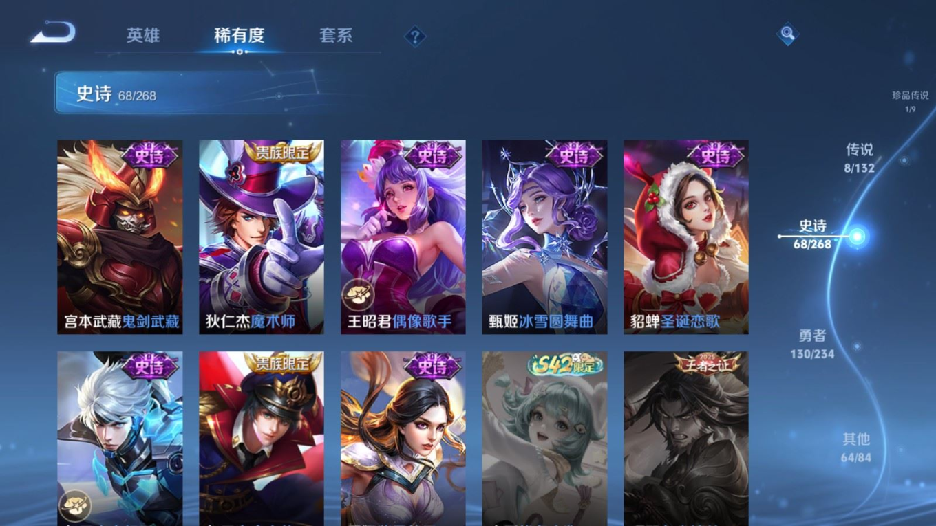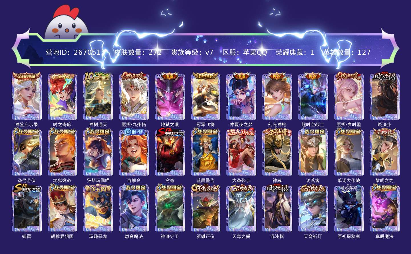 贵族等级:v7皮肤数:272传说品质8 生肖限定2 情人节限定1 珍品传说1 荣耀典藏1 英雄数:127