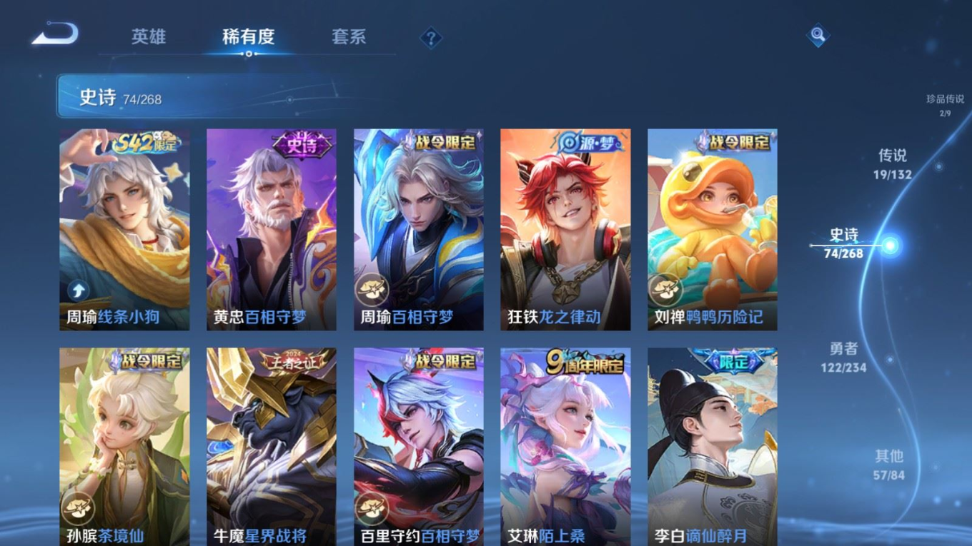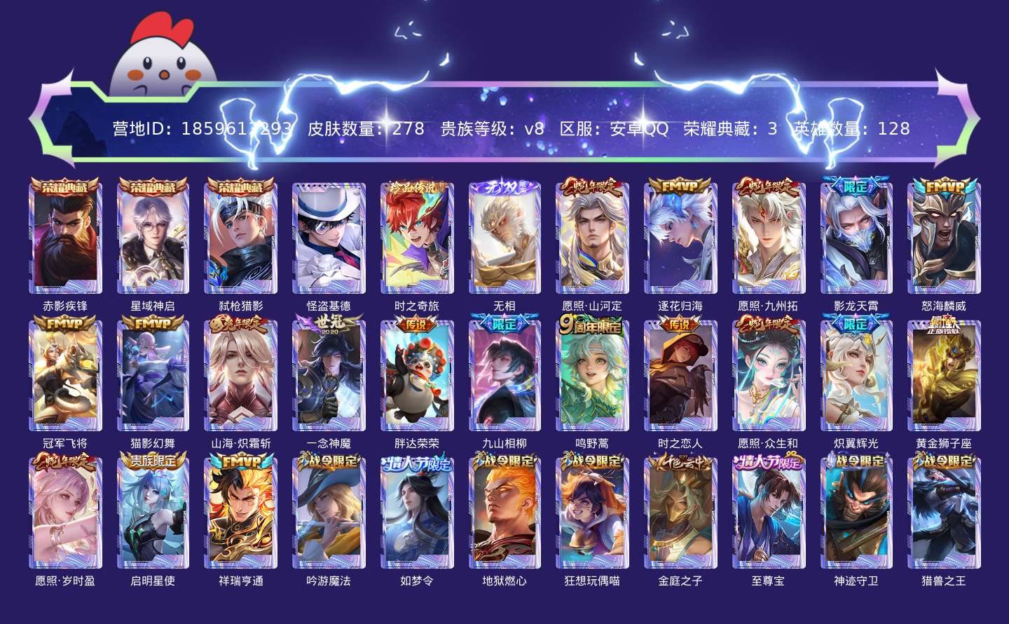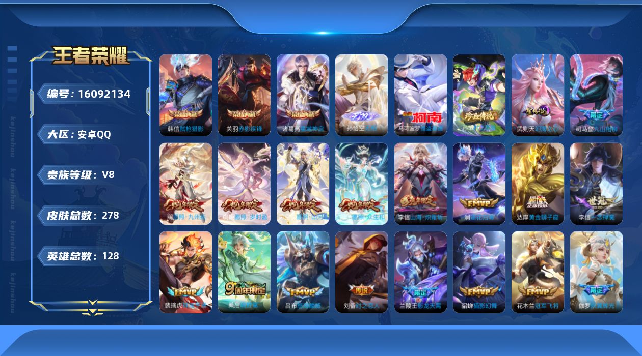 贵族等级:v8皮肤数:278情人节限定2 荣耀典藏3 传说品质19 生肖限定6 无双1 珍品传说2 英雄数:128