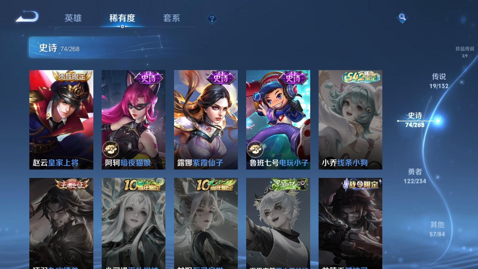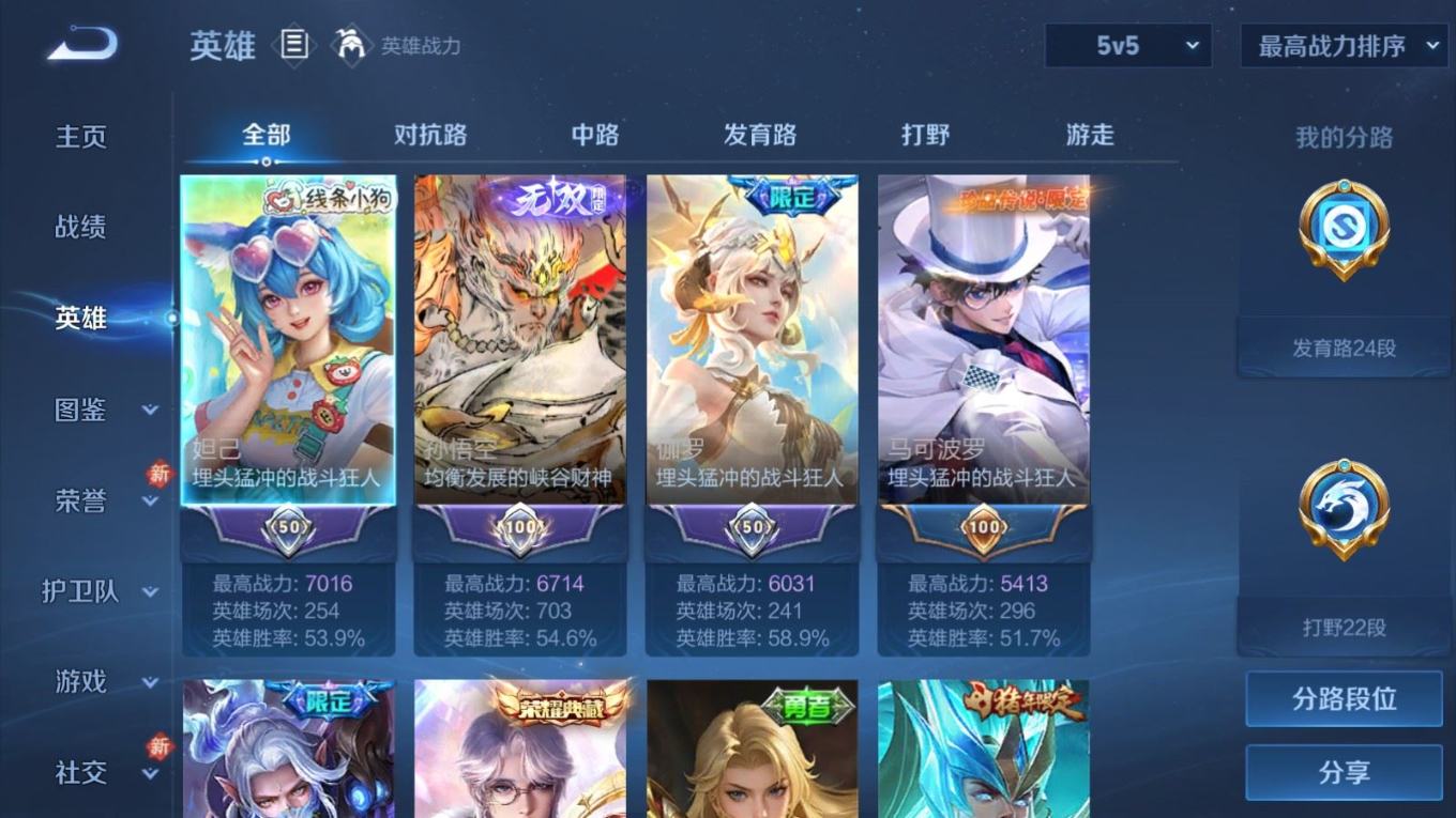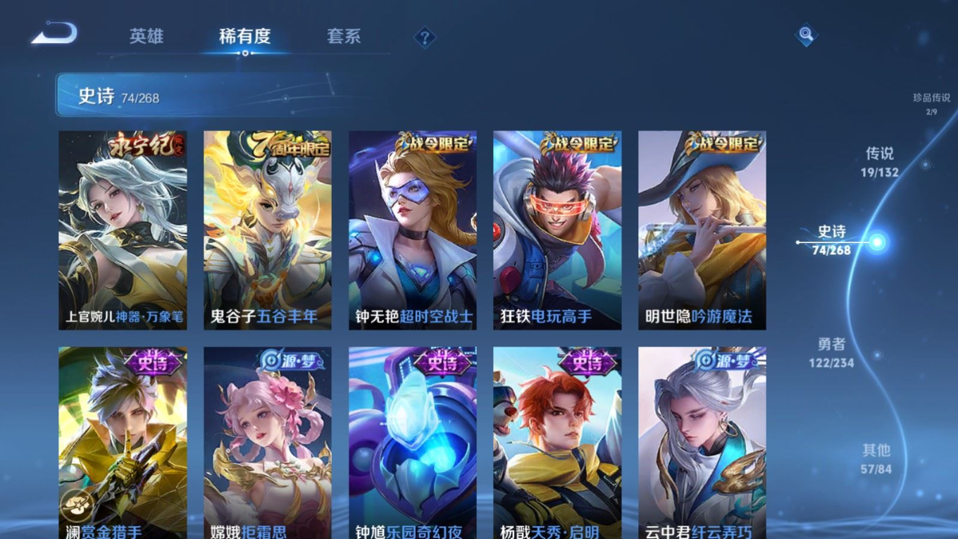 贵族等级:v8皮肤数:278情人节限定2 荣耀典藏3 传说品质19 生肖限定6 无双1 珍品传说2 英雄数:128