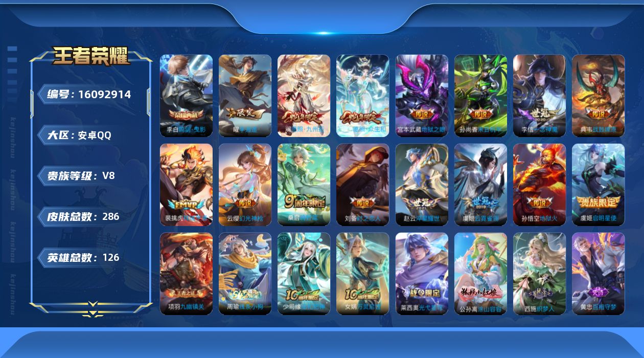 贵族等级:v8皮肤数:286传说品质16 生肖限定4 情人节限定2 荣耀典藏1 英雄数:126