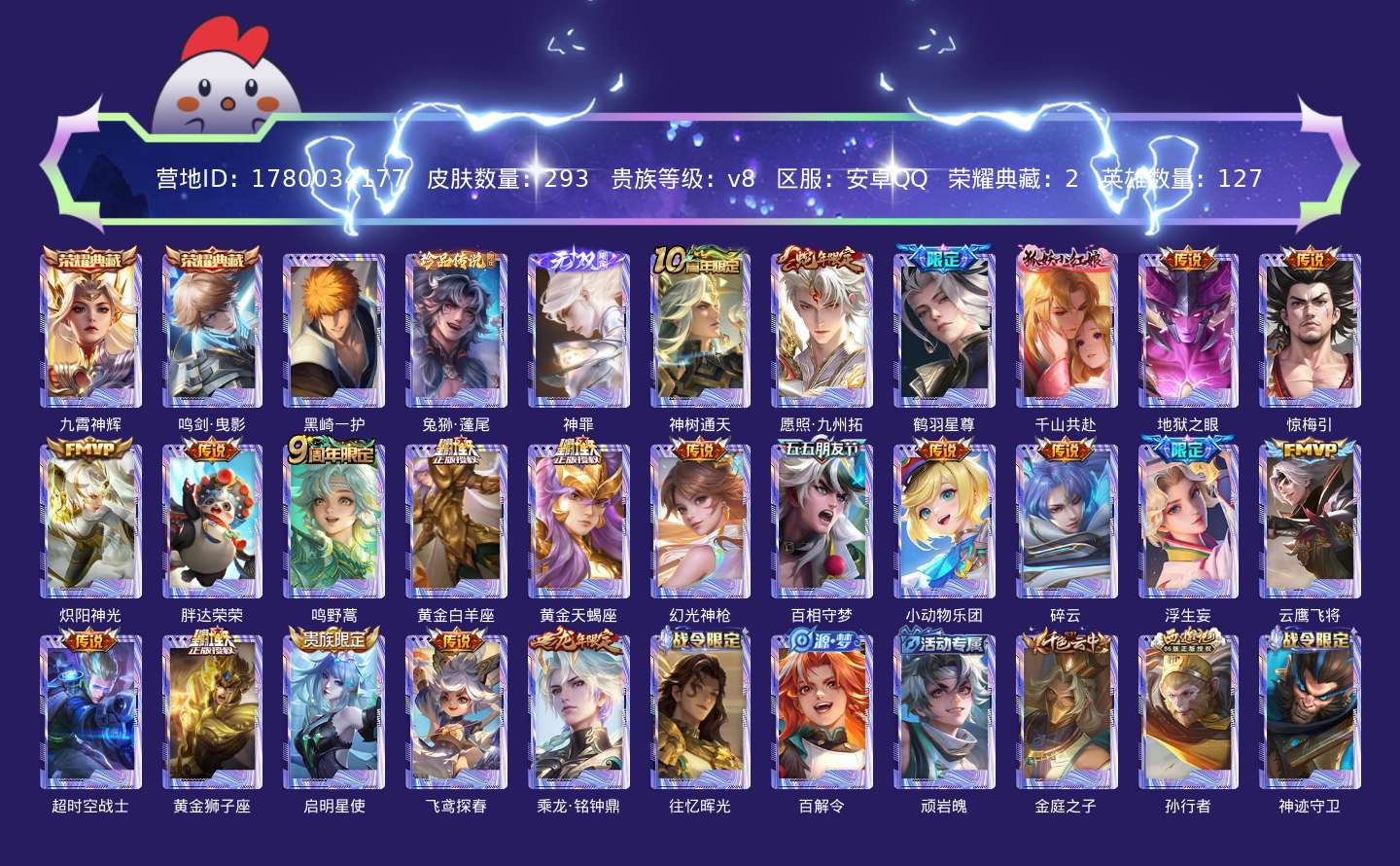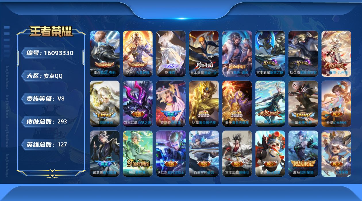 贵族等级:v8皮肤数:293传说品质22 生肖限定4 珍品传说2 荣耀典藏2 无双1 英雄数:127