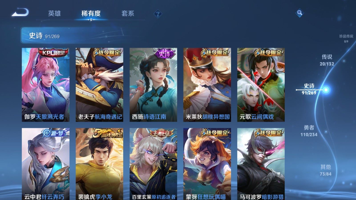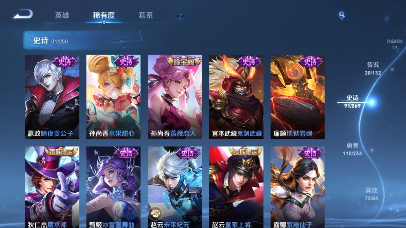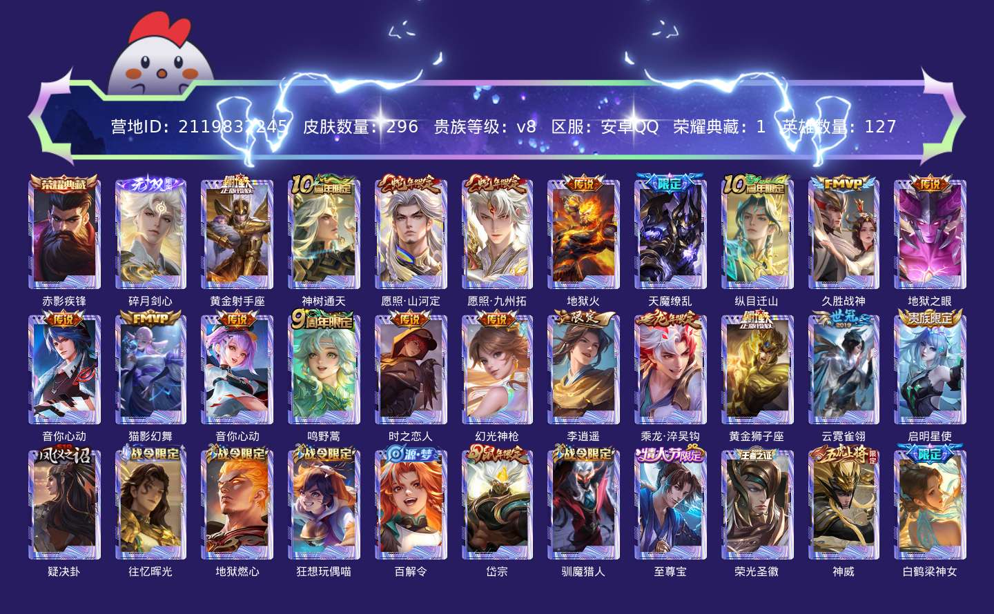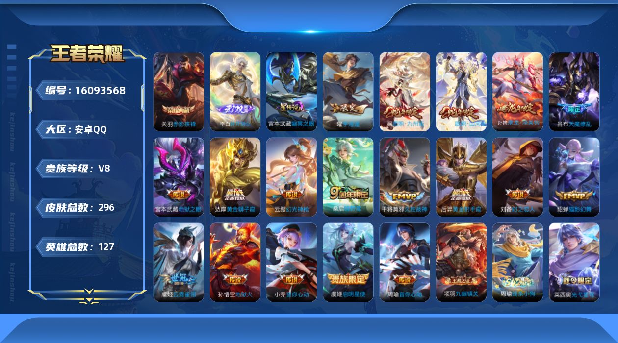 贵族等级:v8皮肤数:296传说品质20 荣耀典藏1 生肖限定6 情人节限定1 无双1 英雄数:127