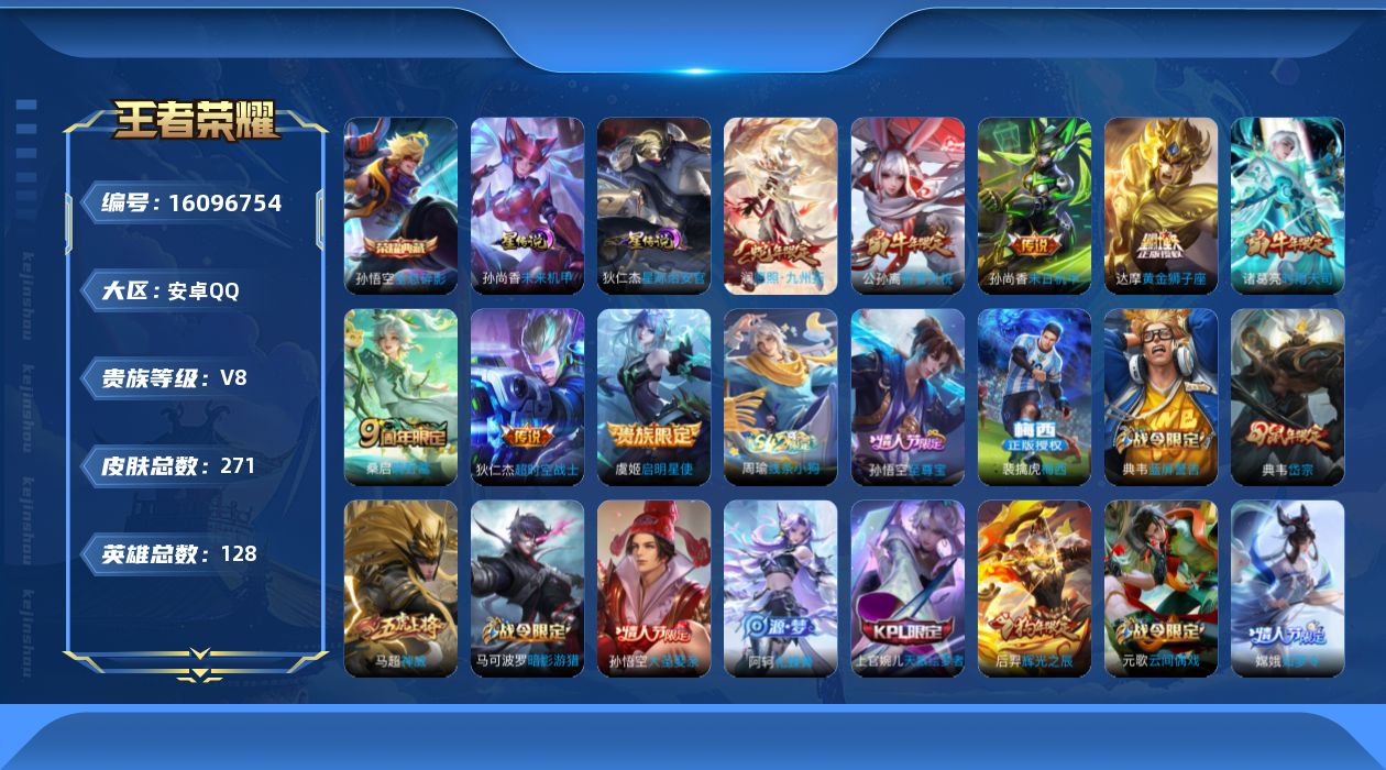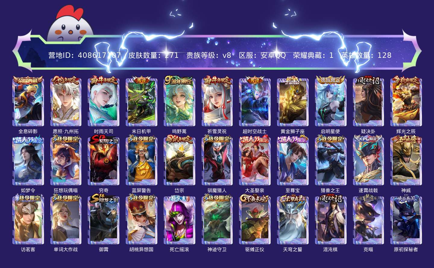 贵族等级:v8皮肤数:271生肖限定7 情人节限定4 传说品质8 荣耀典藏1 英雄数:128