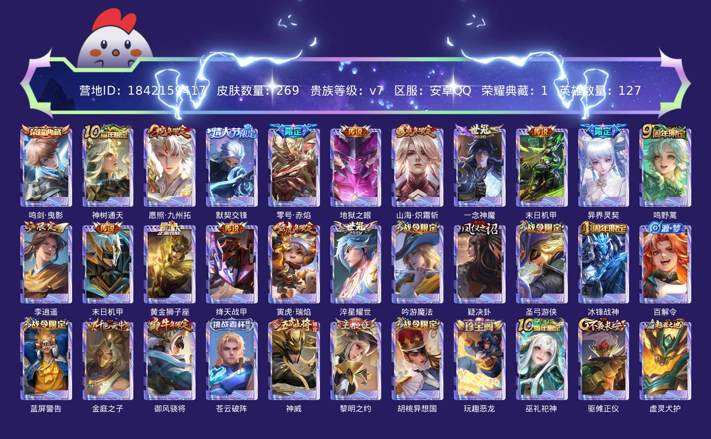 贵族等级:v7皮肤数:269传说品质16 生肖限定4 情人节限定2 荣耀典藏1 英雄数:127