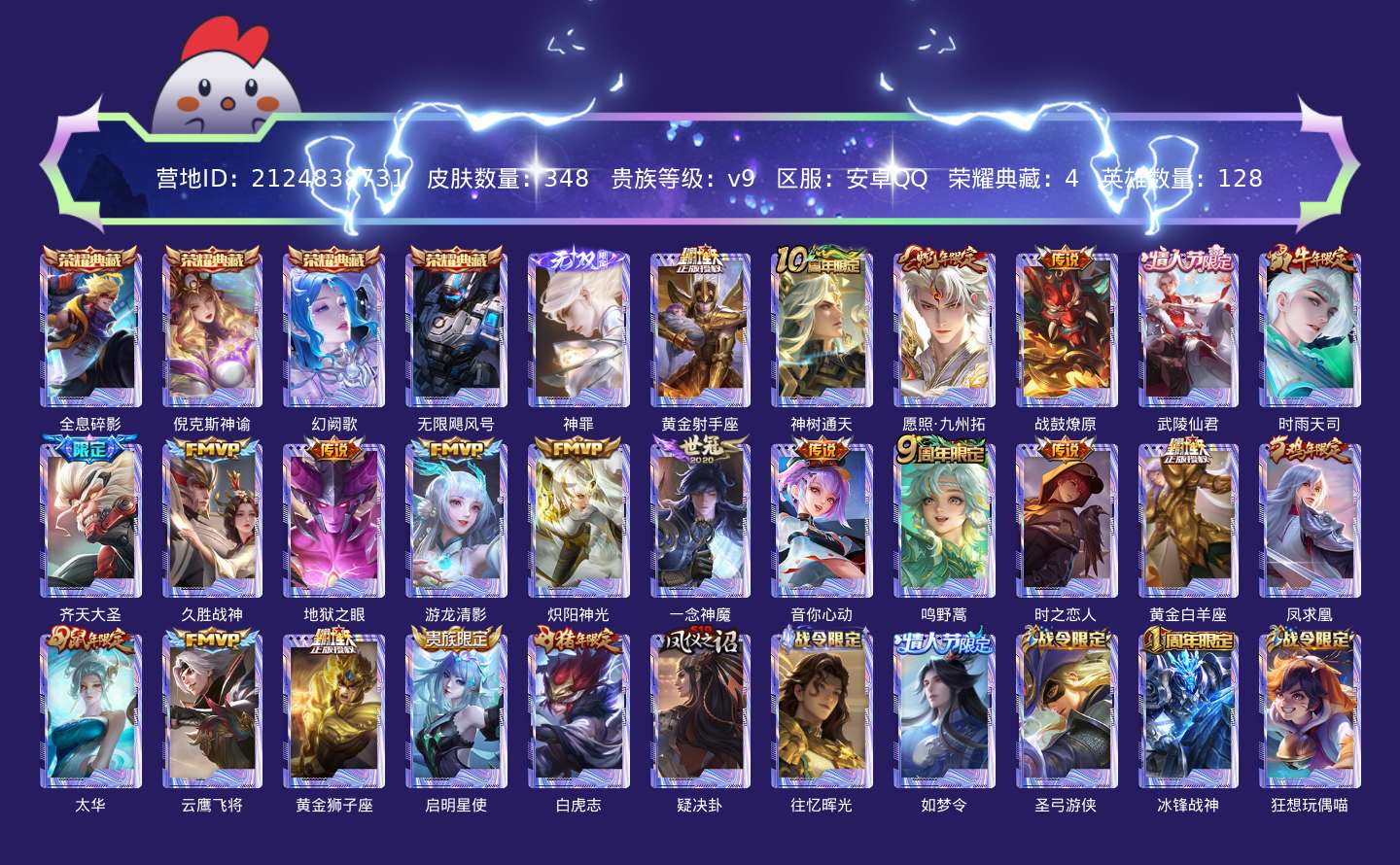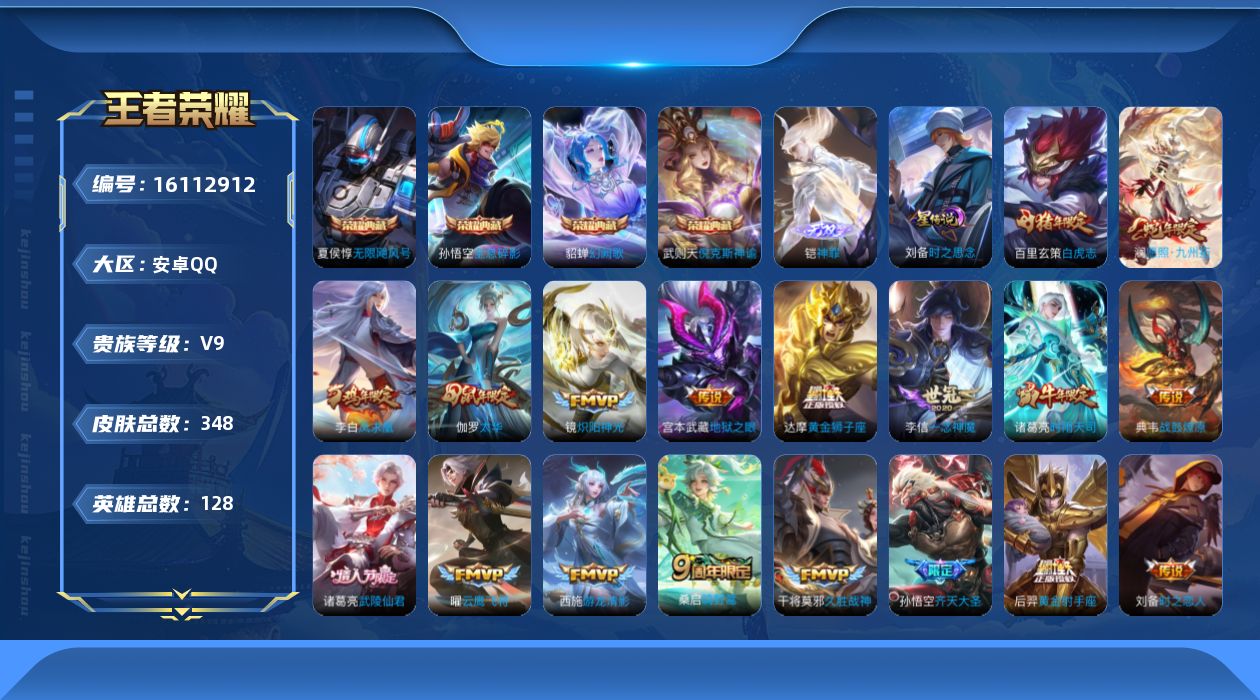 贵族等级:v9皮肤数:348传说品质22 情人节限定6 生肖限定9 荣耀典藏4 无双1 英雄数:128