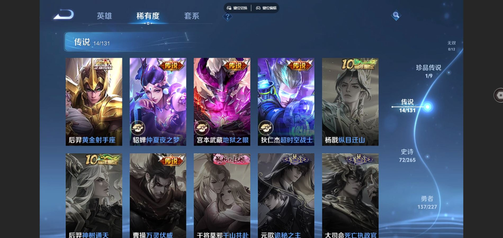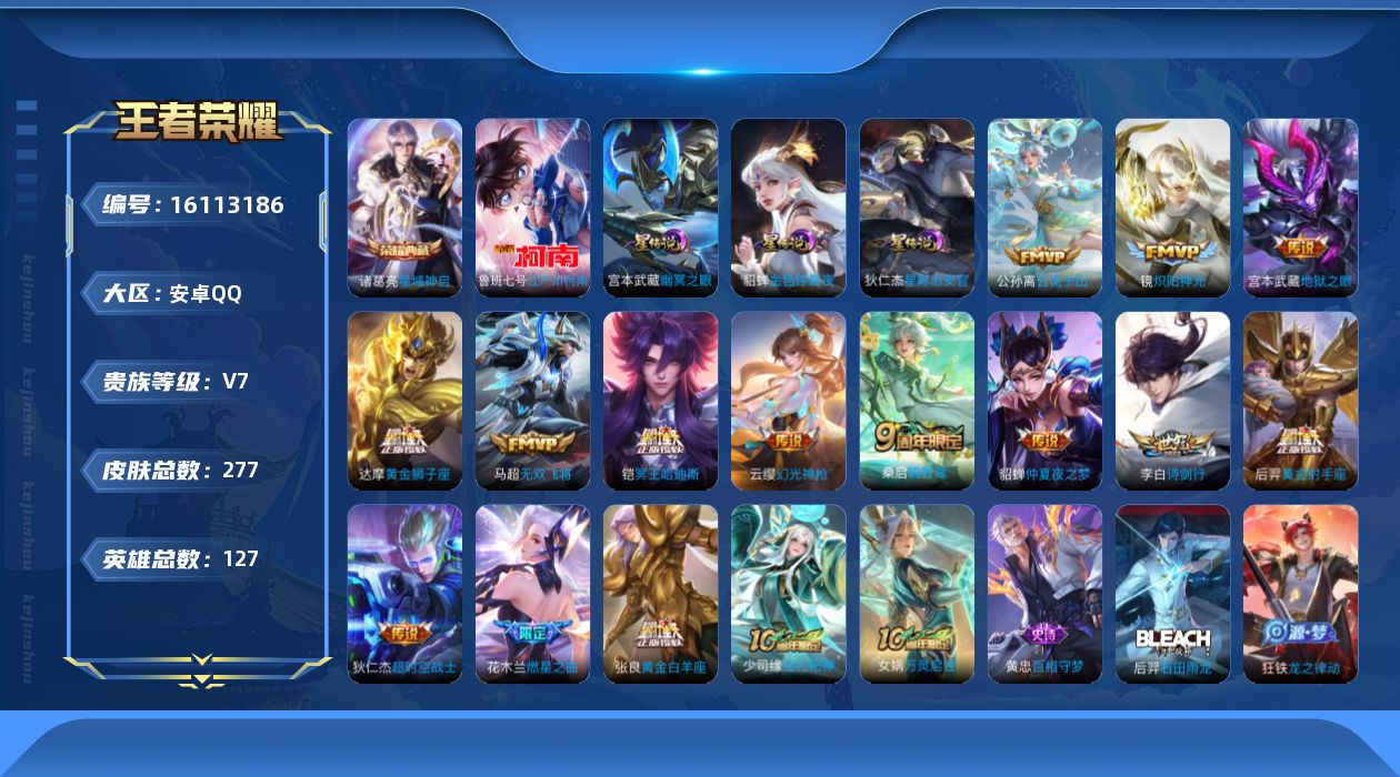 贵族等级:v7皮肤数:277传说品质14 荣耀典藏1 情人节限定1 生肖限定1 珍品传说1 英雄数:127