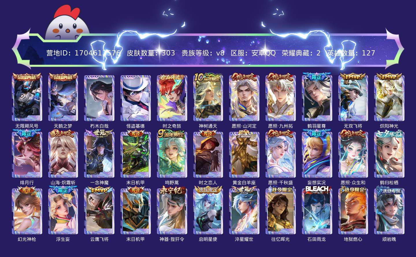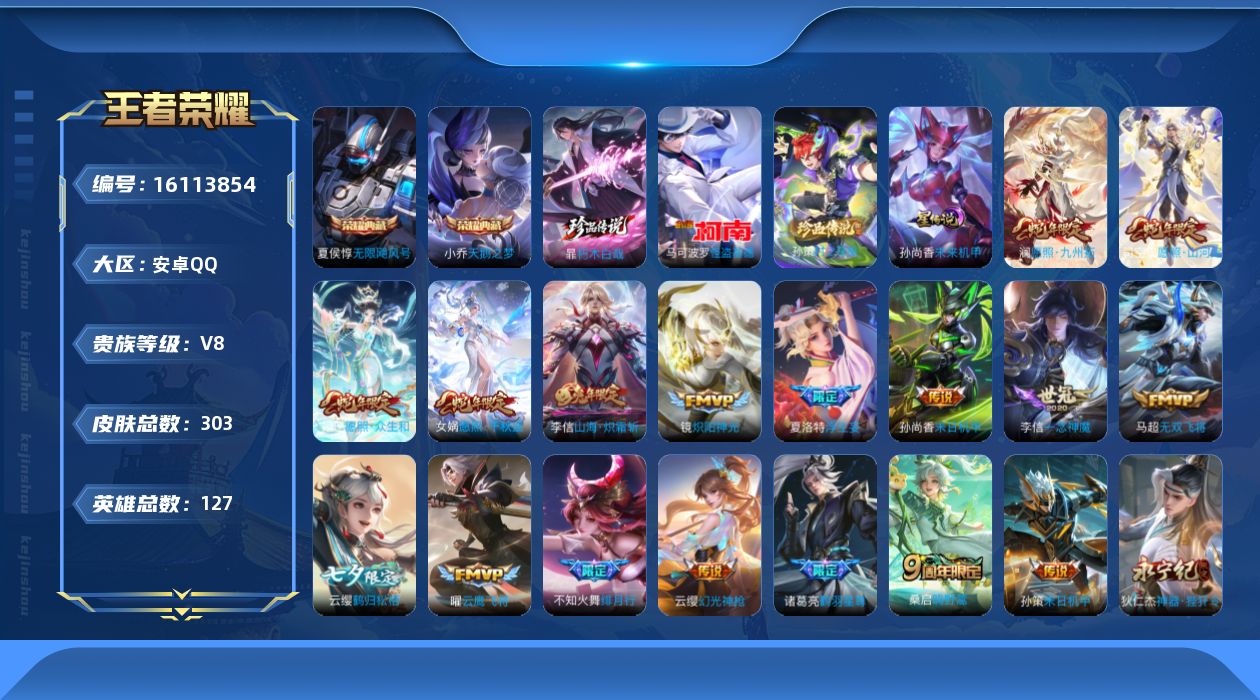 贵族等级:v8皮肤数:303传说品质24 生肖限定5 珍品传说3 荣耀典藏2 英雄数:127