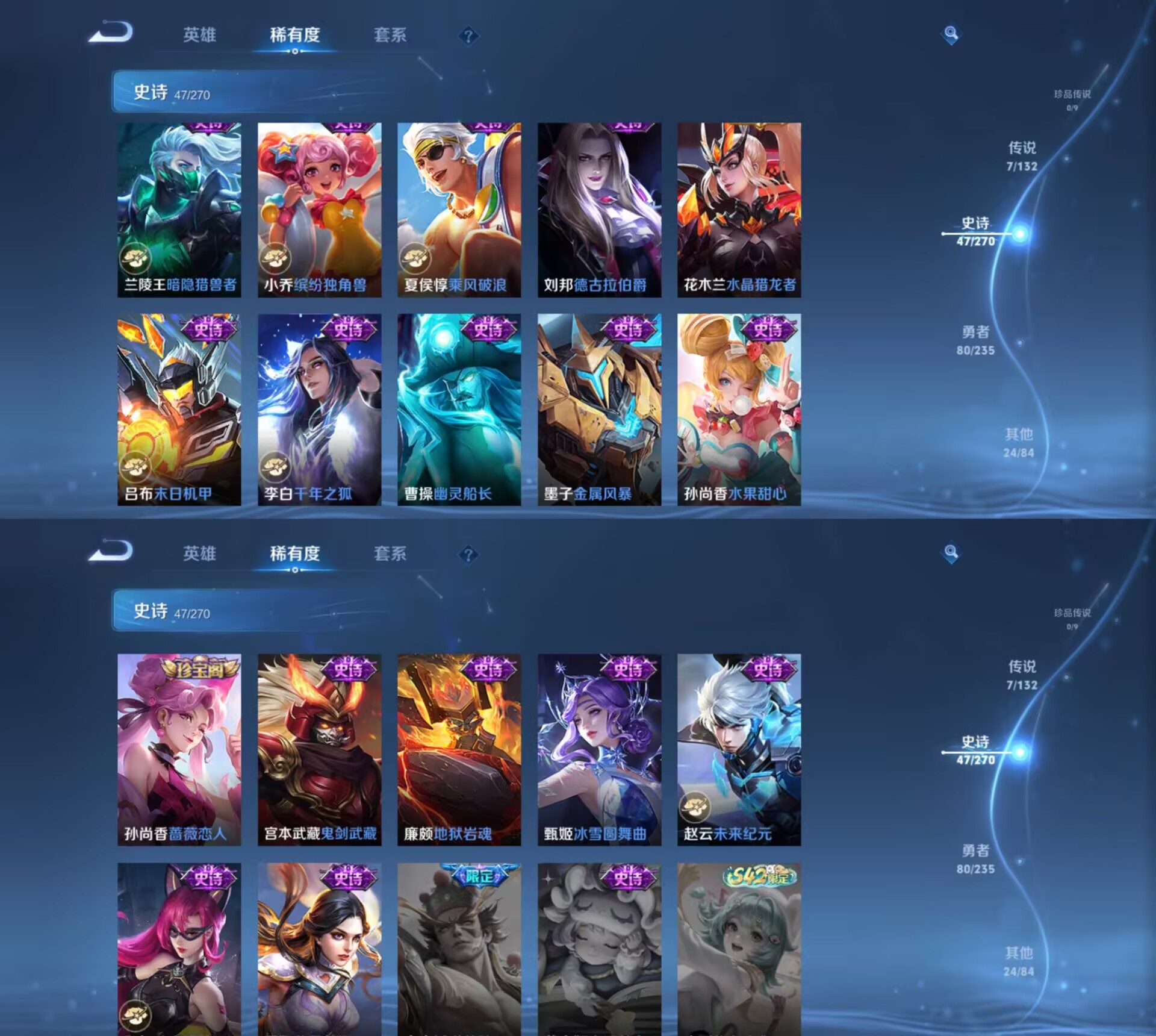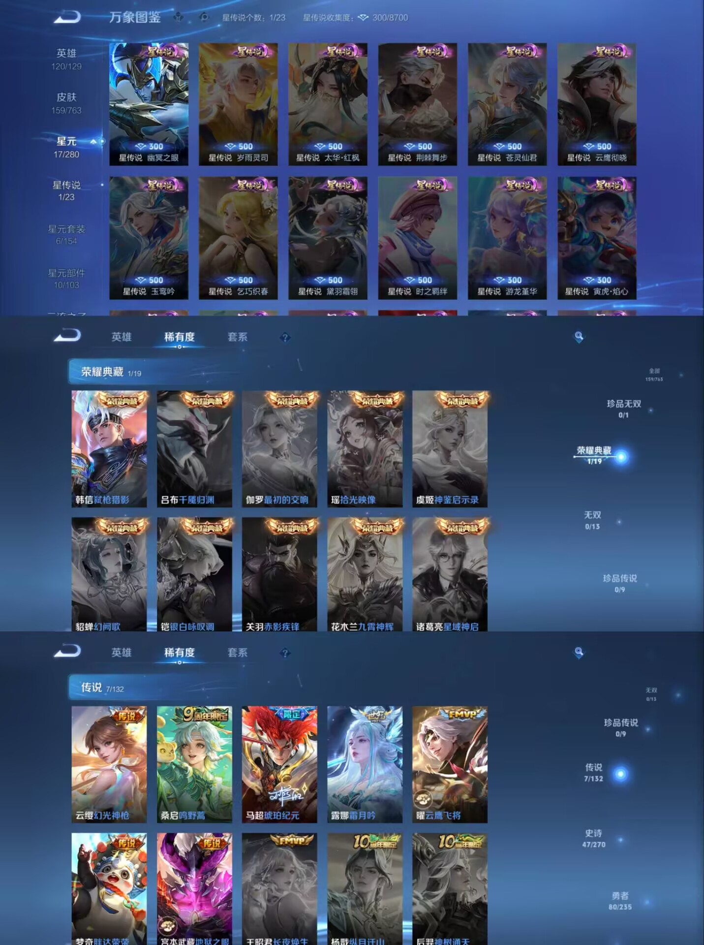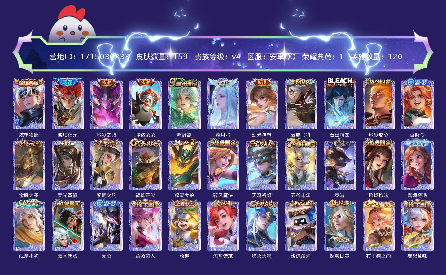 贵族等级:v4皮肤数:159传说品质7 荣耀典藏1 英雄数:120