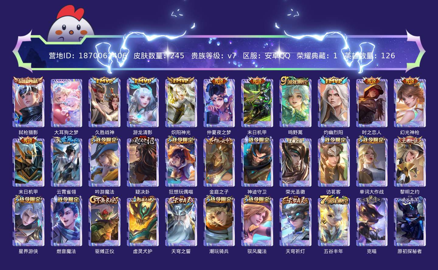 贵族等级:v7皮肤数:245传说品质11 生肖限定1 情人节限定1 珍品传说1 荣耀典藏1 英雄数:126