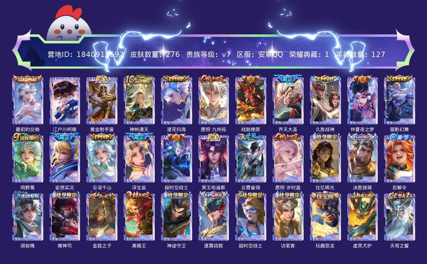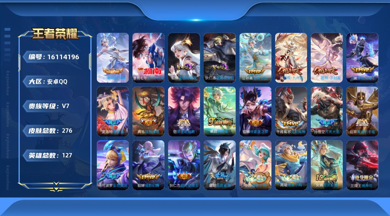 贵族等级:v7皮肤数:276传说品质17 生肖限定4 荣耀典藏1 珍品传说1 英雄数:127