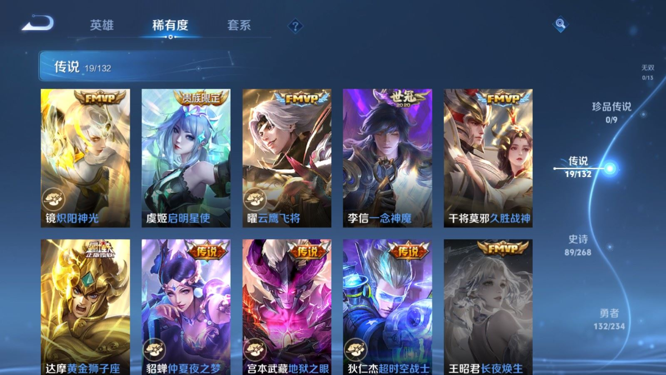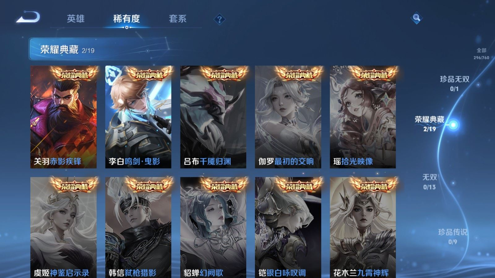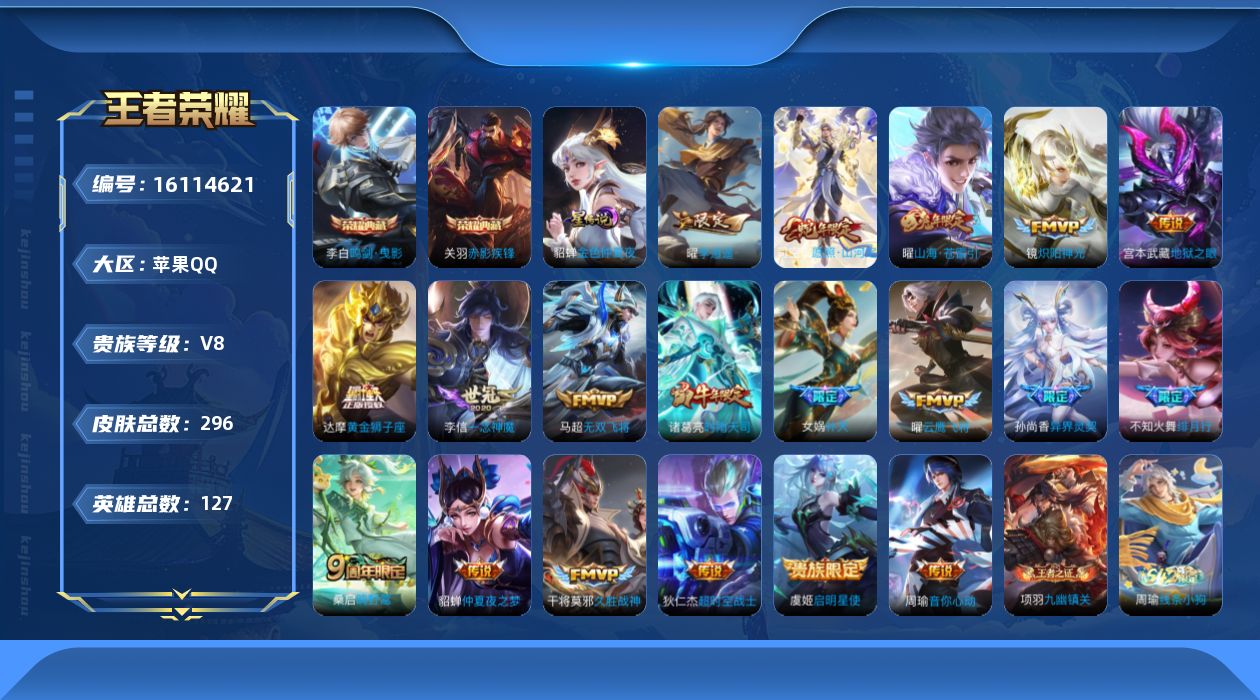 贵族等级:v8皮肤数:296荣耀典藏2 传说品质19 生肖限定5 情人节限定2 英雄数:127