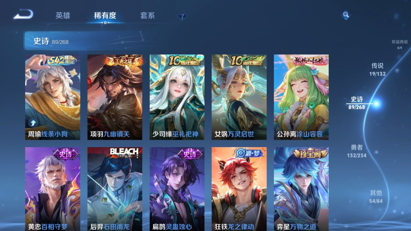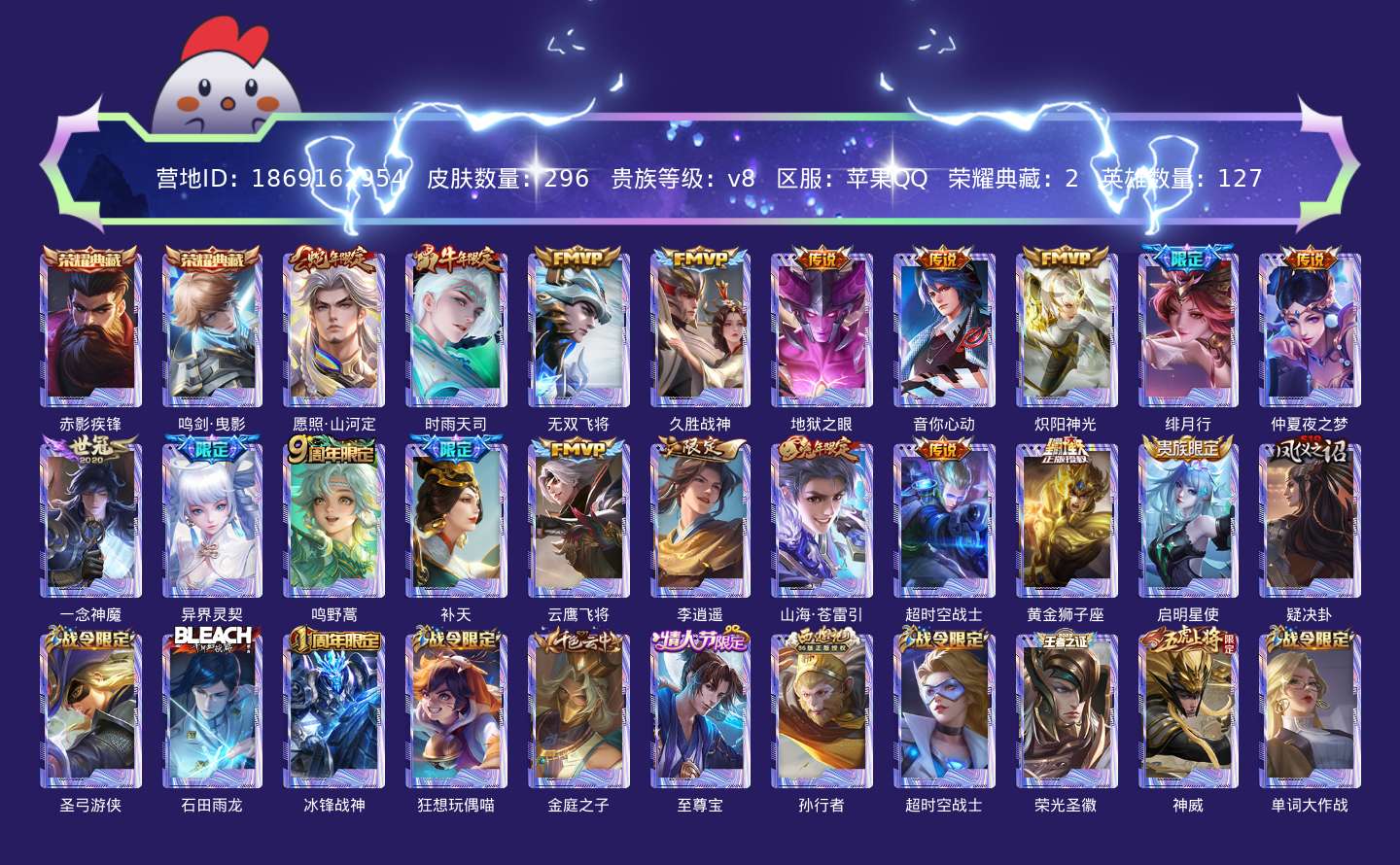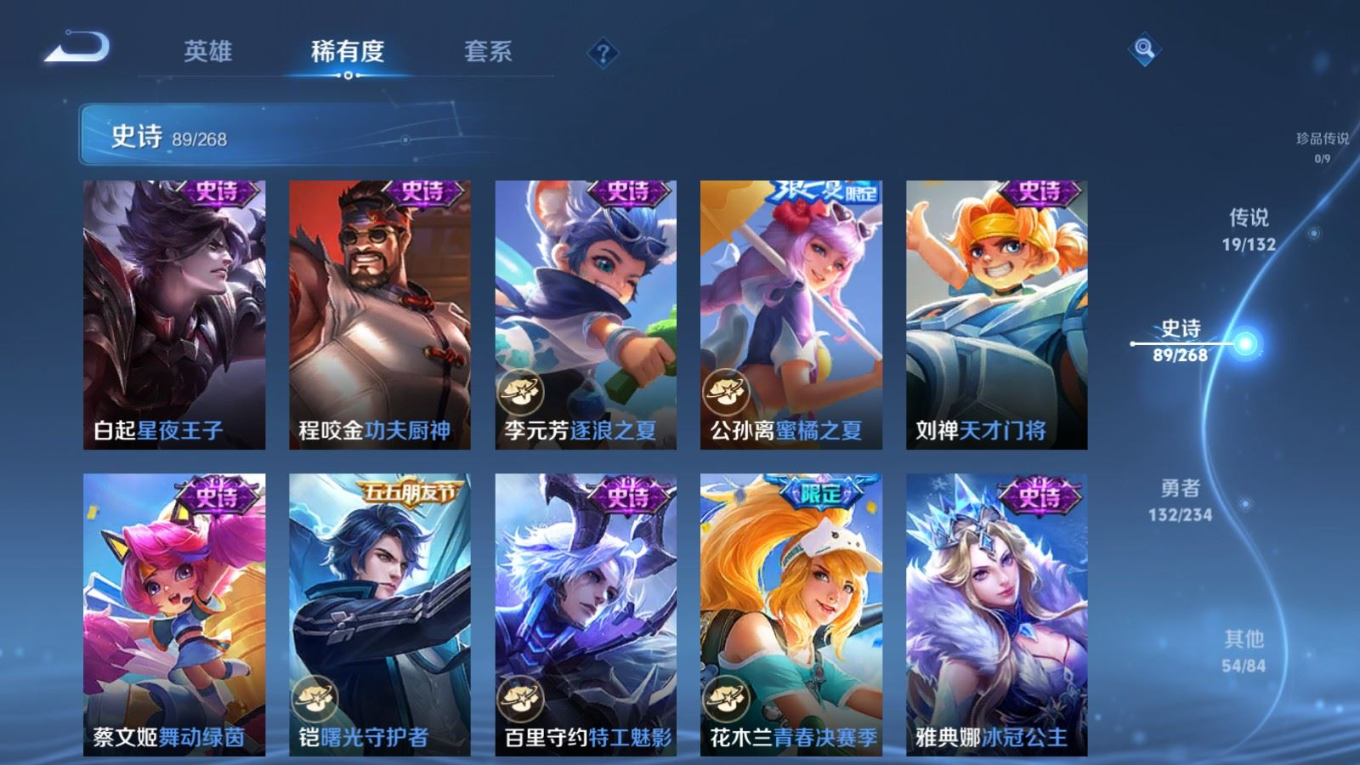 贵族等级:v8皮肤数:296荣耀典藏2 传说品质19 生肖限定5 情人节限定2 英雄数:127