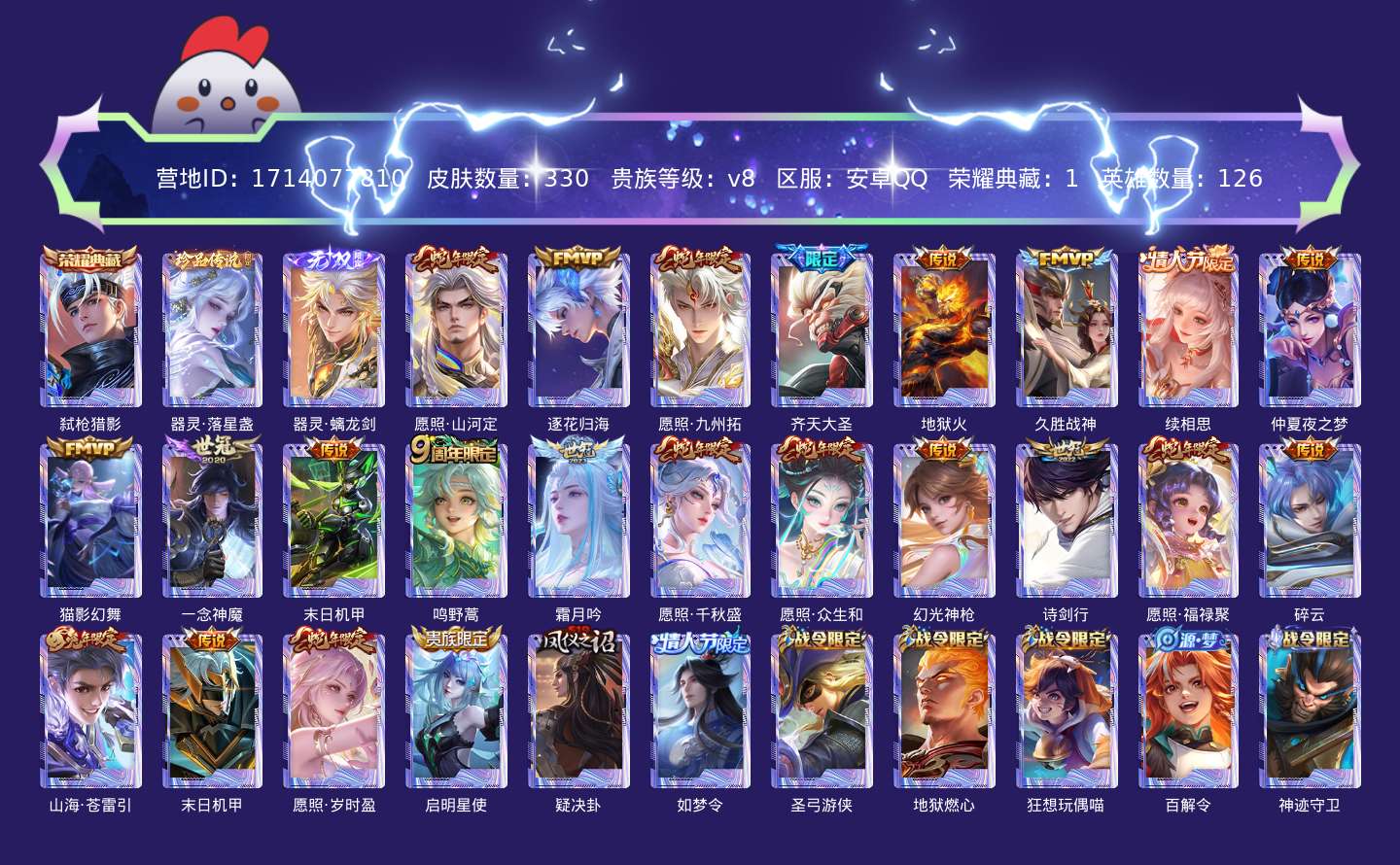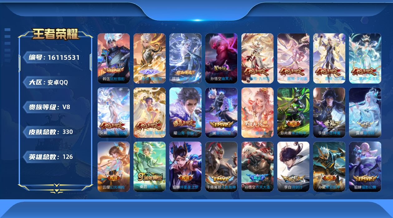 贵族等级:v8皮肤数:330情人节限定2 传说品质23 生肖限定9 珍品传说1 无双1 荣耀典藏1 英雄数:126