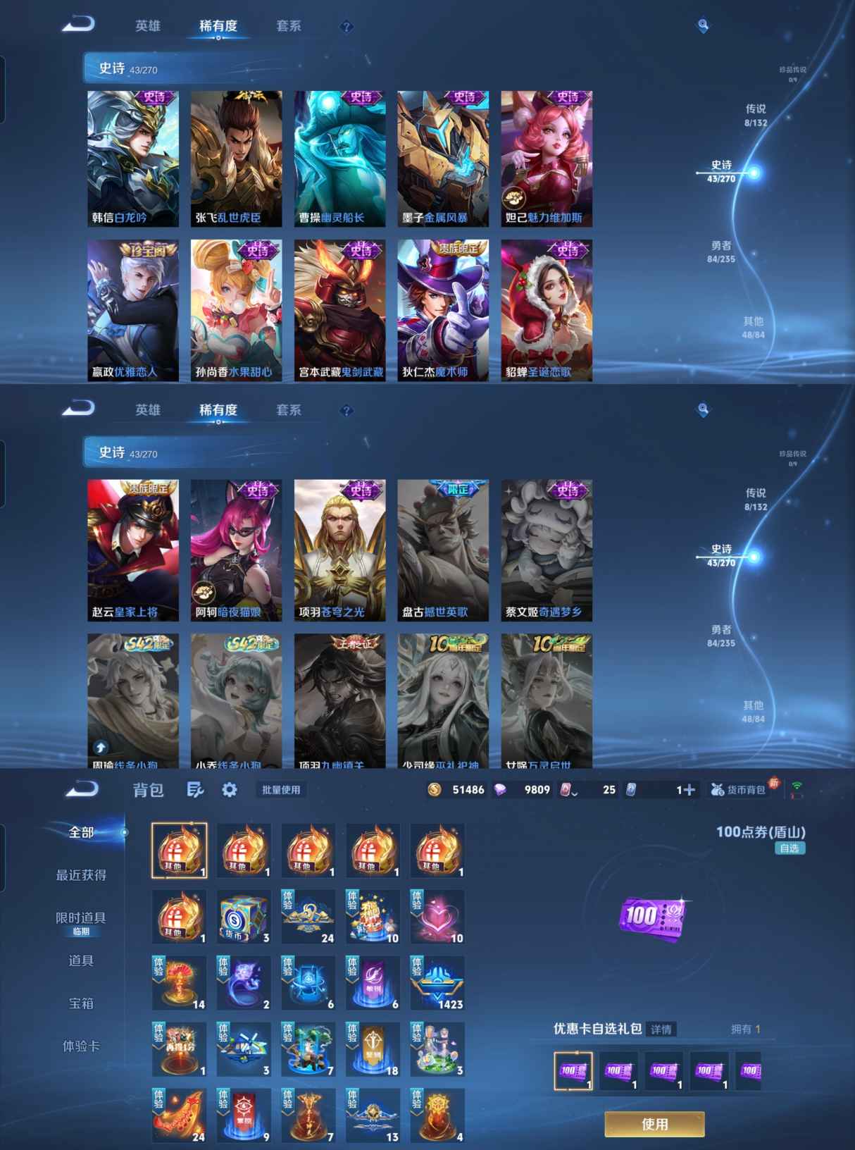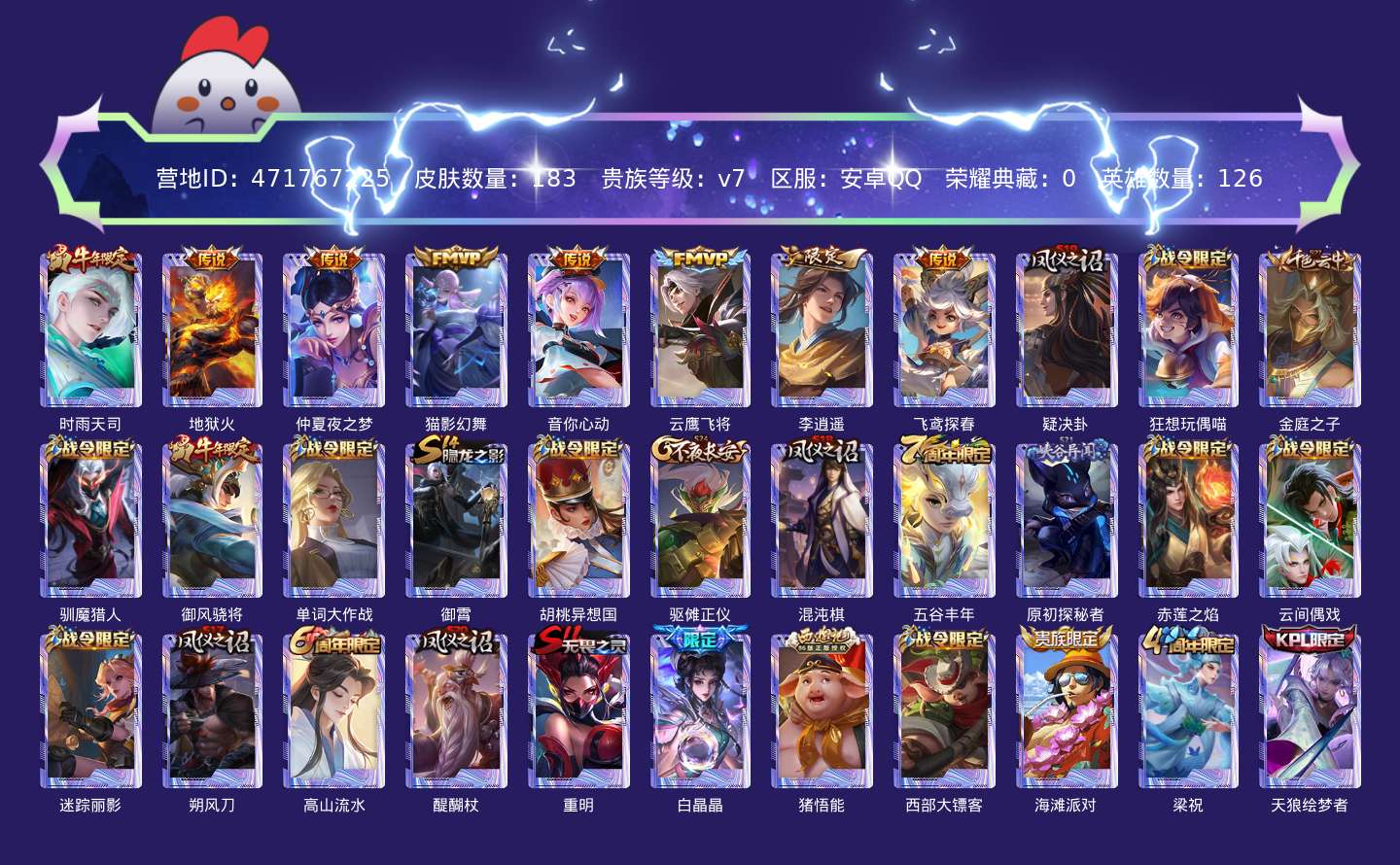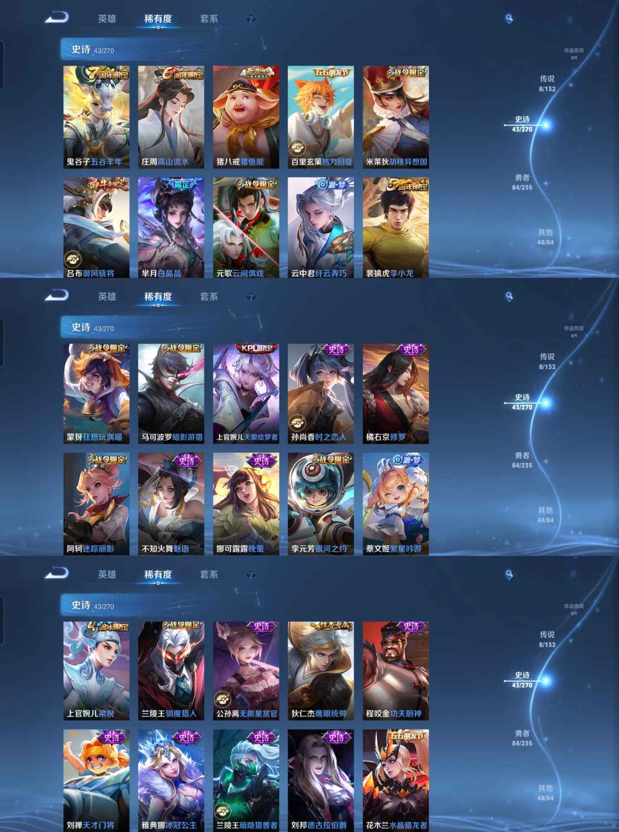 贵族等级:v7皮肤数:183传说品质8 生肖限定2 英雄数:126