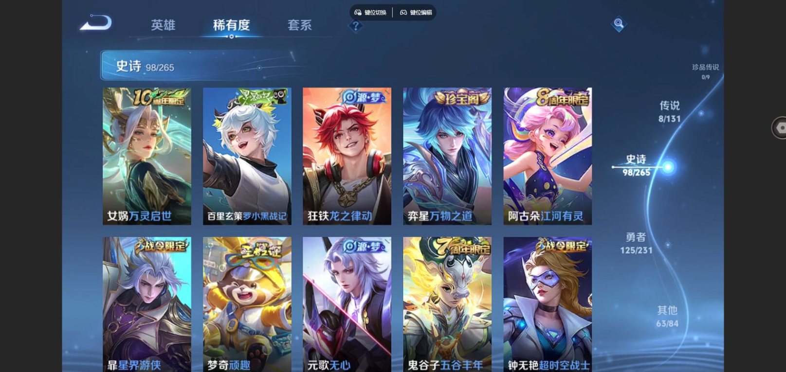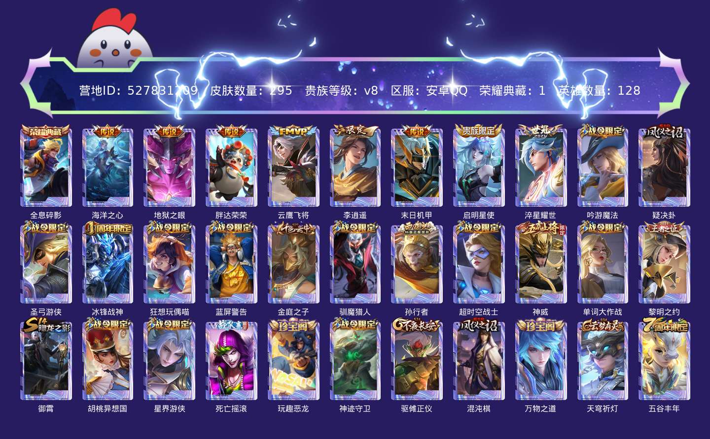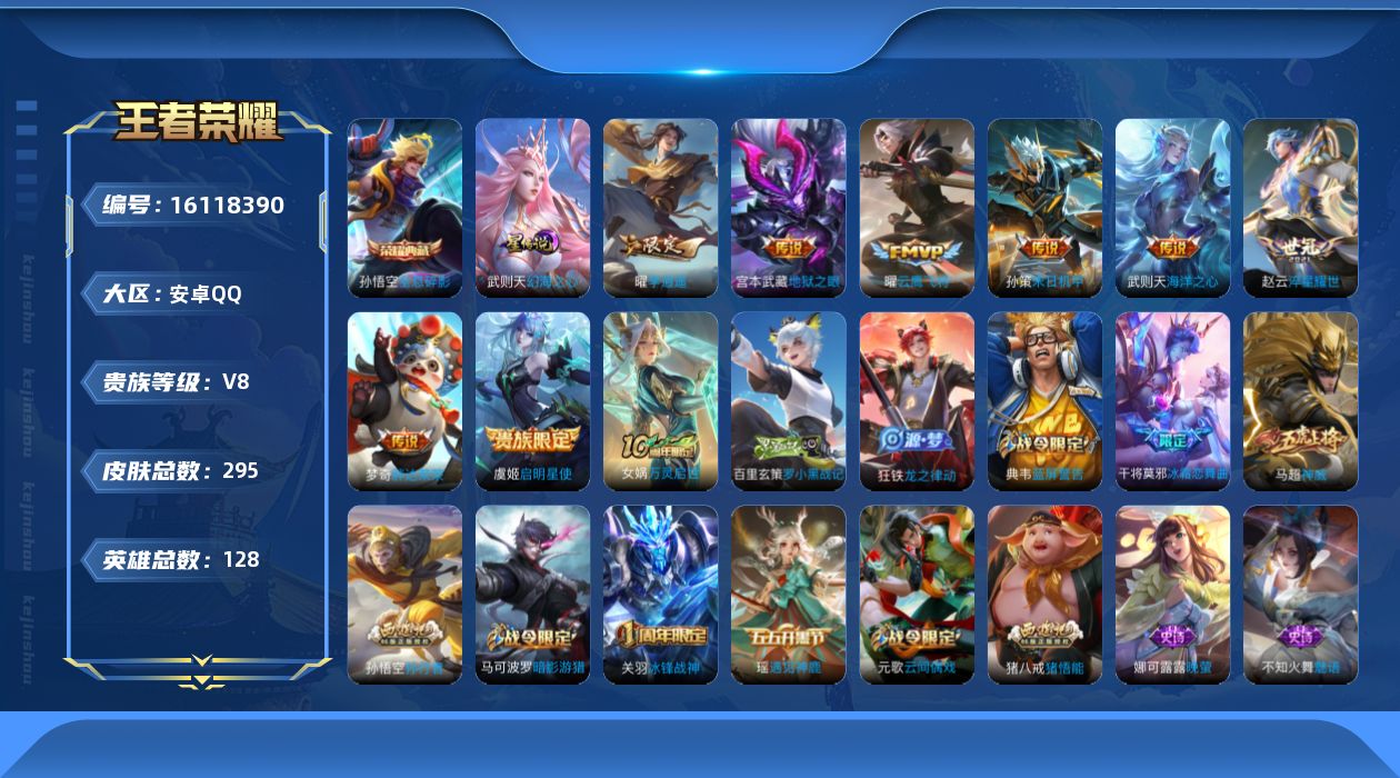 贵族等级:v8皮肤数:295荣耀典藏1 传说品质8 情人节限定1 生肖限定1 英雄数:128