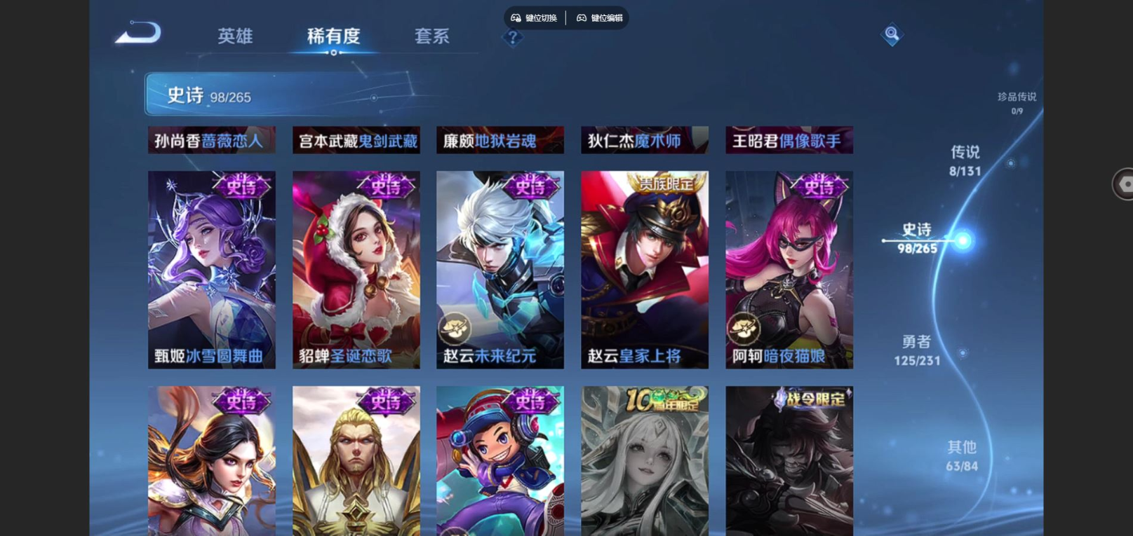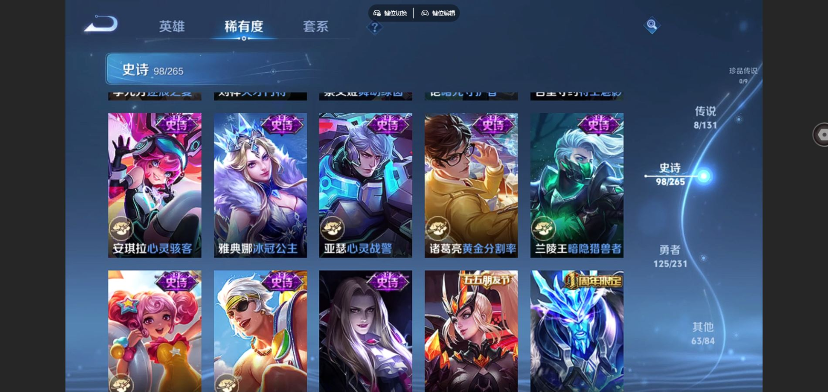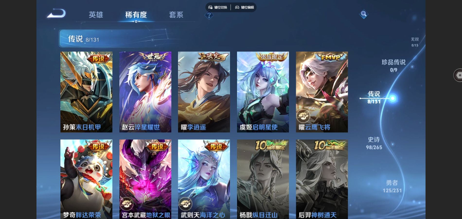贵族等级:v8皮肤数:295荣耀典藏1 传说品质8 情人节限定1 生肖限定1 英雄数:128